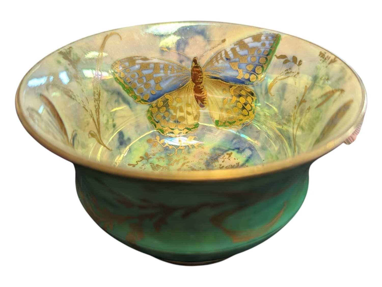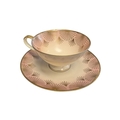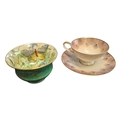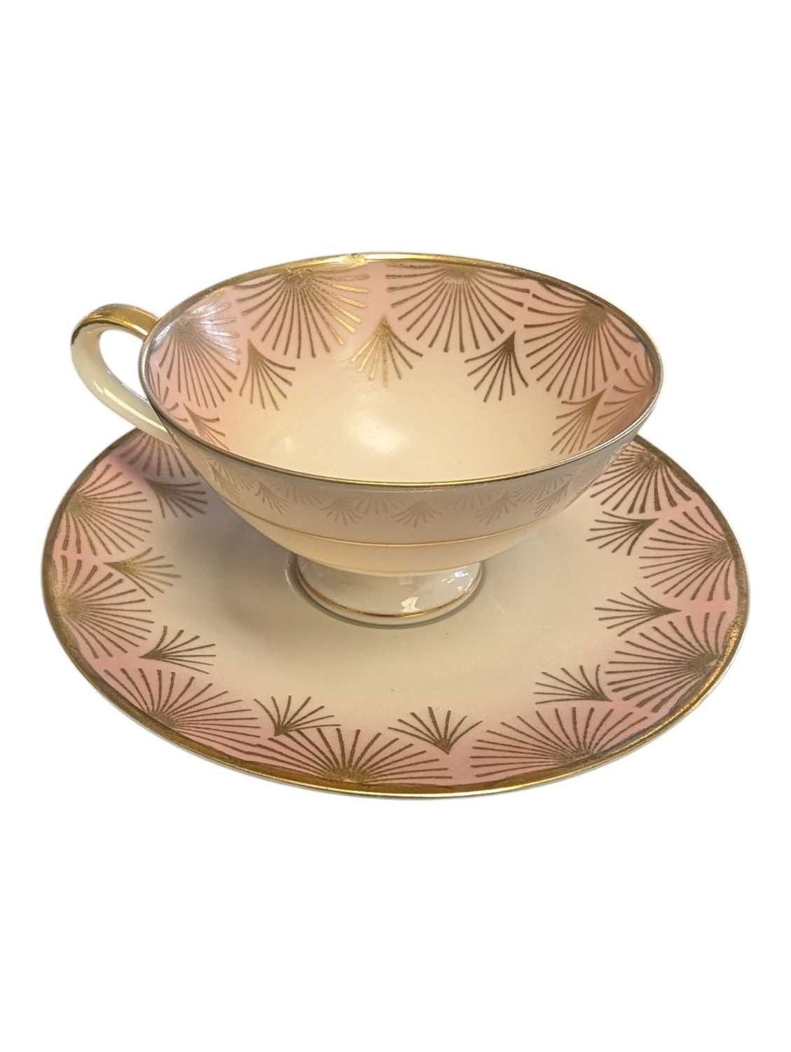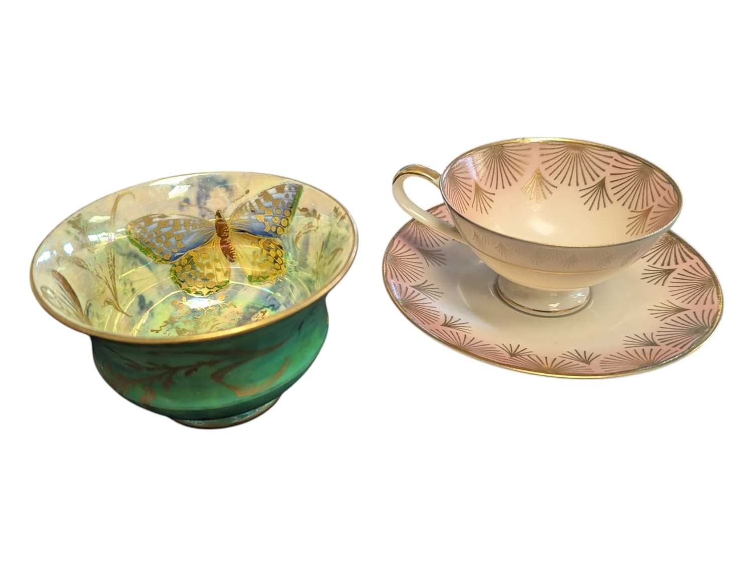 An Aynsley 1920s lustre butterfly china bowl and a German KPM art deco china teacup and saucer in a blush pink and gilt colourway. Maker's marks to the bases. Bowl measuring approx. 5.5cm x 9cm x 9cm.