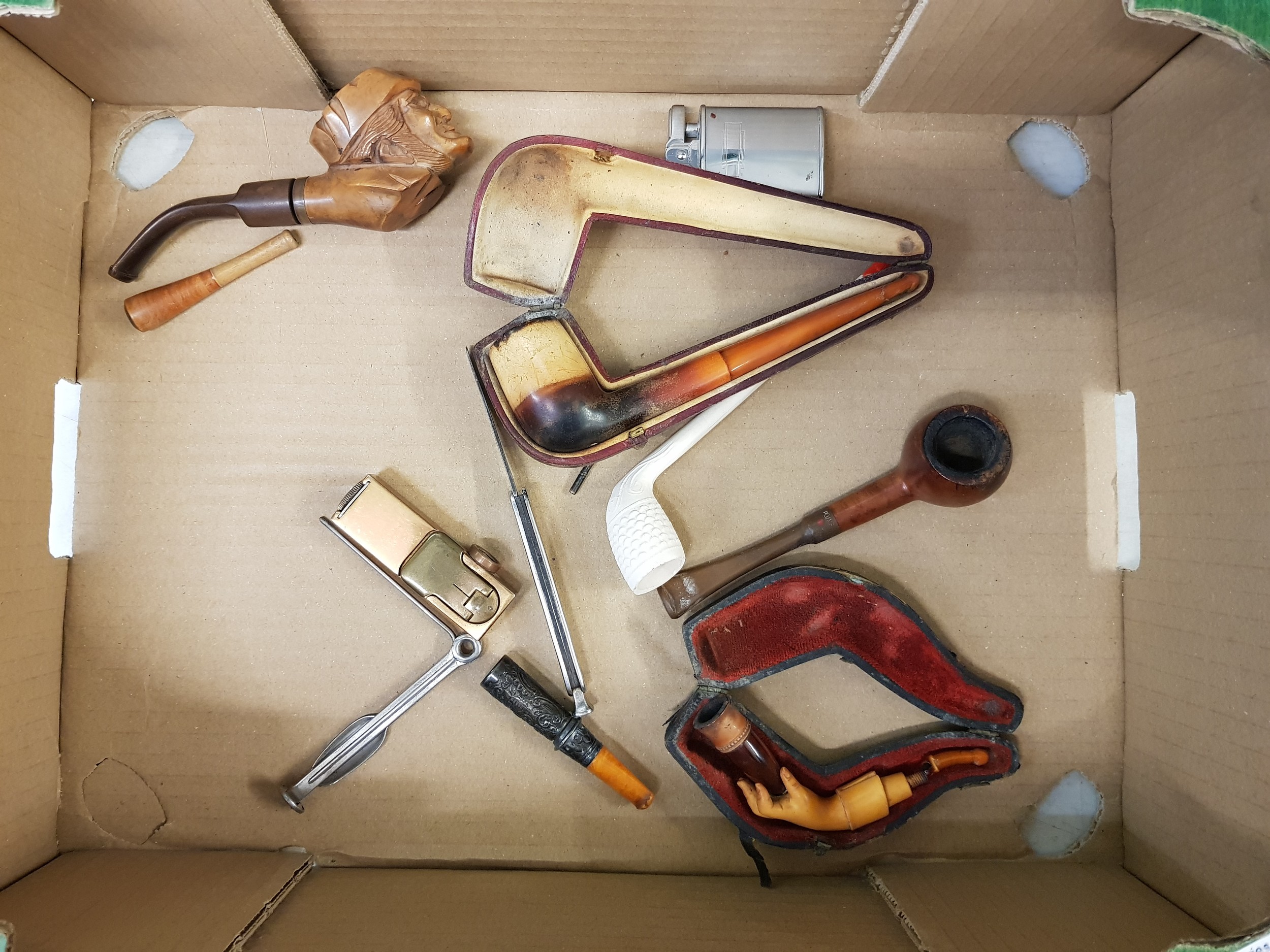 Collection of vintage smoking accessories to include pipes, silver and amber cigarette holder, pipe cleaning tools, lighters etc.