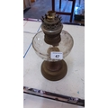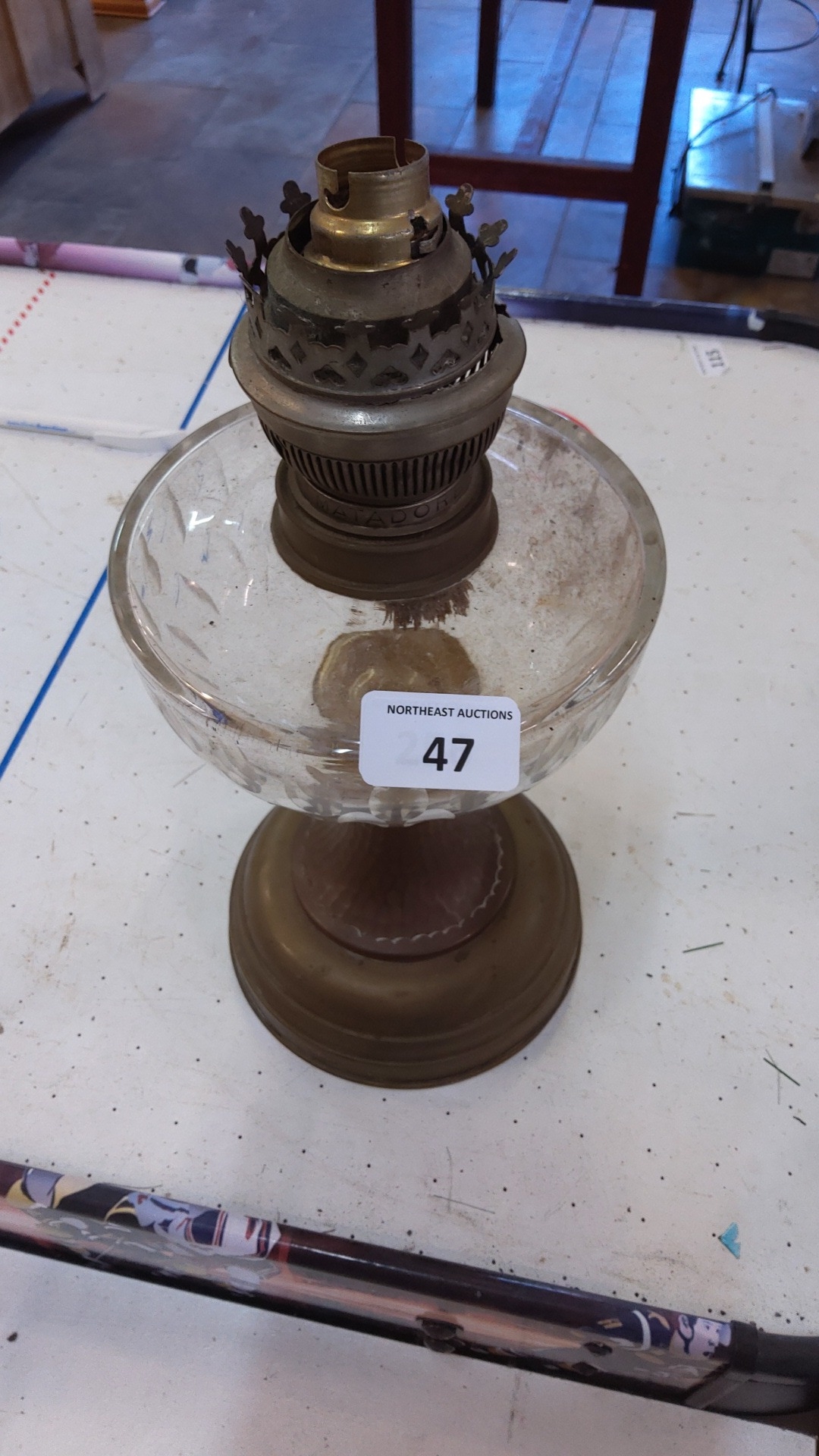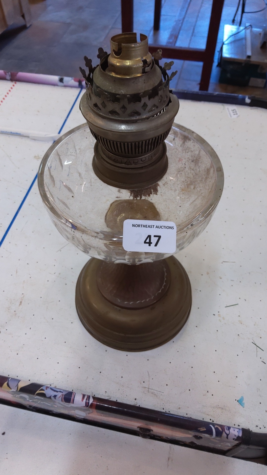 A glass oil lamp font on circular brass-effect base, fitted a brass burner with pierced gallery and turned collar, marked 'MATADOR'.