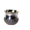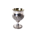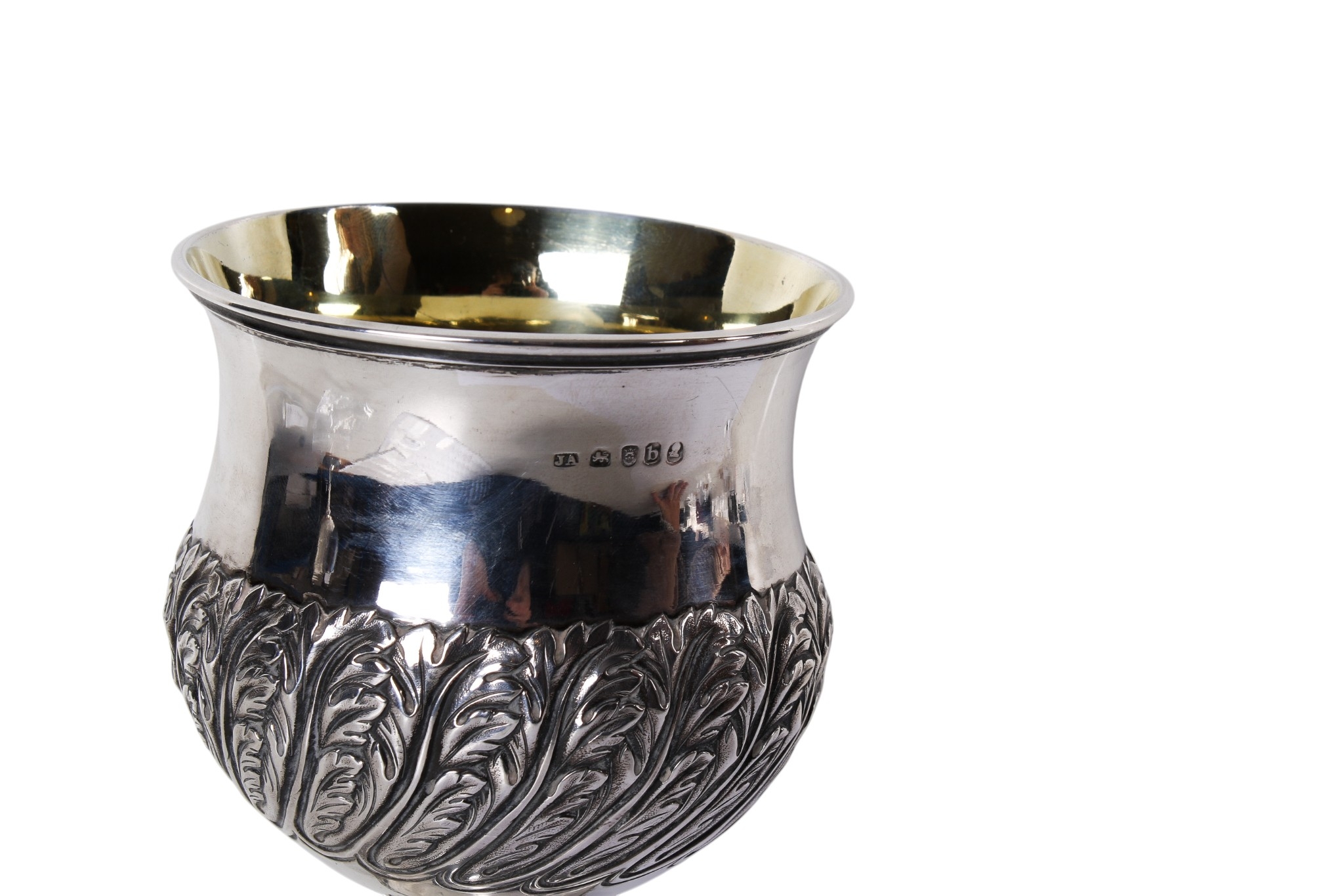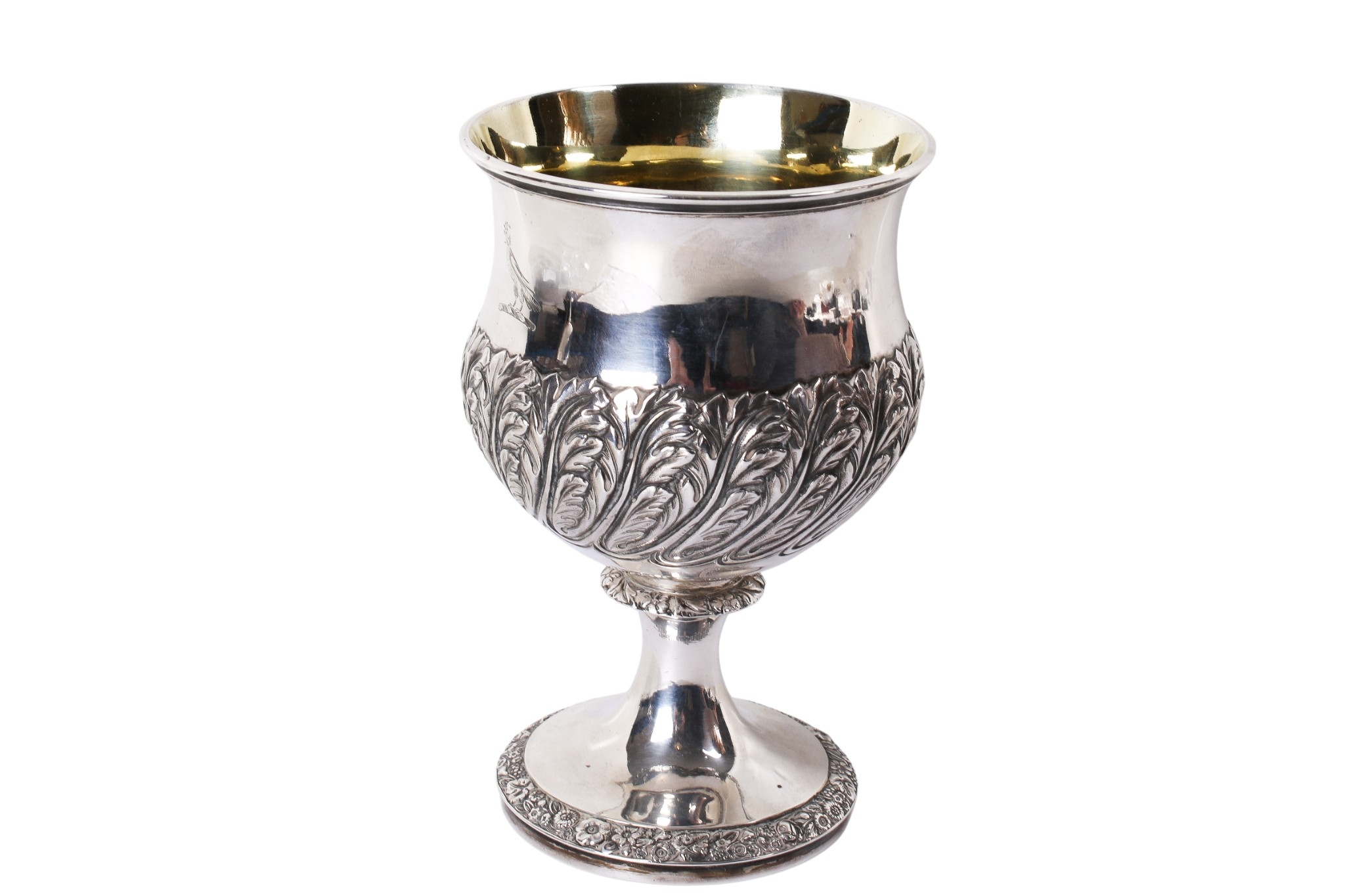 A George III silver goblet. The bulbous body with a repoussé band of oak leaves, over a spread foot decorated with a border of flowers and leaves. Gilt to the inside. Hallmarks for Joseph Angell I, London 1817. H15cm, weight 254.3g.