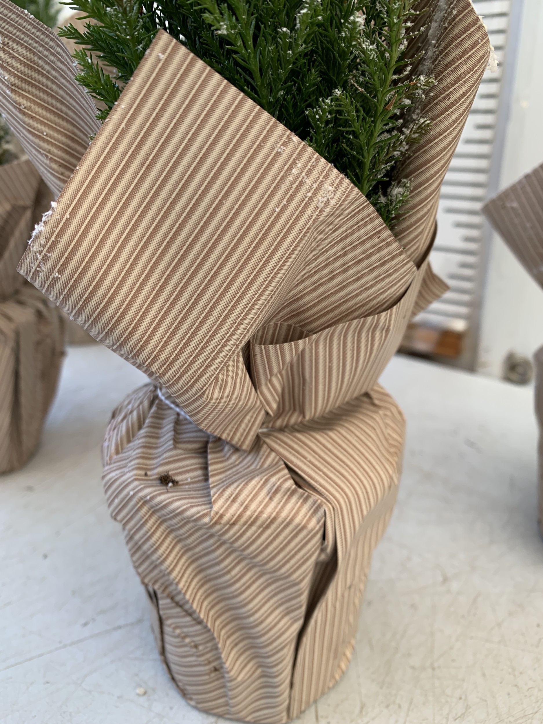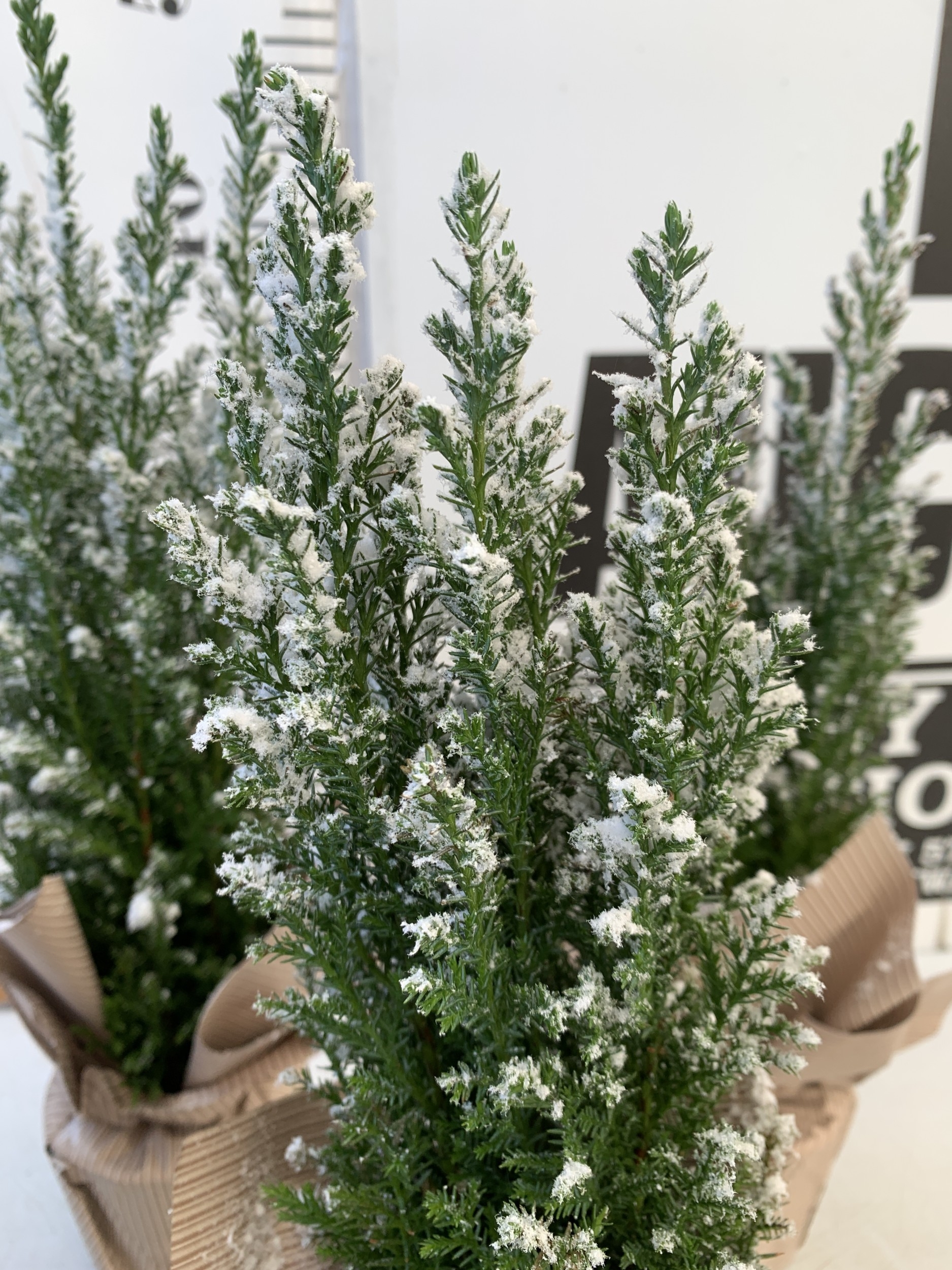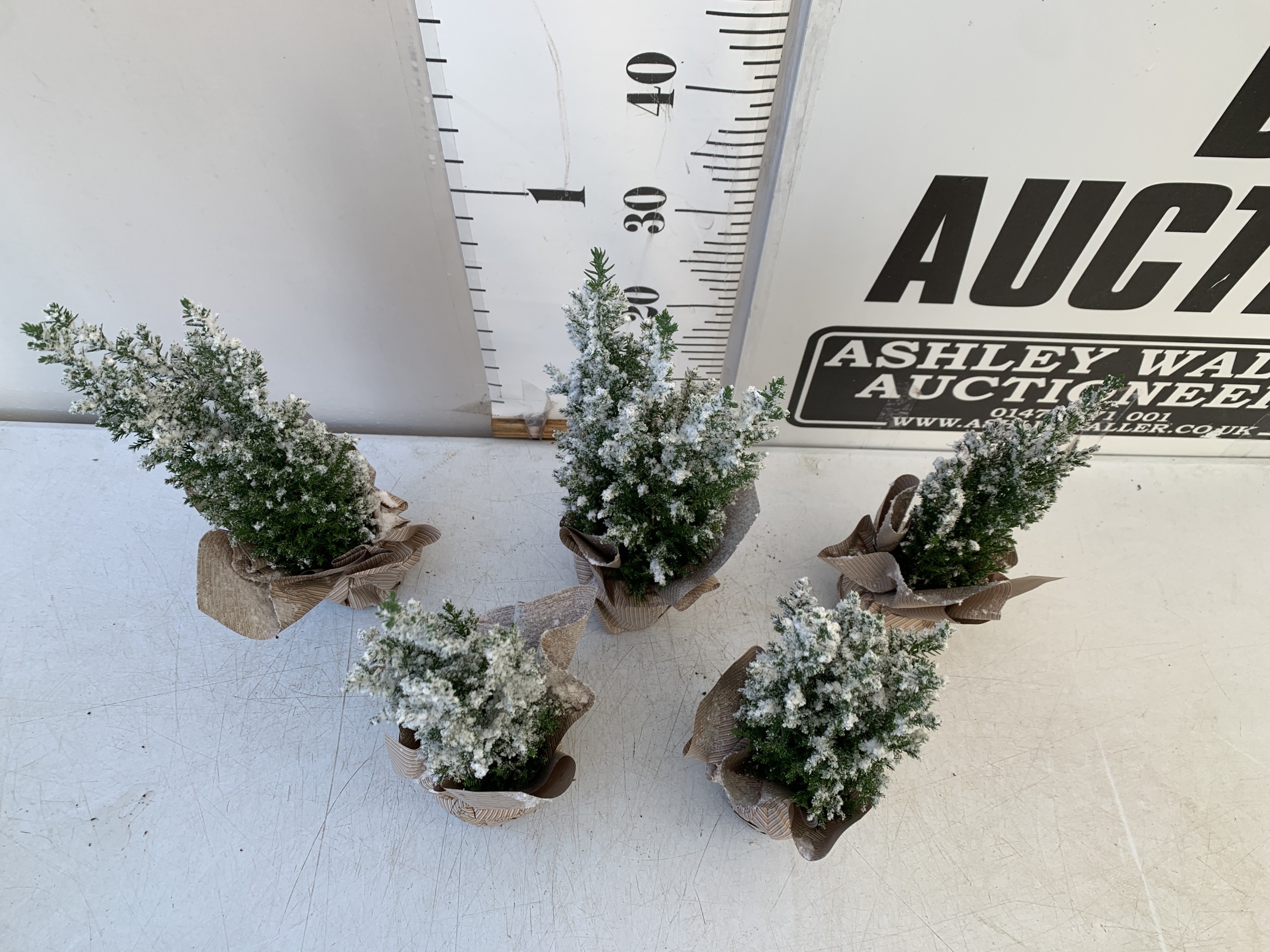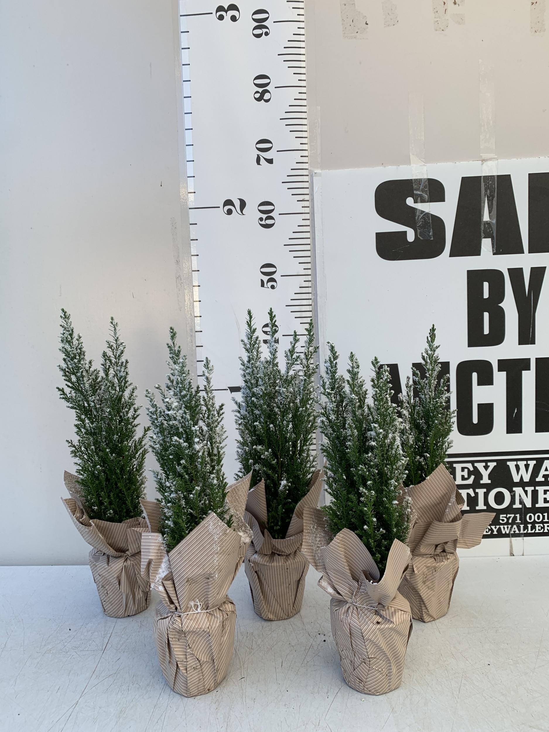 FIVE CHRISTMAS MINIATURE CONIFERS CAMAECYPARIS WITH 'SNOW' IN GIFT WRAPPED POTS. APPROX 40-50CM TALL. TO BE SOLD FOR THE FIVE