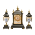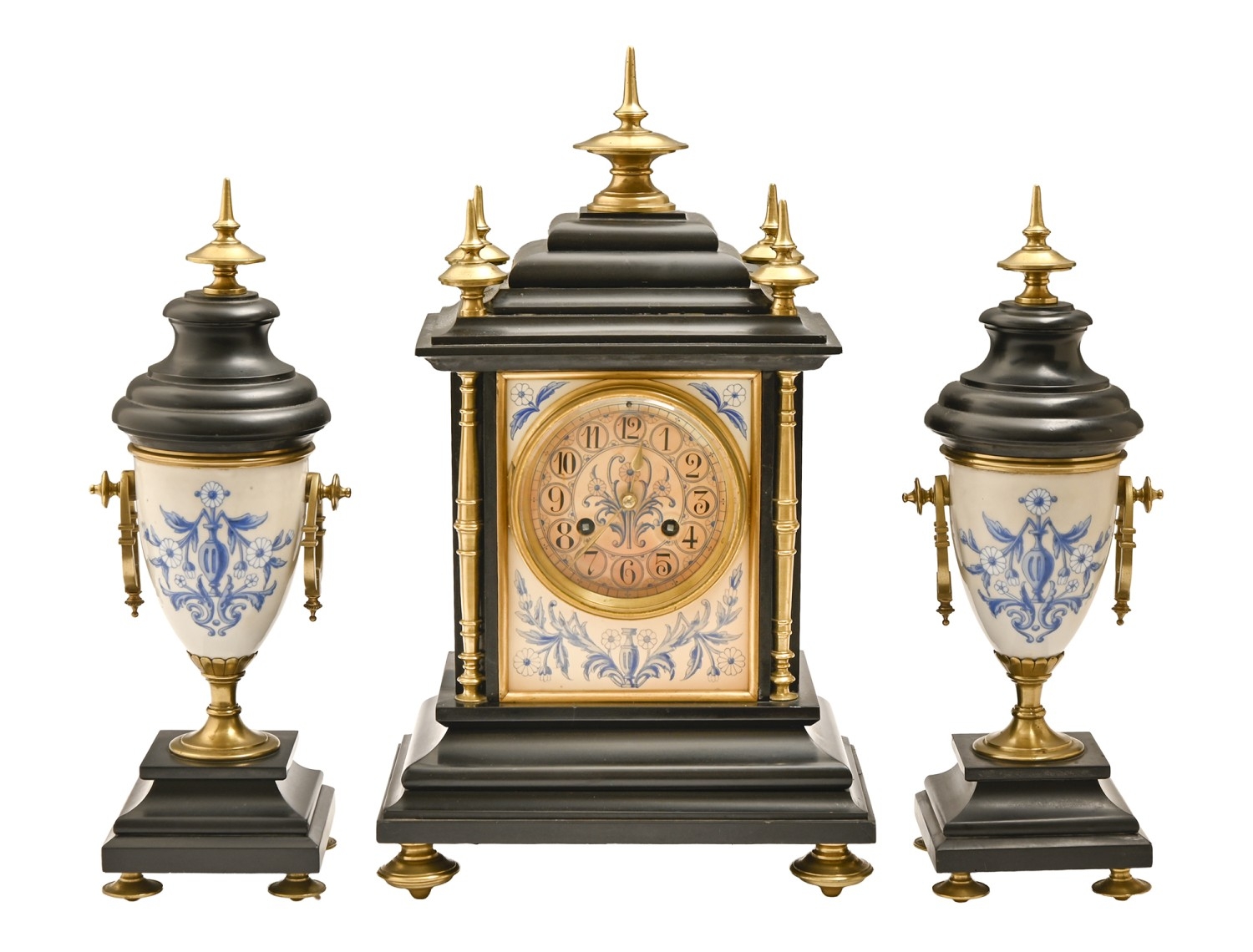 A French brass mounted slate clock garniture, late 19th c, the porcelain enamelled with blue flower vases, on four feet, pendulum and key, clock 43 x 25cm