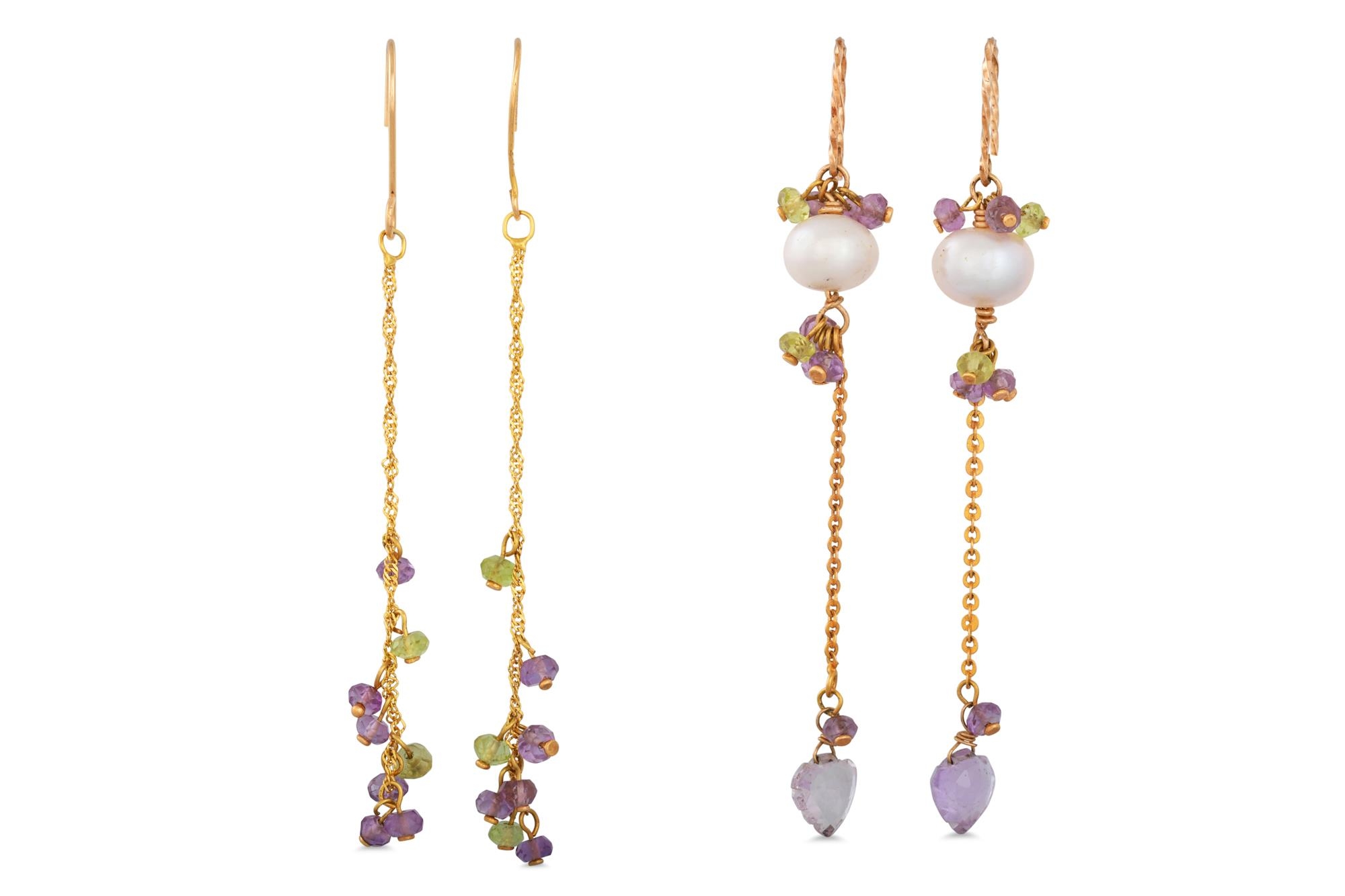 TWO PAIRS OF 9CT YELLOW GOLD DROP EARRINGS, suspending various amethyst and green quartz beads, one set with pearls