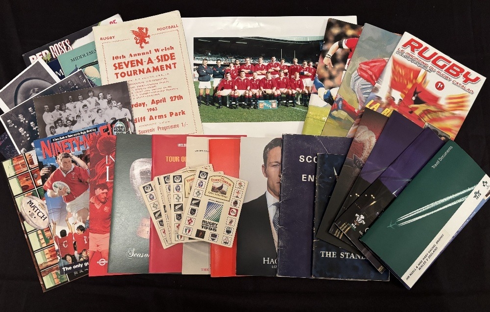 Rugby Pot-Pourri (Qty): Scotland v England 1871 Centenary Souvenir Booklet, plus Scottish ‘Raise the Standard’ brochure; J Wilkinson Hackett publicity brochure; WRU Memoranda Booklet; WRU National Ground Development; Catalan Rugby magazine; Sian Blake Rugby Art ad; WRU Media Guide, Autumn 2009; town of Rugby publicity flier; Welsh Schools 18 group Australian Tour 1994; set of Famous Grouse RWC 1995 drinks coasters; K Jarrett Benefit Dinner 1982; Phil Bennett Foundation Lions’ Dinner 1974-2024; RWC 99 Fan’s Guide; Irish RFU Xmas card; colour glossy, Wales in France 1997; six assorted old rugby photos; three VIP invites and passes in WRU folders and one Niall Brophy similar IRFU pack; plus 20+ assorted match tickets and programmes from the 1951 and 54 Middlesex 7s, the 1963 Snelling Sevens and the England Women’s ‘Red Roses’ v France, 2023. G/VG
