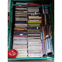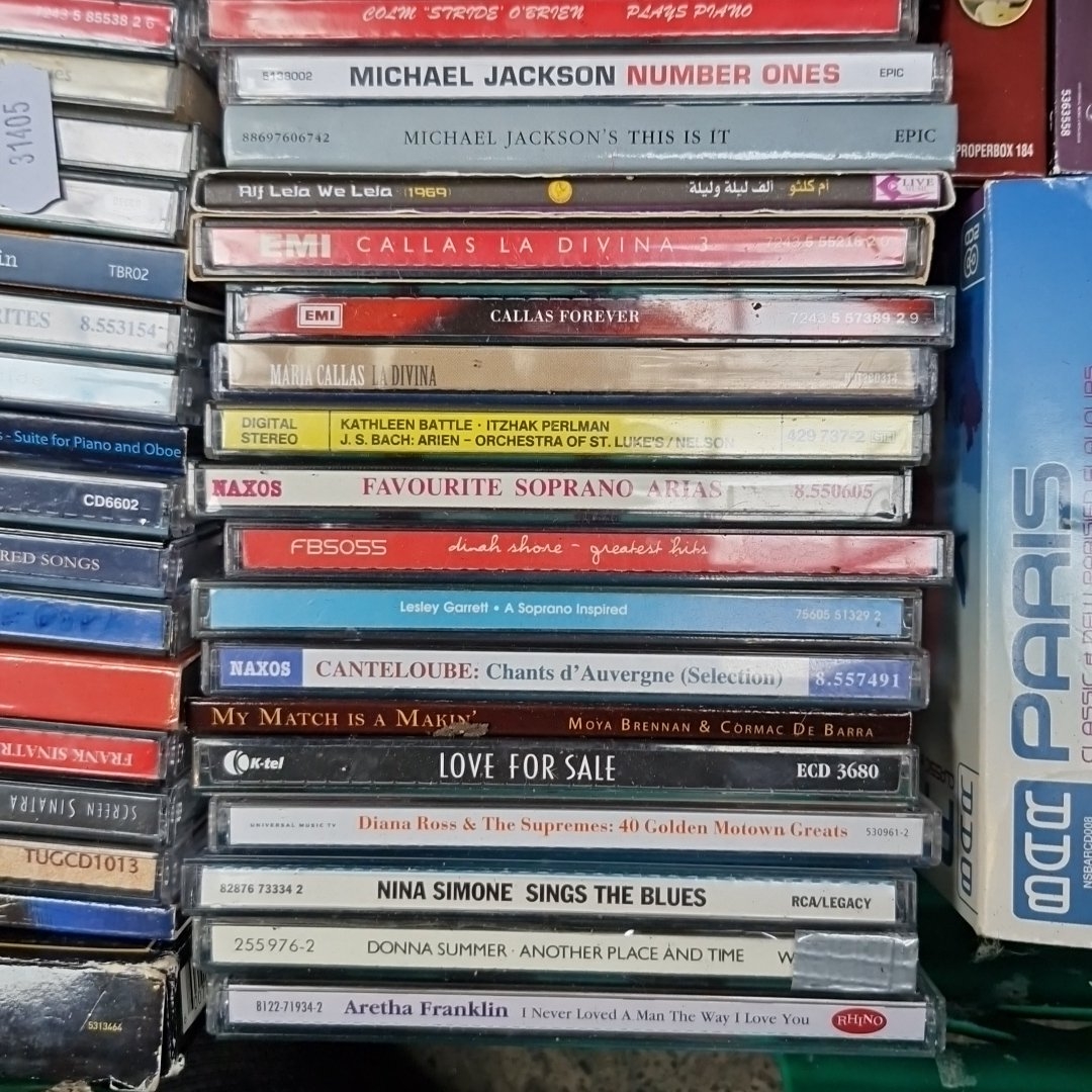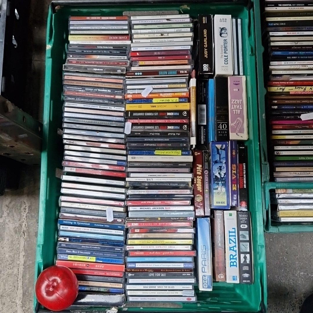 A full crate of compact discs, comprising mixed genres including classical, opera and popular music, with box sets and compilations by artists such as Michael Jackson, Maria Callas, Nina Simone, Aretha Franklin and Mario Lanza.
