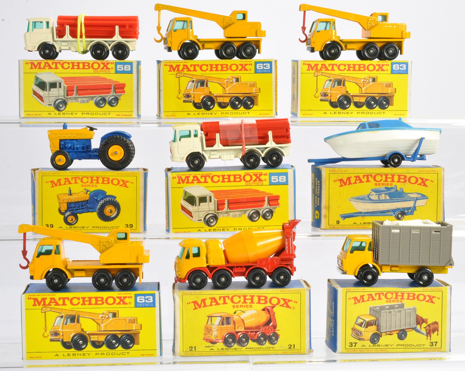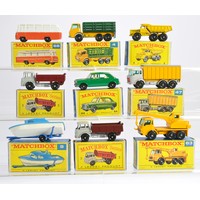 Matchbox Regular wheels comprising nine boxed issues as shown. Crane Truck x 2, Girder Truck / Cow Truck (loads on sprues) etc. Mostly very good or excellent in some good but mostly very good/excellent boxes. Generally Ex-Shop Stock.