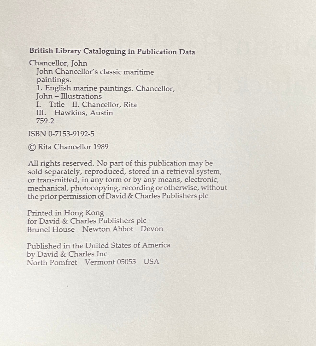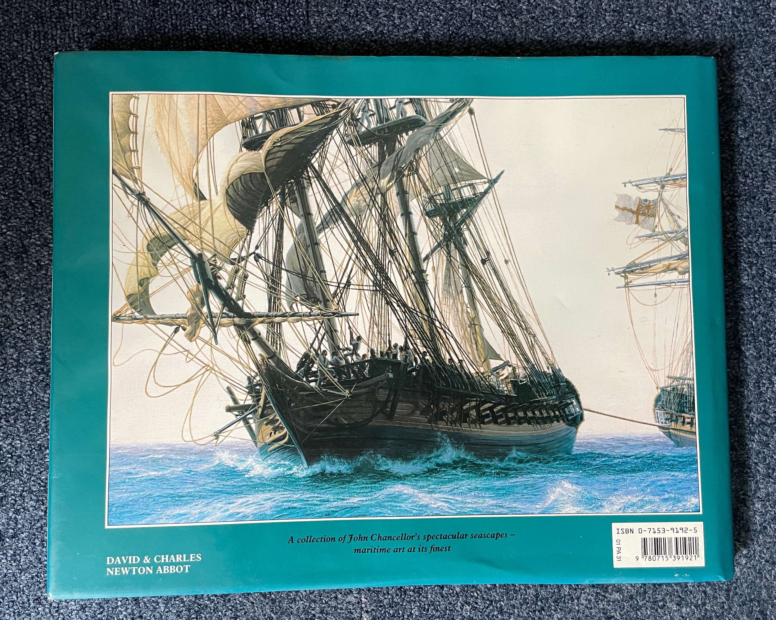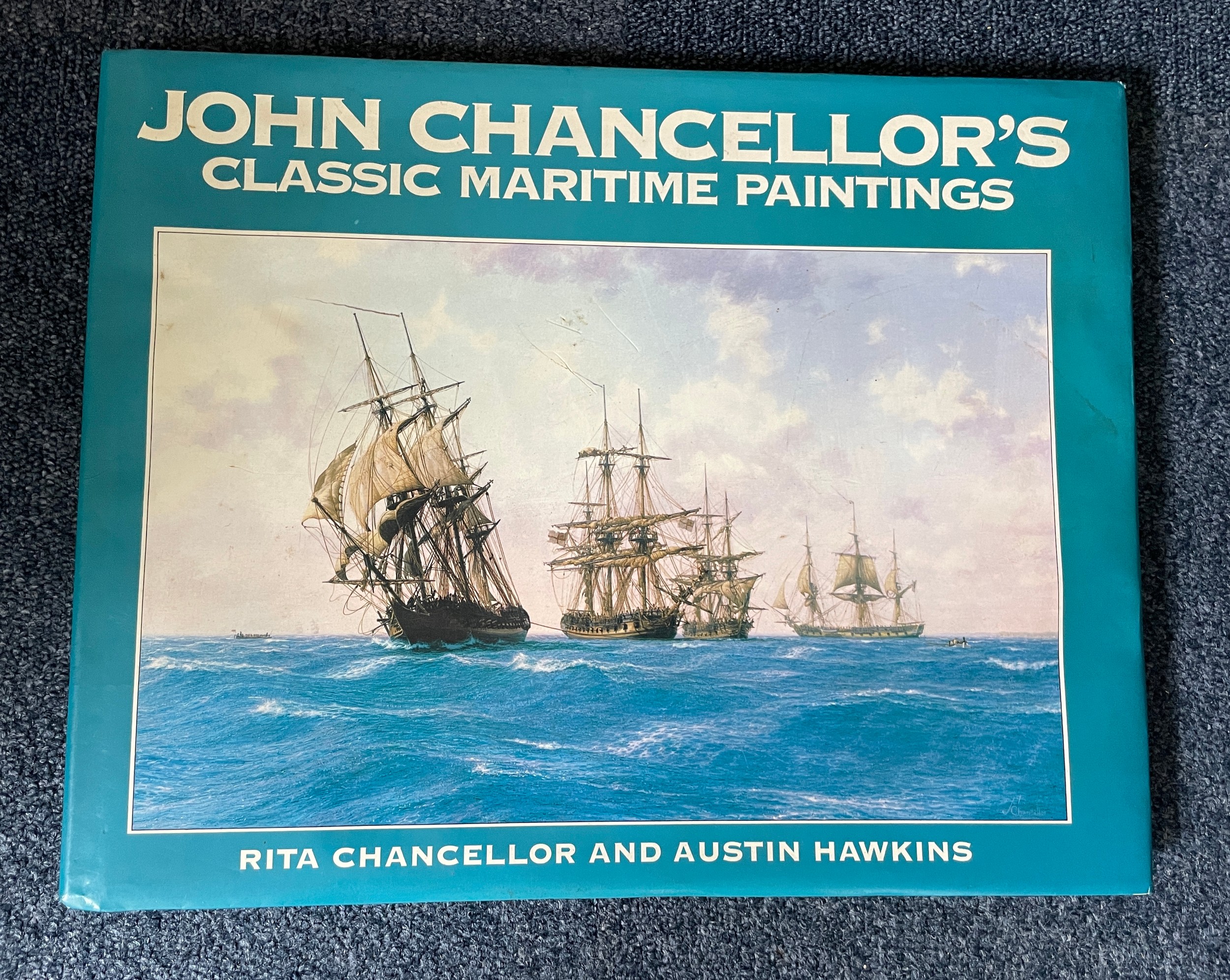 Hardcover copy of John Chancellor's Classic Maritime Paintings by Rita Chancellor and Austin Hawkins 1989 with dust jacket. Publisher David and Charles ISBN 0-7153-9192-5