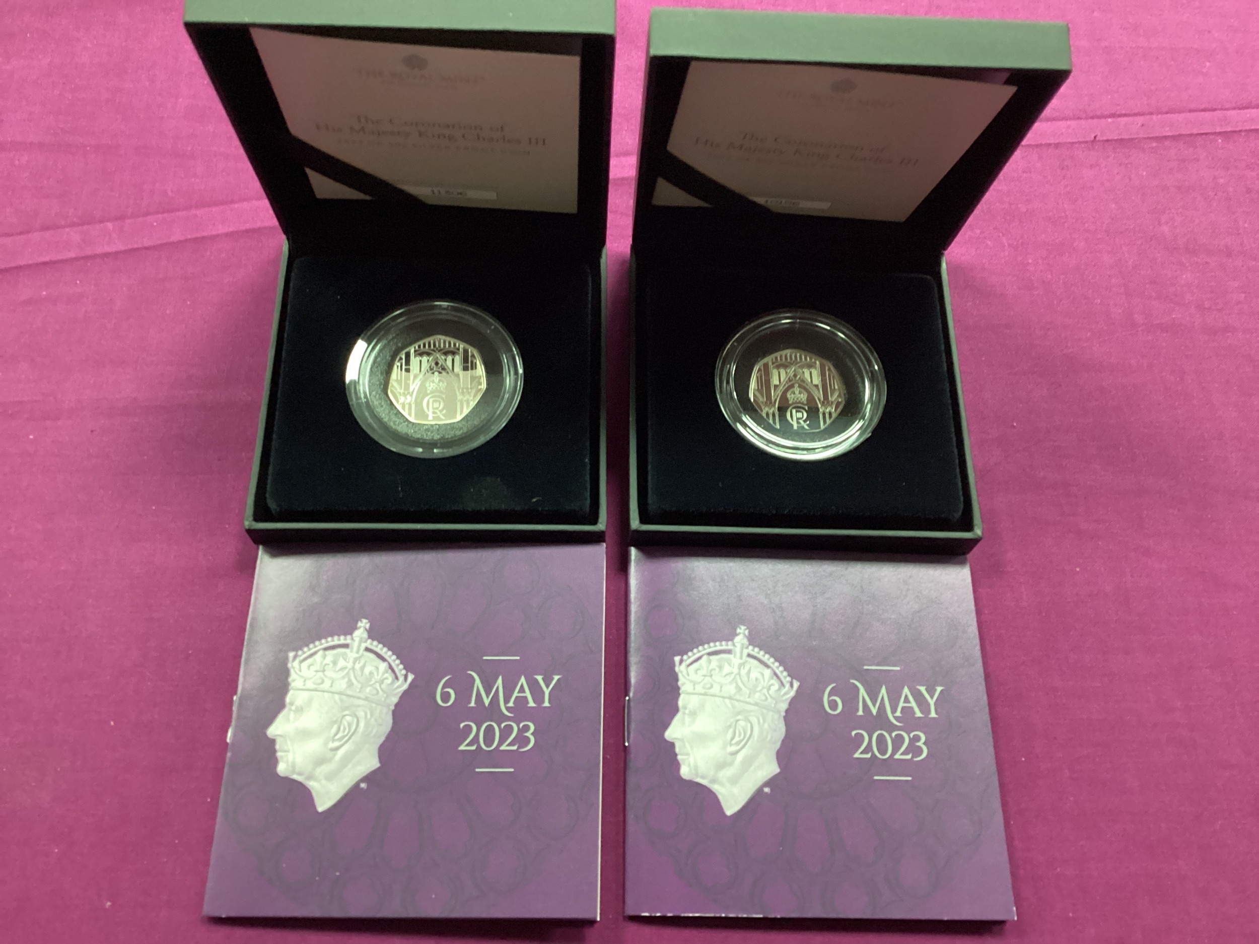 Two 2023 Royal Mint 'The Coronation Of King Charles III' Silver Proof 50p Coins, both cased with certificates of authenticity.