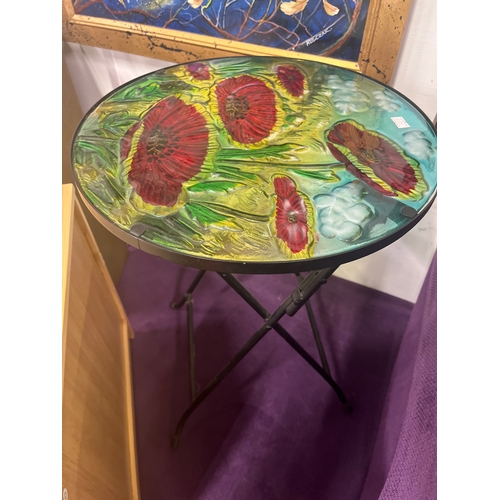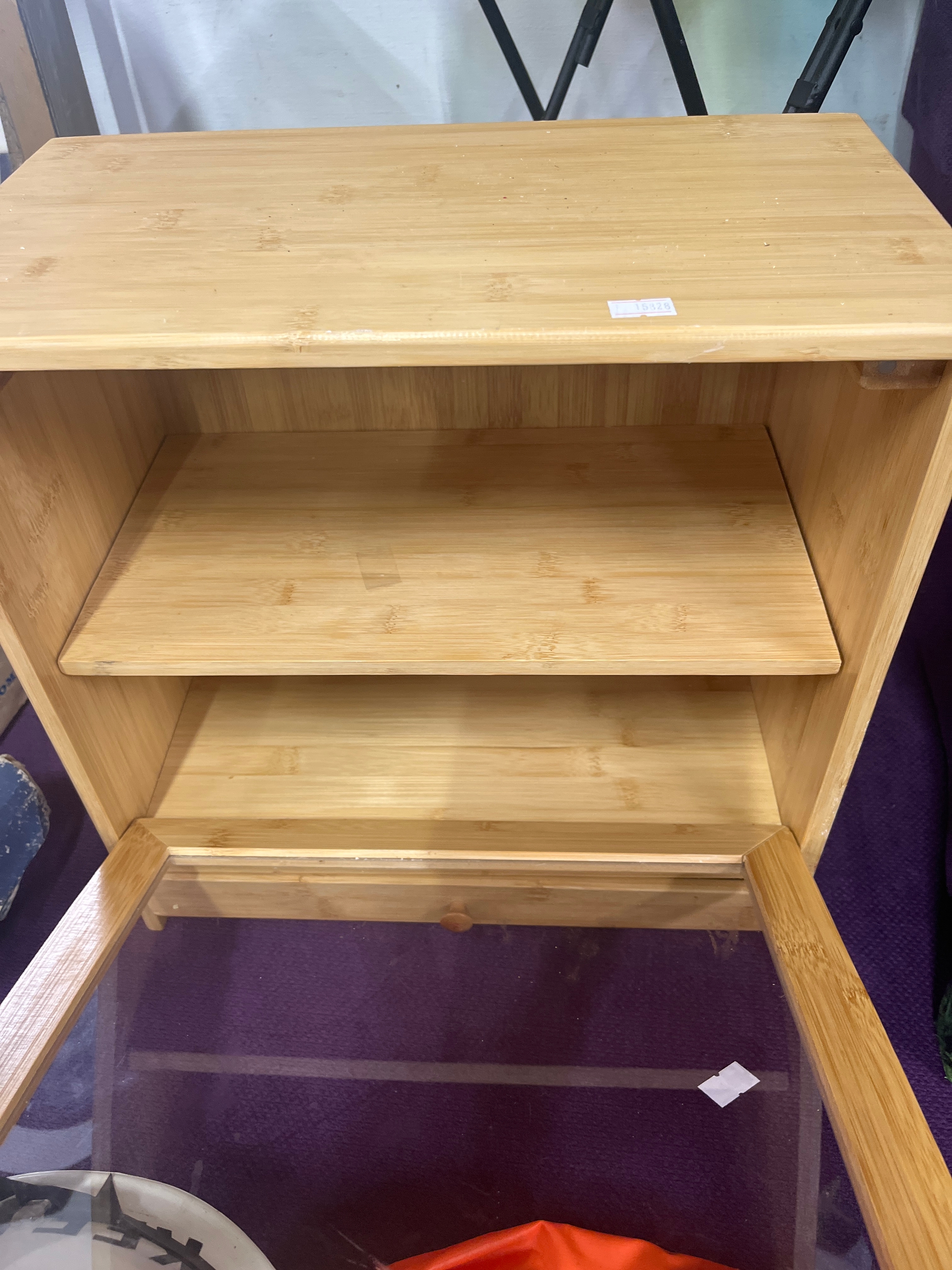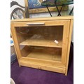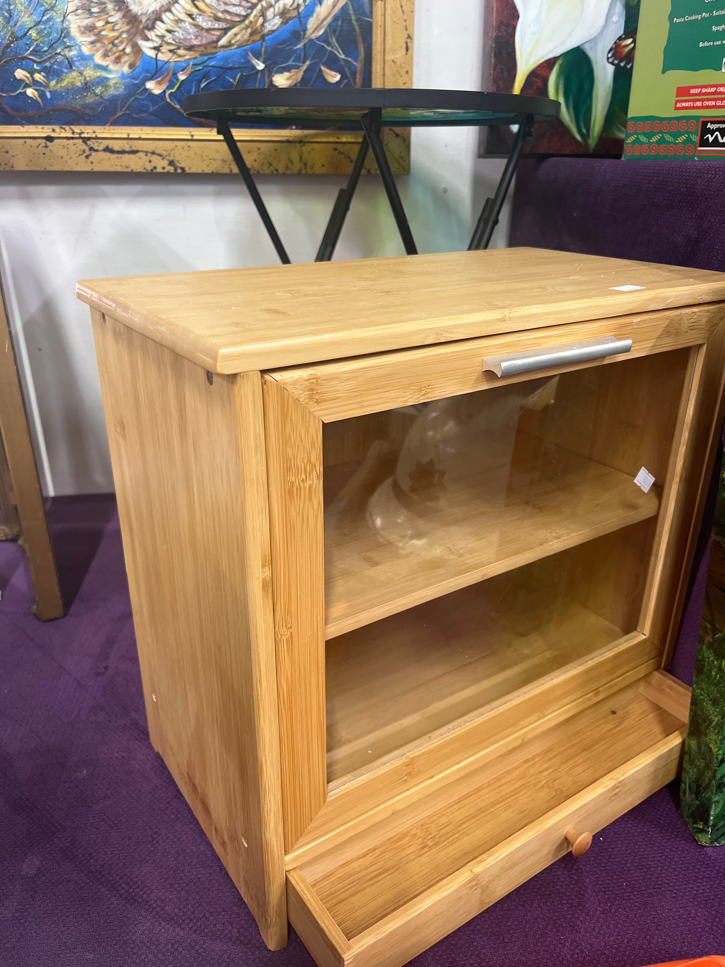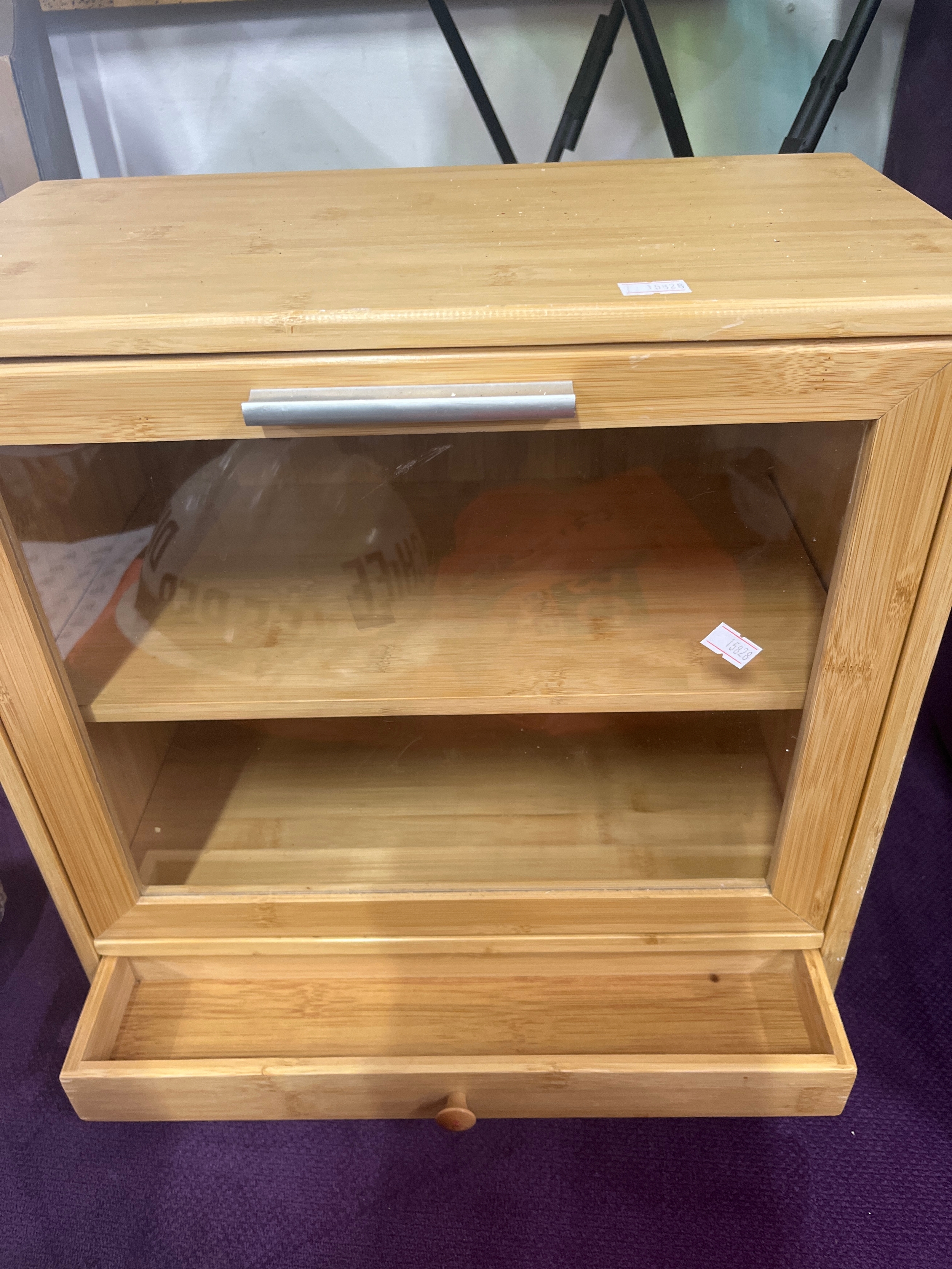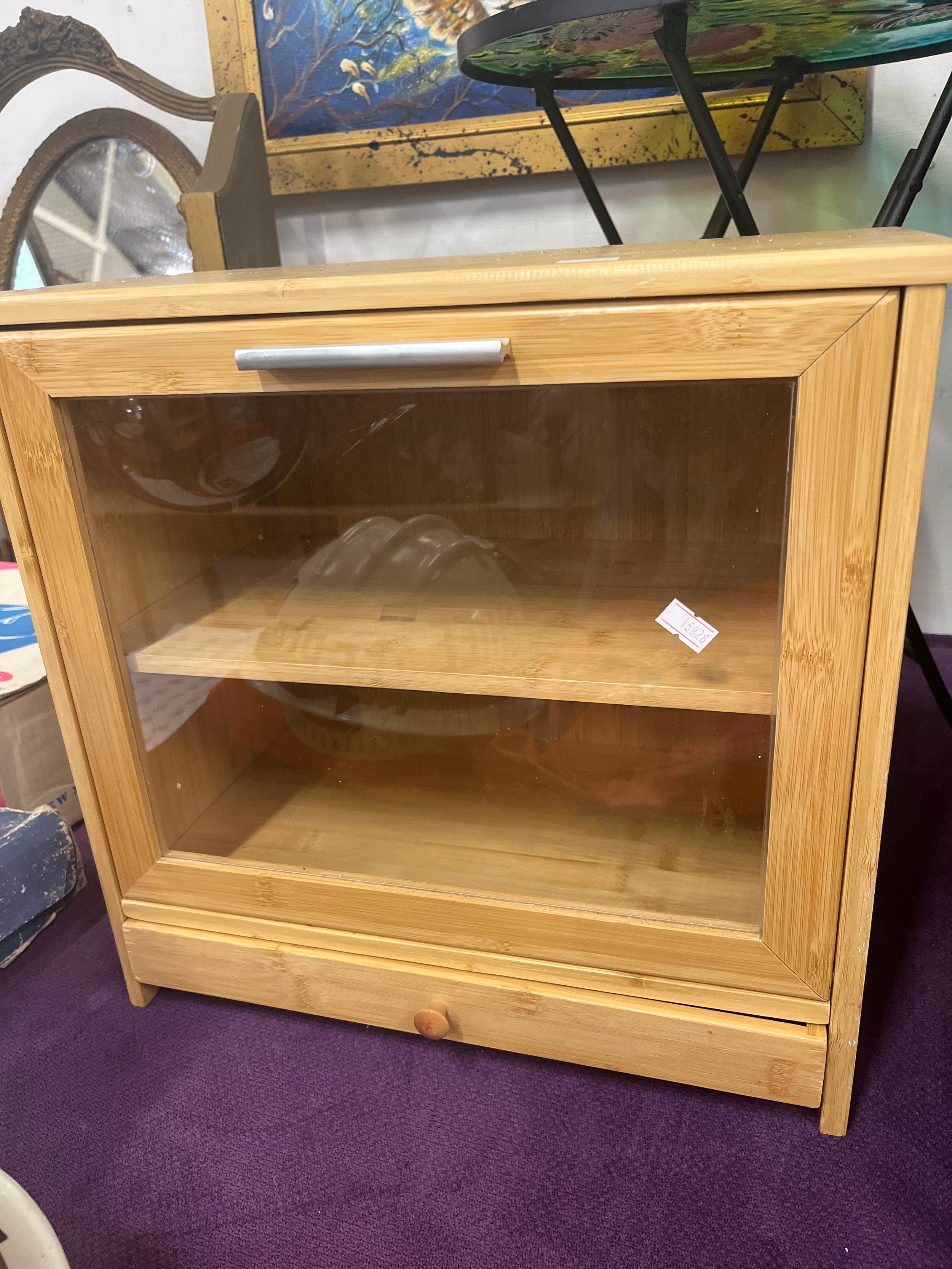 Tabletop collectors/display cabinet with small bottom drawer, internal shelf and glass fronted drop down front