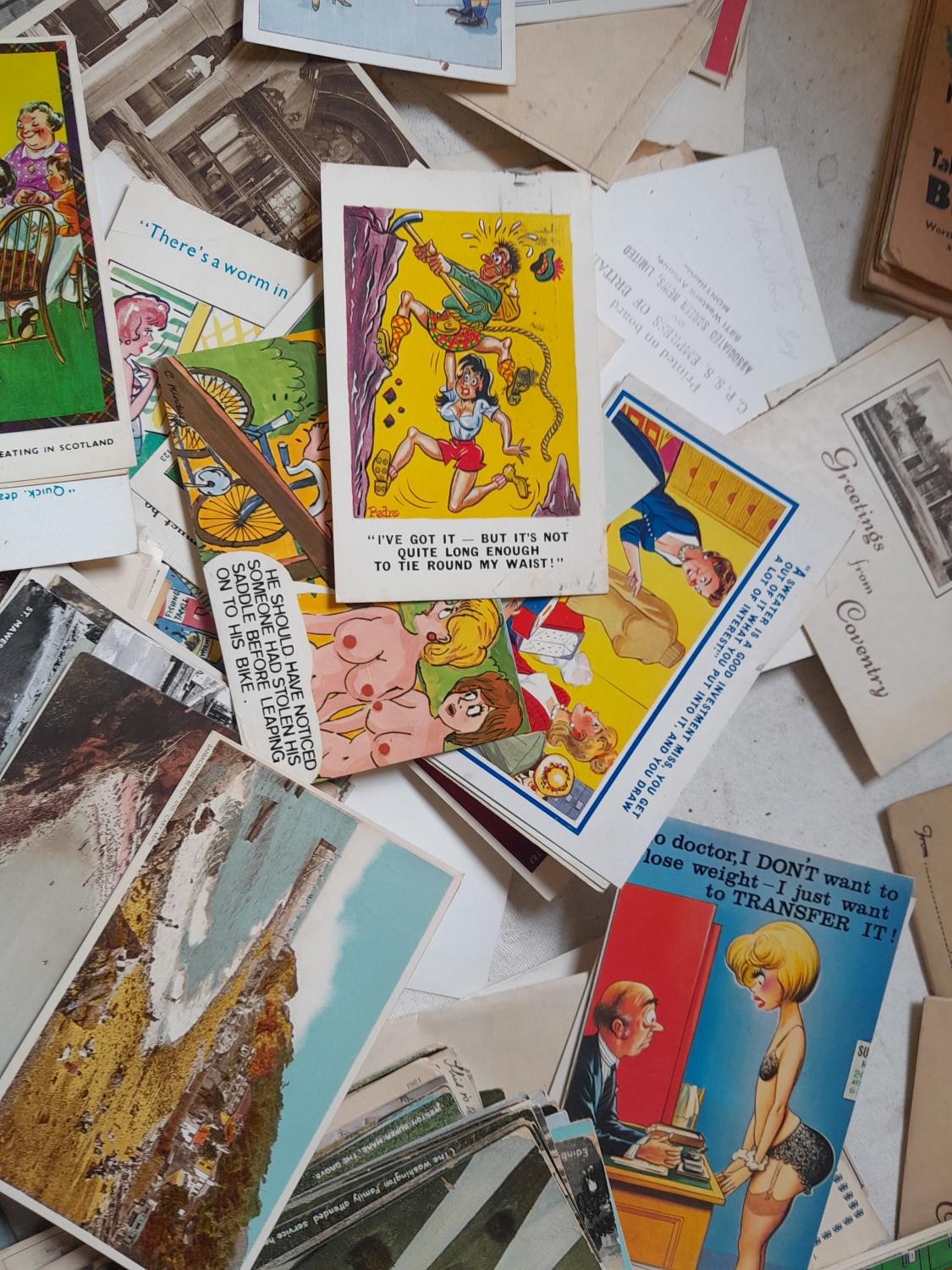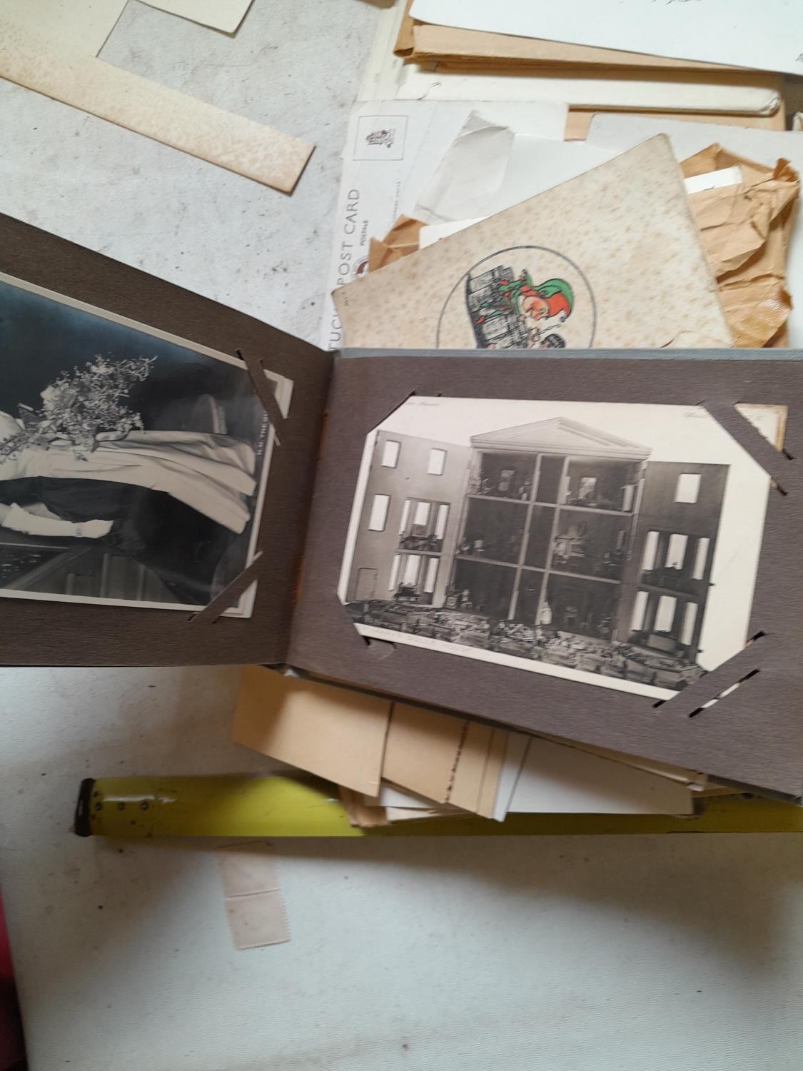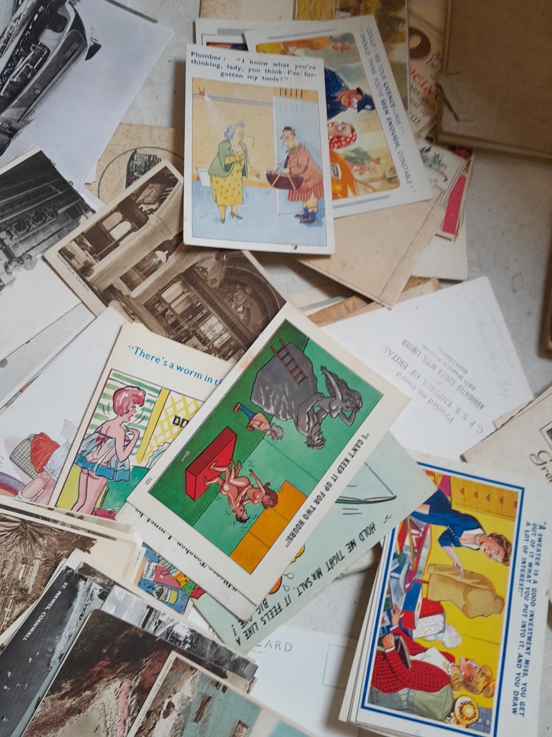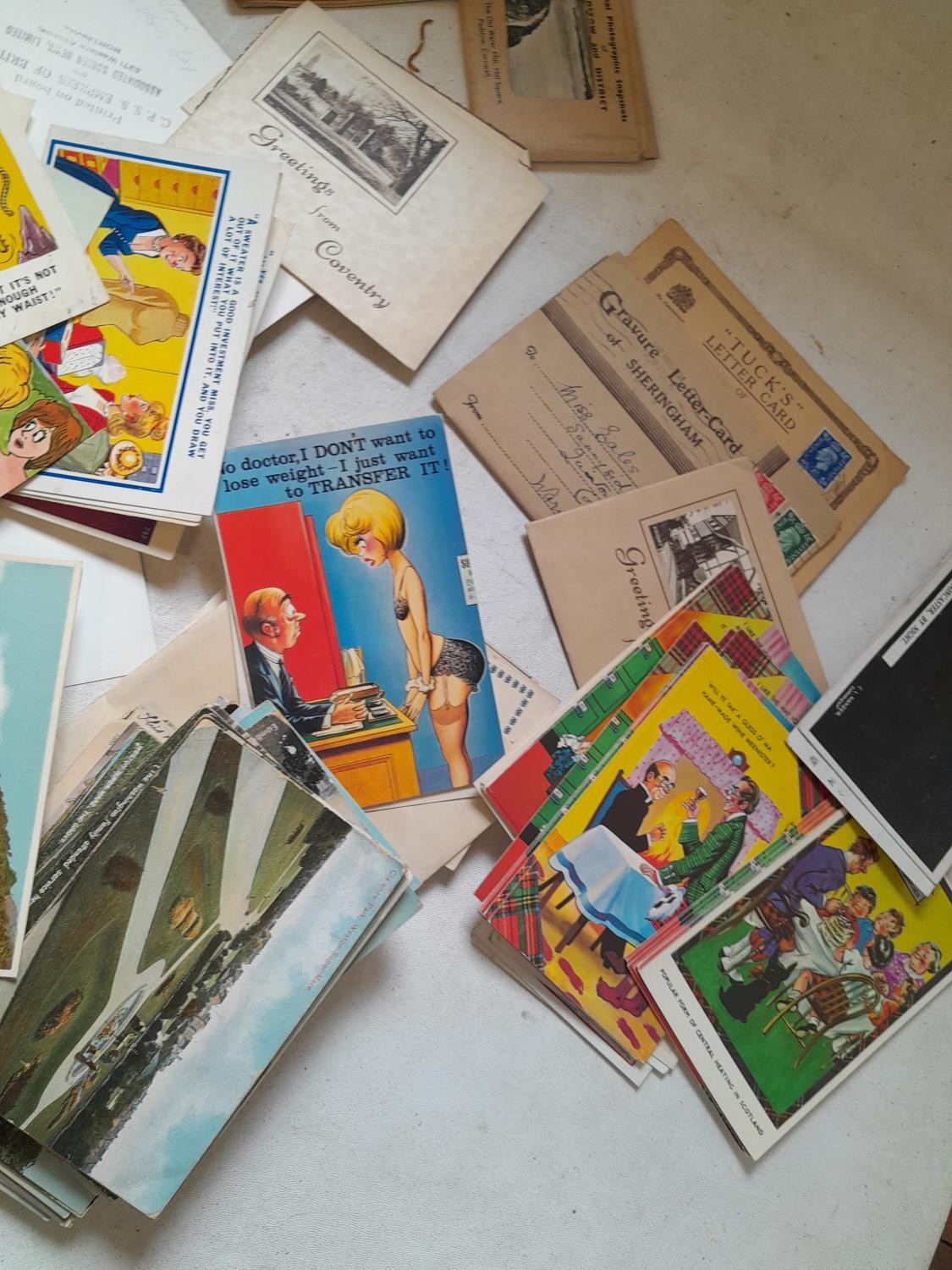 Assorted postcards, greeting cards, album of Royalty interest postcards, multi thematic collection, transport, end of pier and comedy cards, tourist snaps etc.