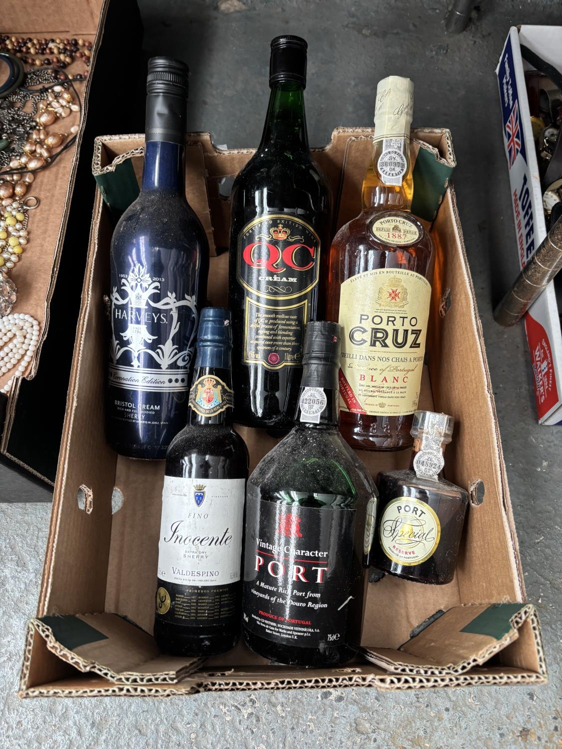 Box containing sealed bottles of Vintage Character Port and Porto Cruz white port etc