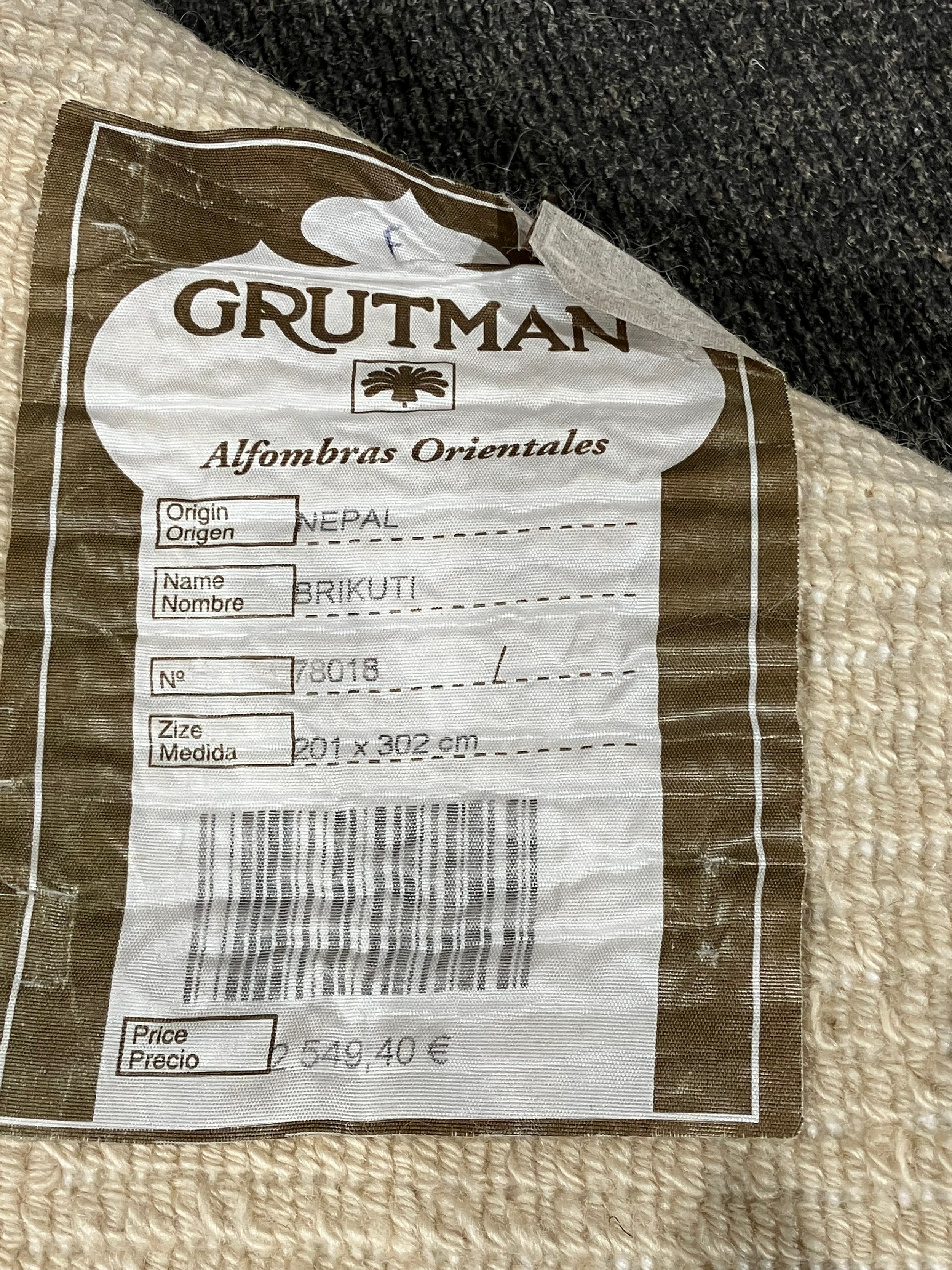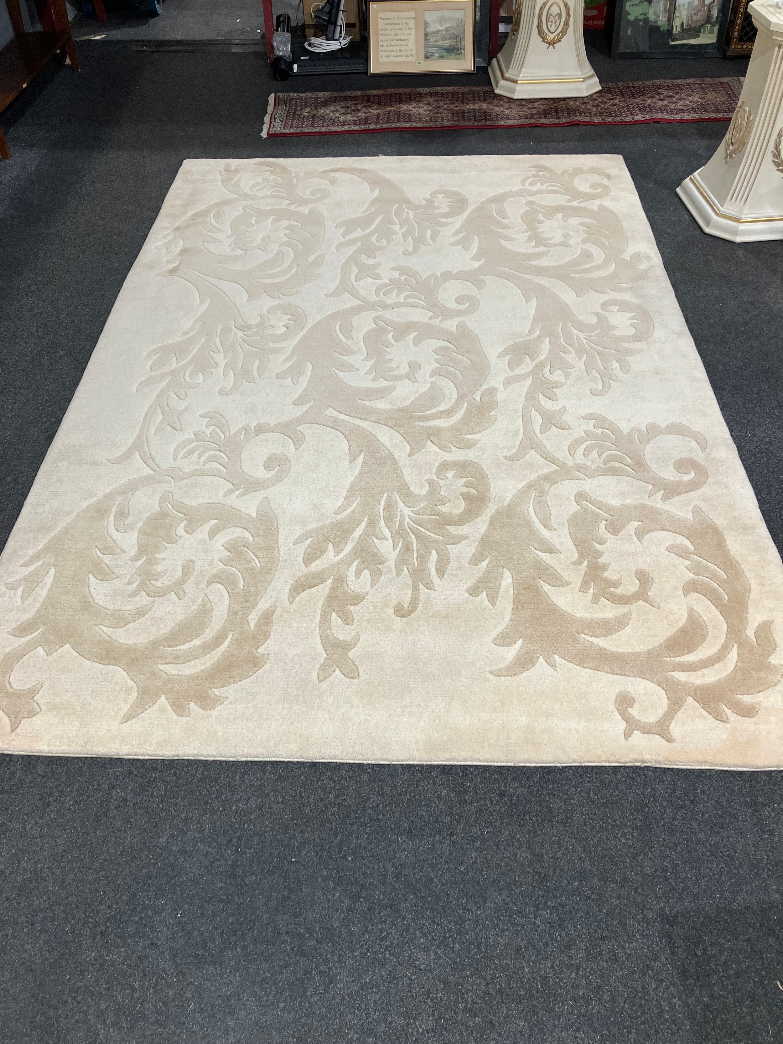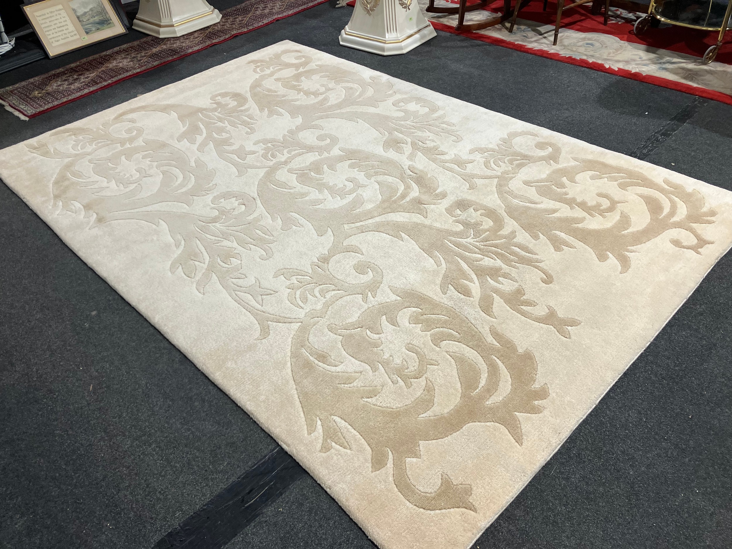 A Grutman Nepalese modern cream wool rug with foliate design, model 'Brikuti', 201cm x 302cm