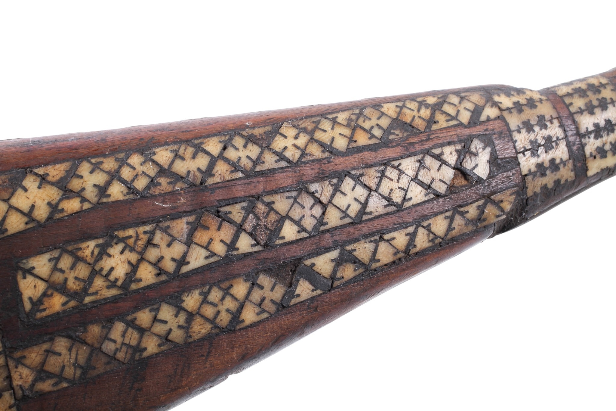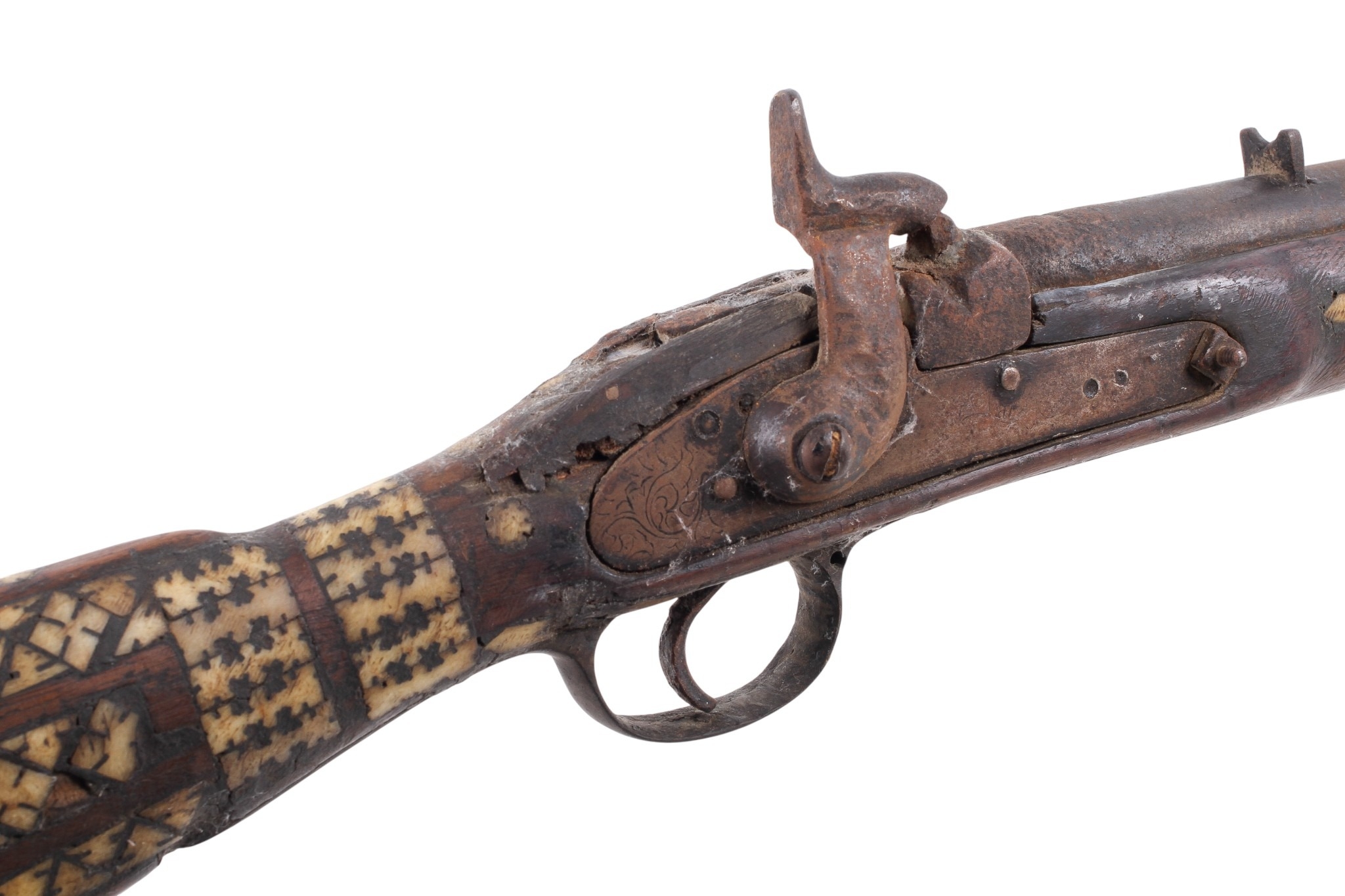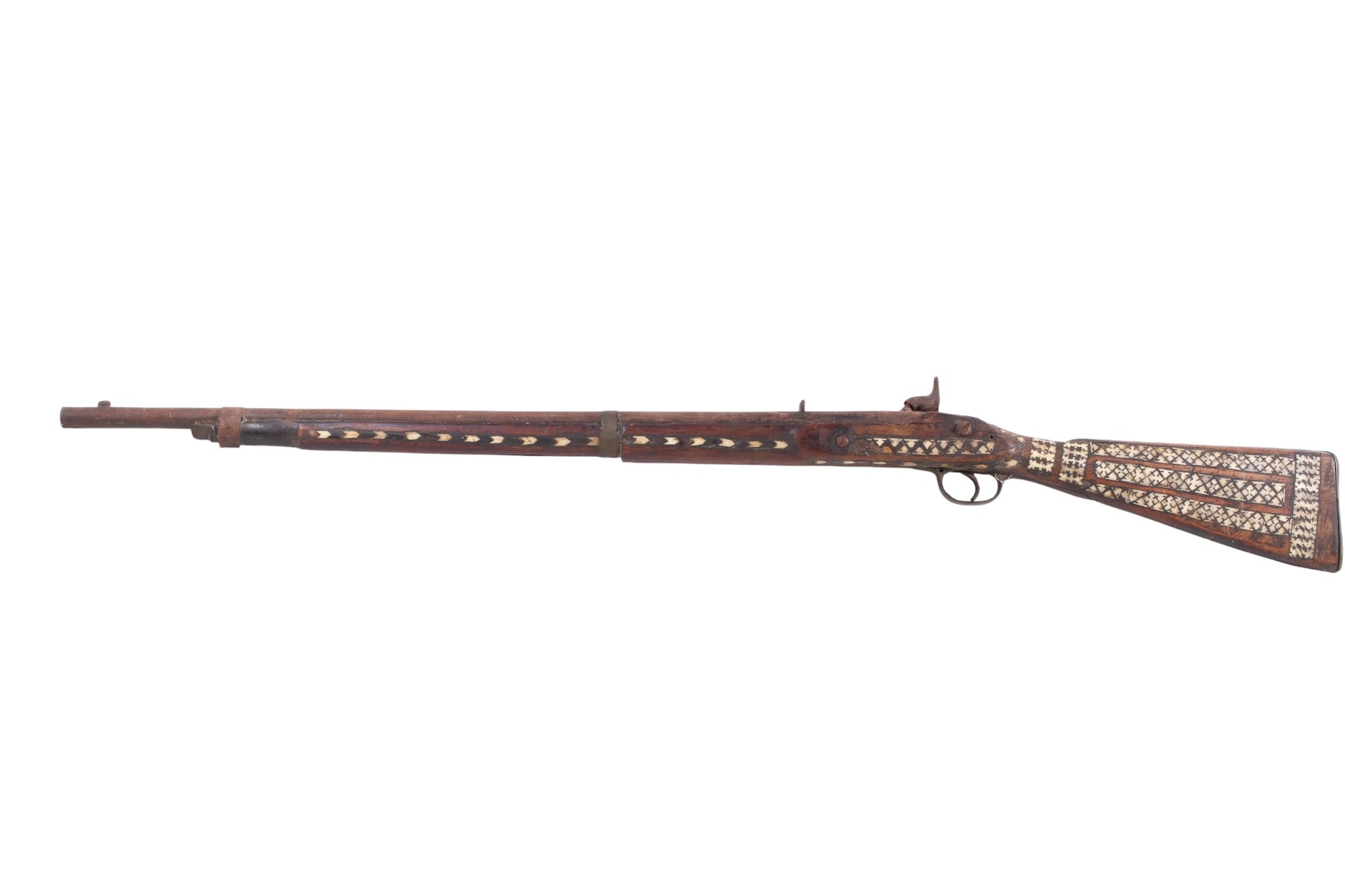 An originally Enfield musket later worked inlaid with Middle Eastern bone decoration circa 1865, would make ideal wall hanger, 120cm overall