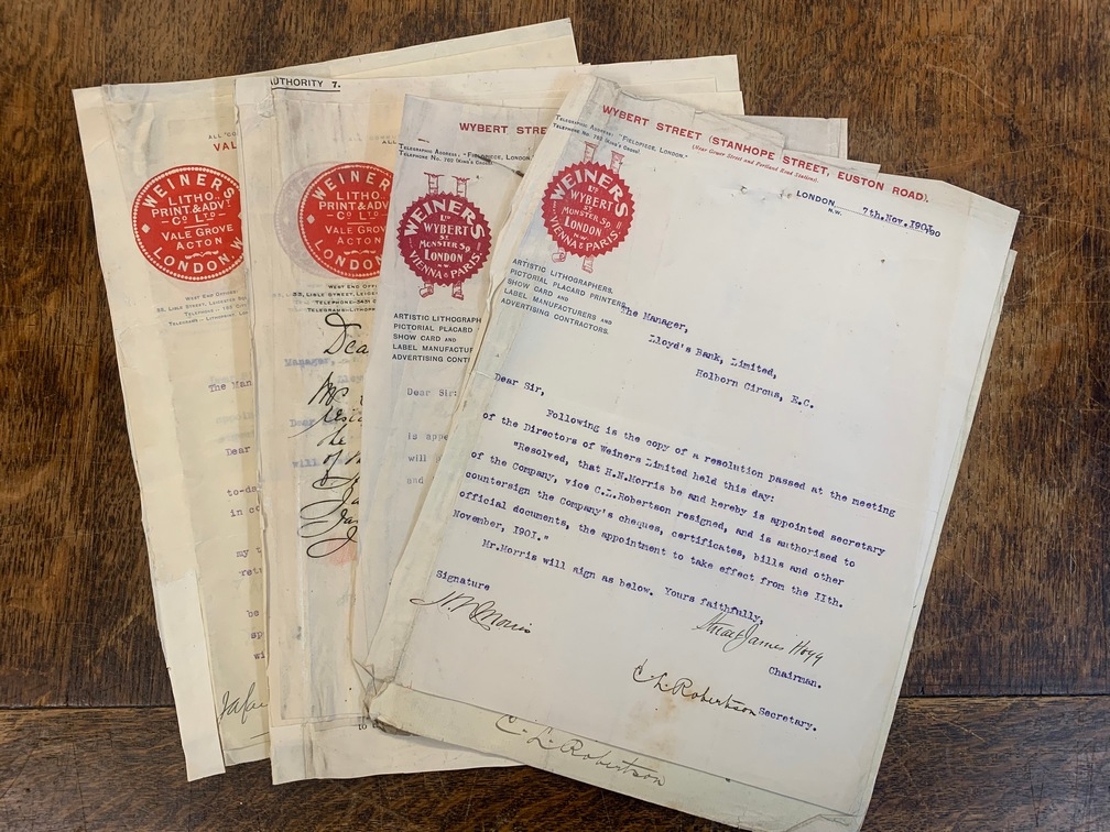 Weiners Litho, Print & Advt Co. Ltd - 1909 Batch of letter-headed correspondence from Vale Grove, Acton to Lloyds Bank, Holburn (11).