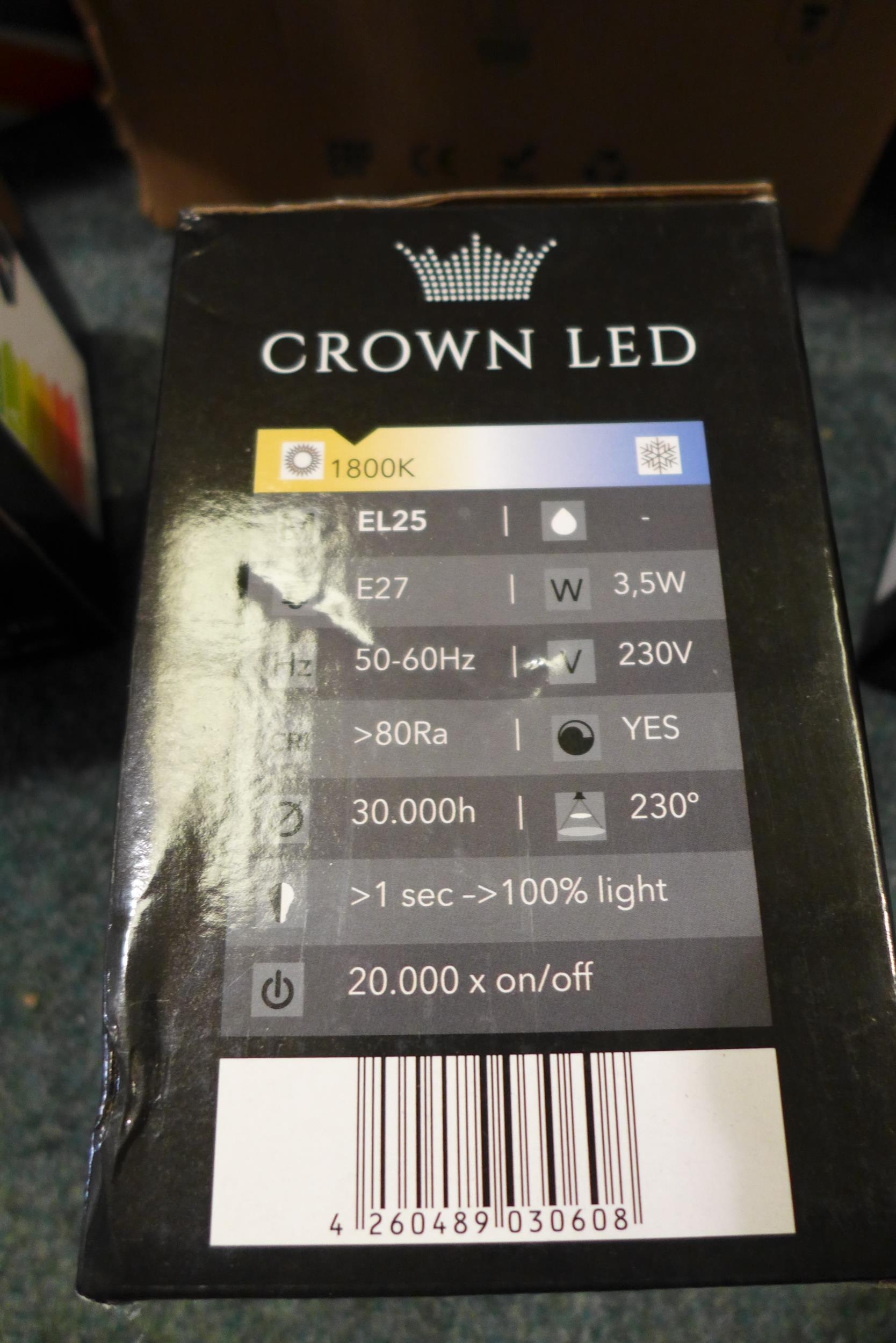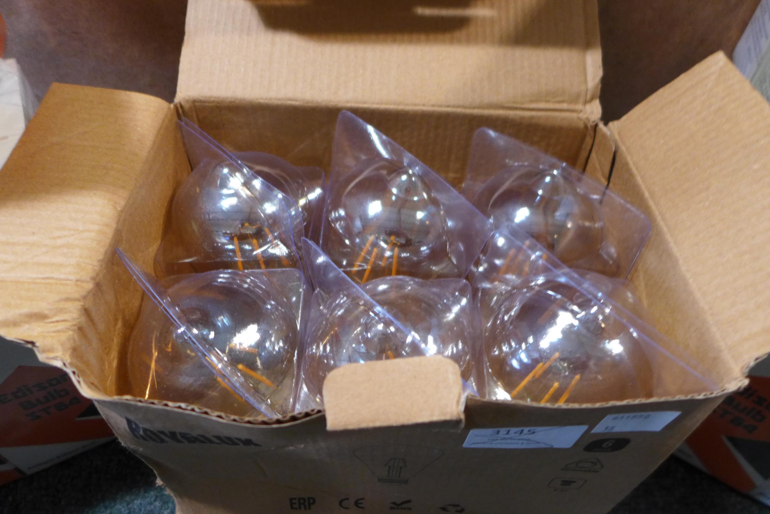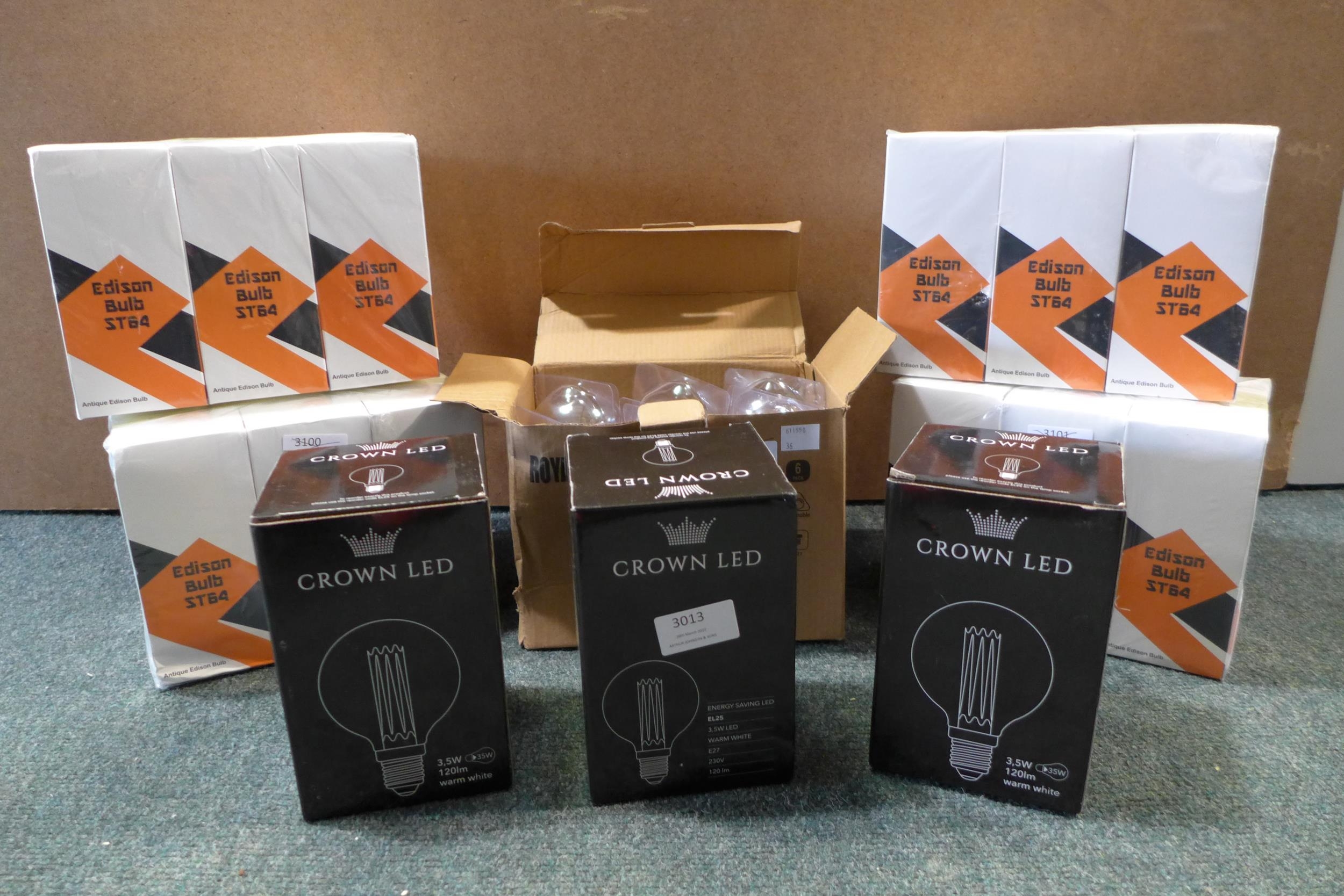24 Antique ST64 Edison bulbs, three Crown LED EL25 Energy Saving LED bulbs and a box of 6, 4W E27 dimmable bulbs