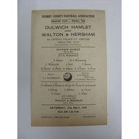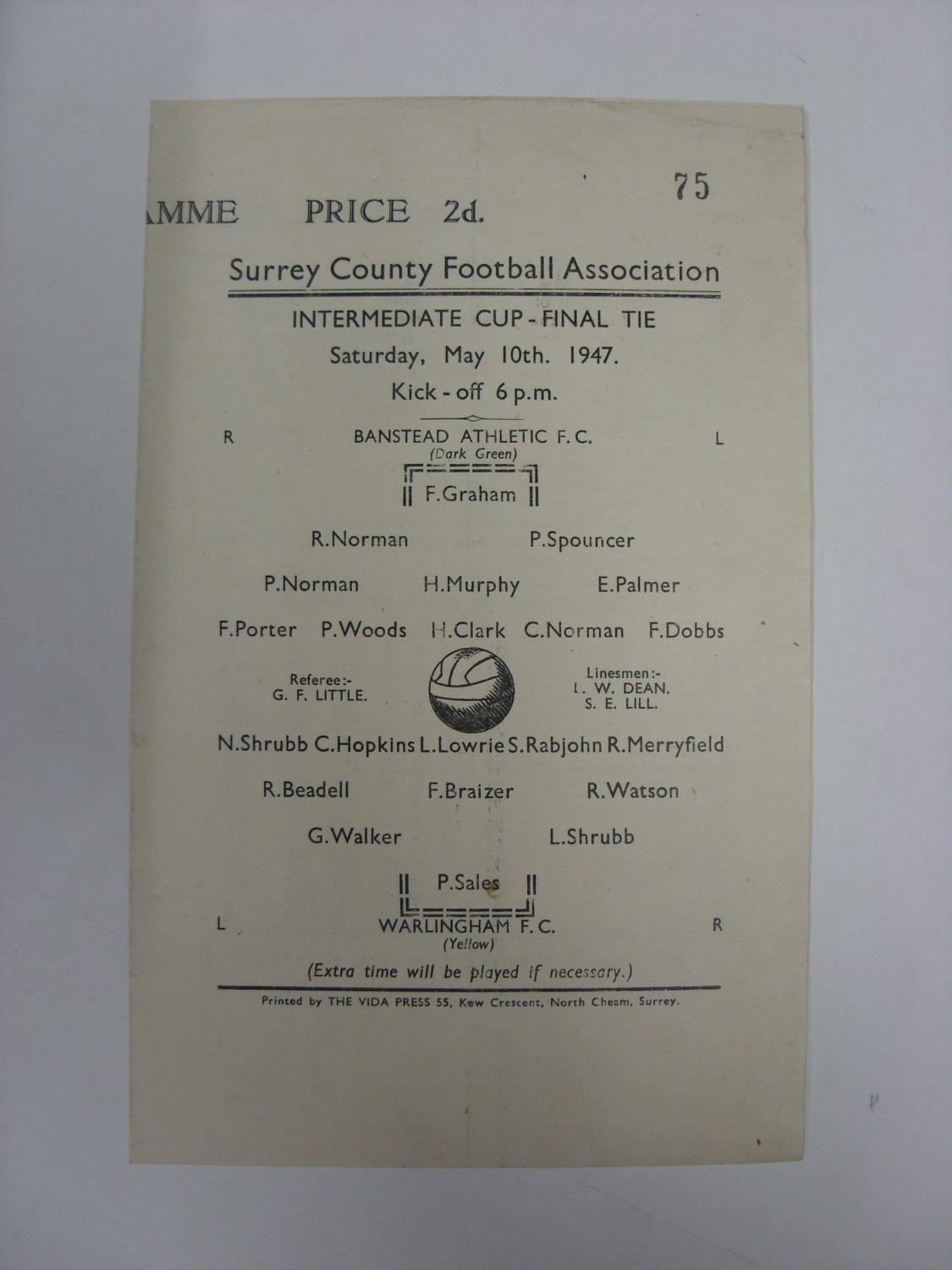 AT CRYSTAL PALACE, 1947, a football programme from the Surrey Intermediate Cup Final, Banstead Athletic versus Warlingham, played on 10/05/1947 (folded, slight mark). Estimate: £14/£16 - Opening Bid: £12