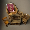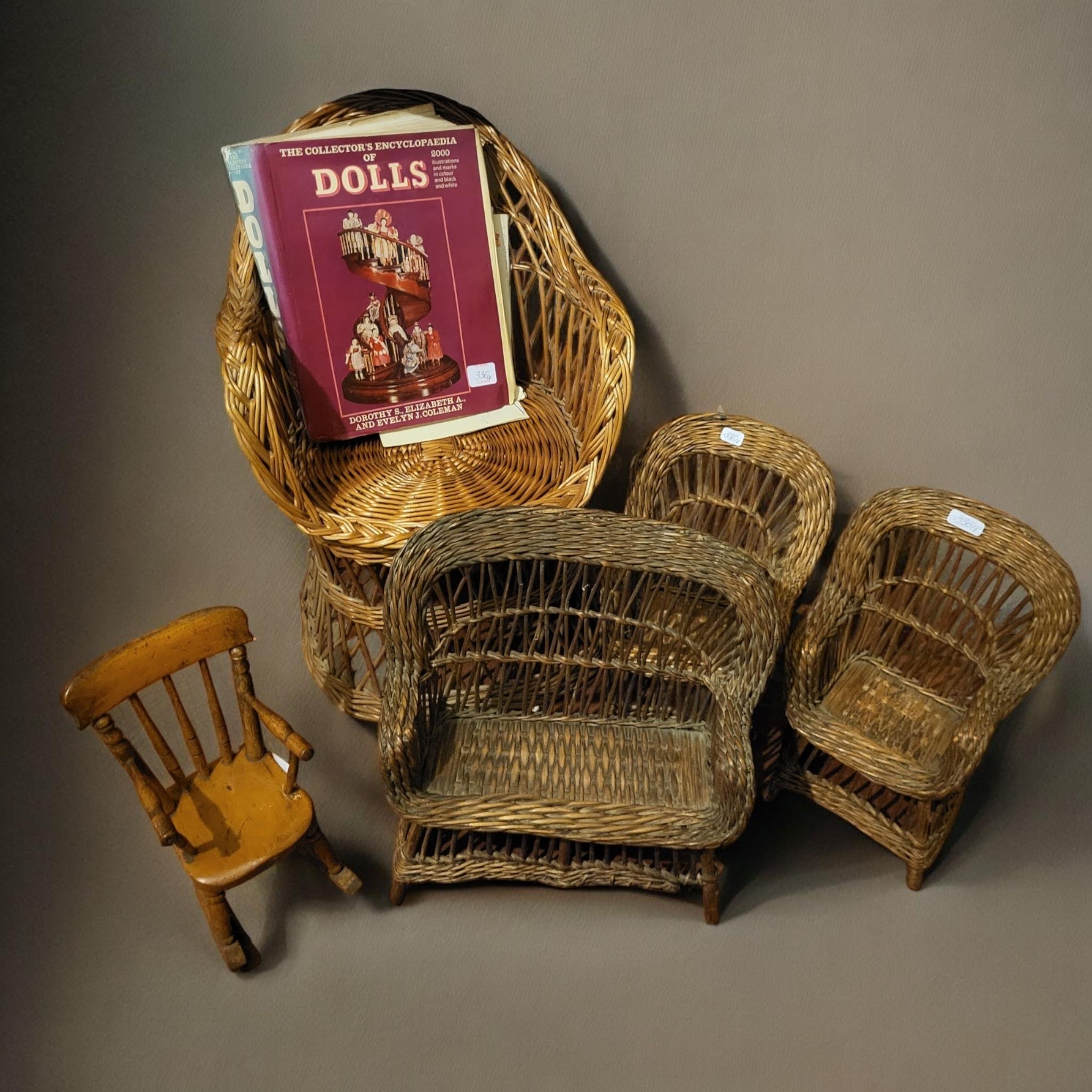 Consisting of a pair of wicker dolls armchairs, a pair of rocking chairs, wheelbarrow, dolls cart and Bisque doll, presentation wicker high back armchair, along with a book 'Encyclopaedia of Dolls'.