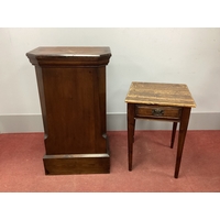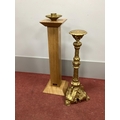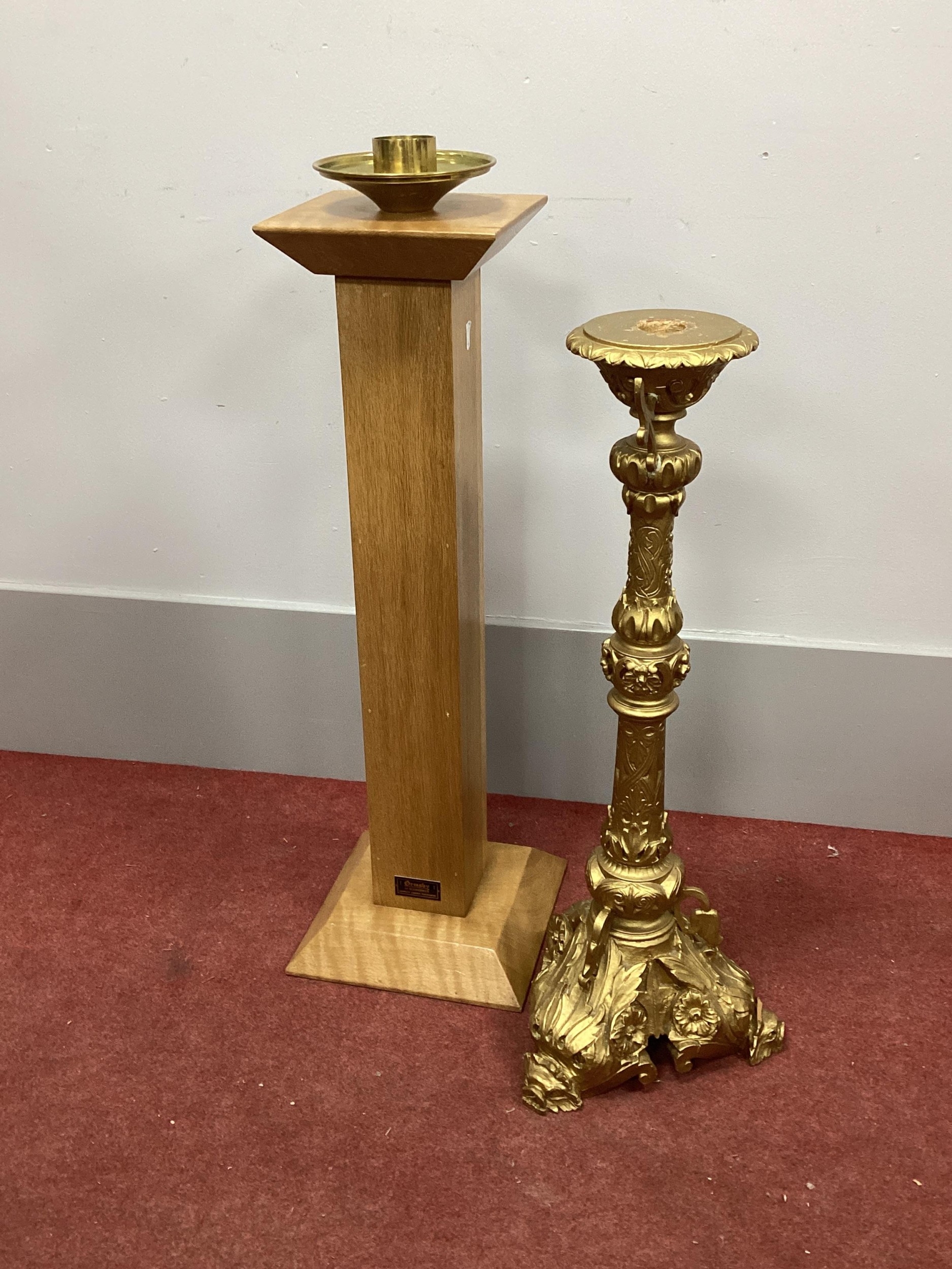 A XIX Century Gilt Candlestick, with foliate decoration, 70cm high; together with a later oak floor standing candlestick bearing maker's label for "Ormsby of Scarisbrick", 80cm high. (2)