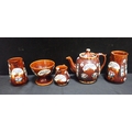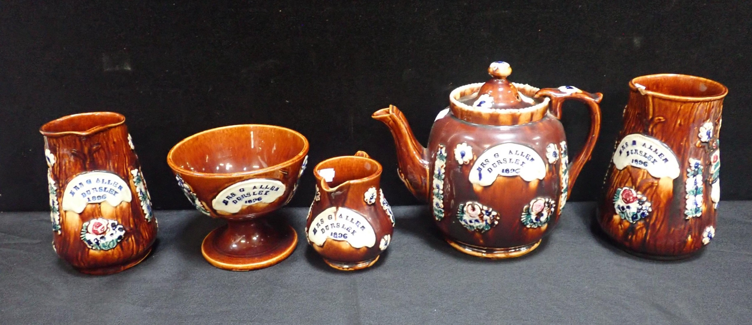 A LATE 19th CENTURY MEASHAM WARE TEAPOT, MILK JUG AND SUGAR BASINand two further jugs, all named for Mrs G. Allen, Dursley 1896 (some chips to jugs) (5)