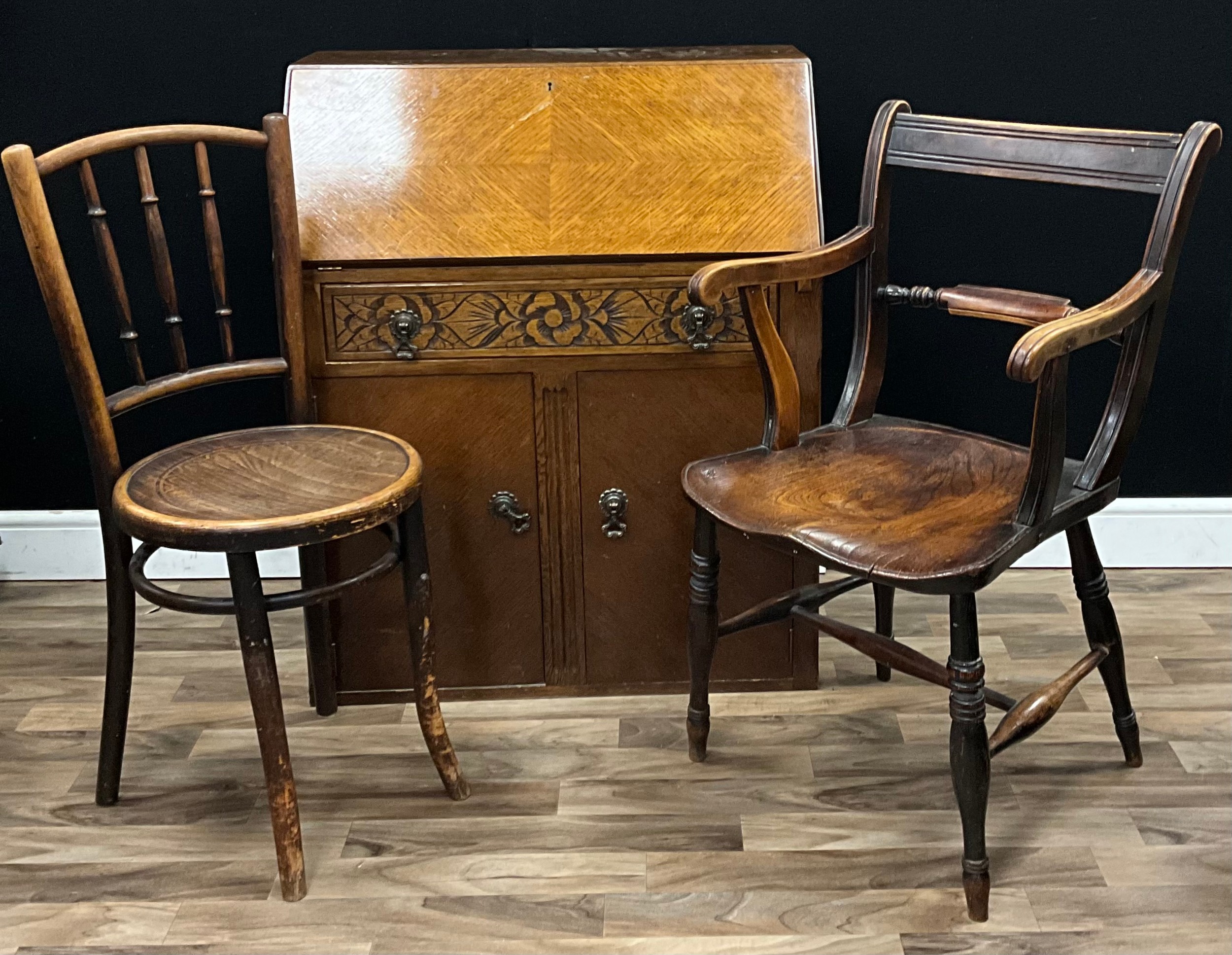A 20th century oak bureau, drop fall front with fitted interior above drawer to frieze, two cupboards to base; an Arts and Crafts style thonet chair; a mahogany elbow chair; another, (4)