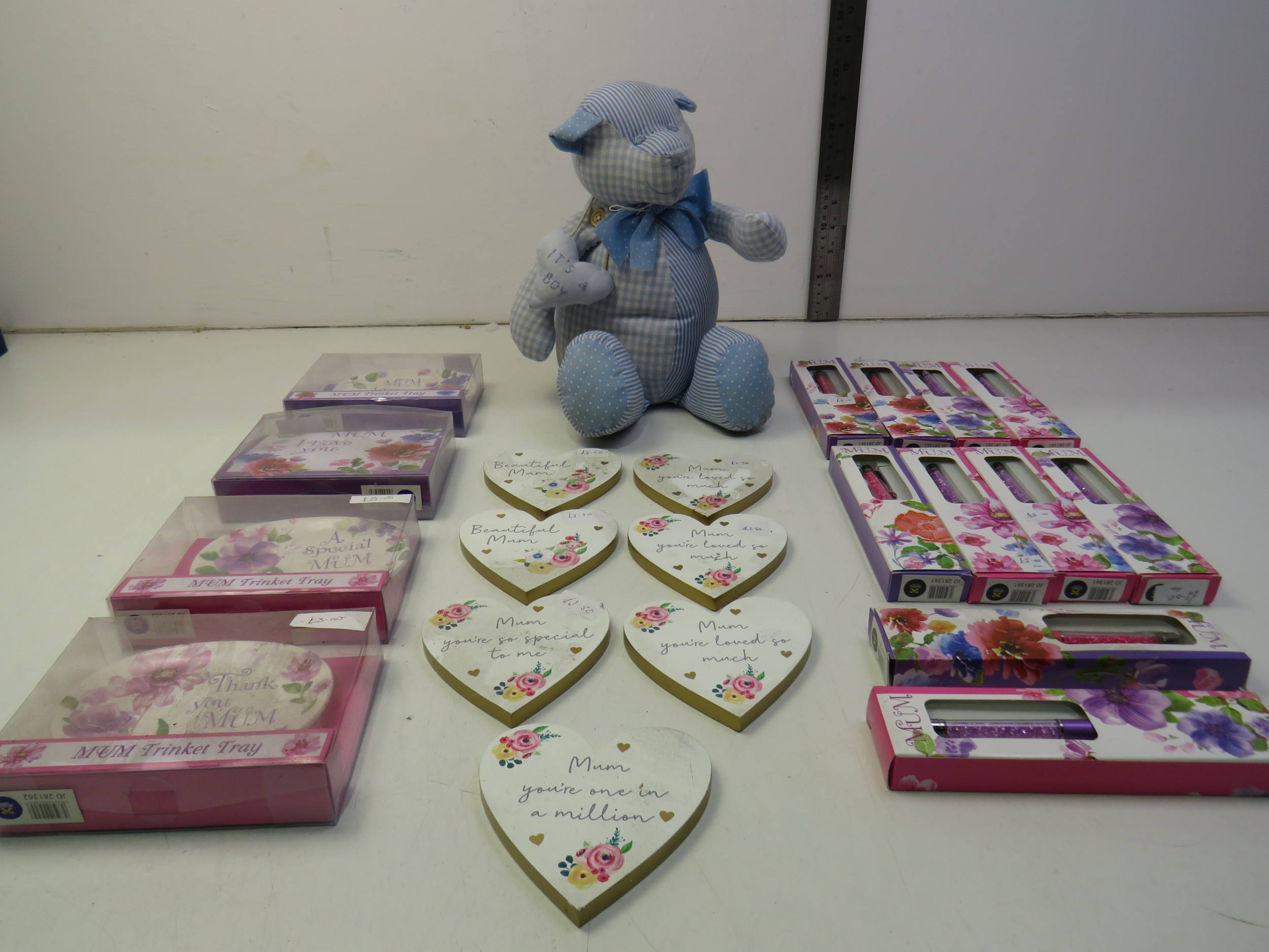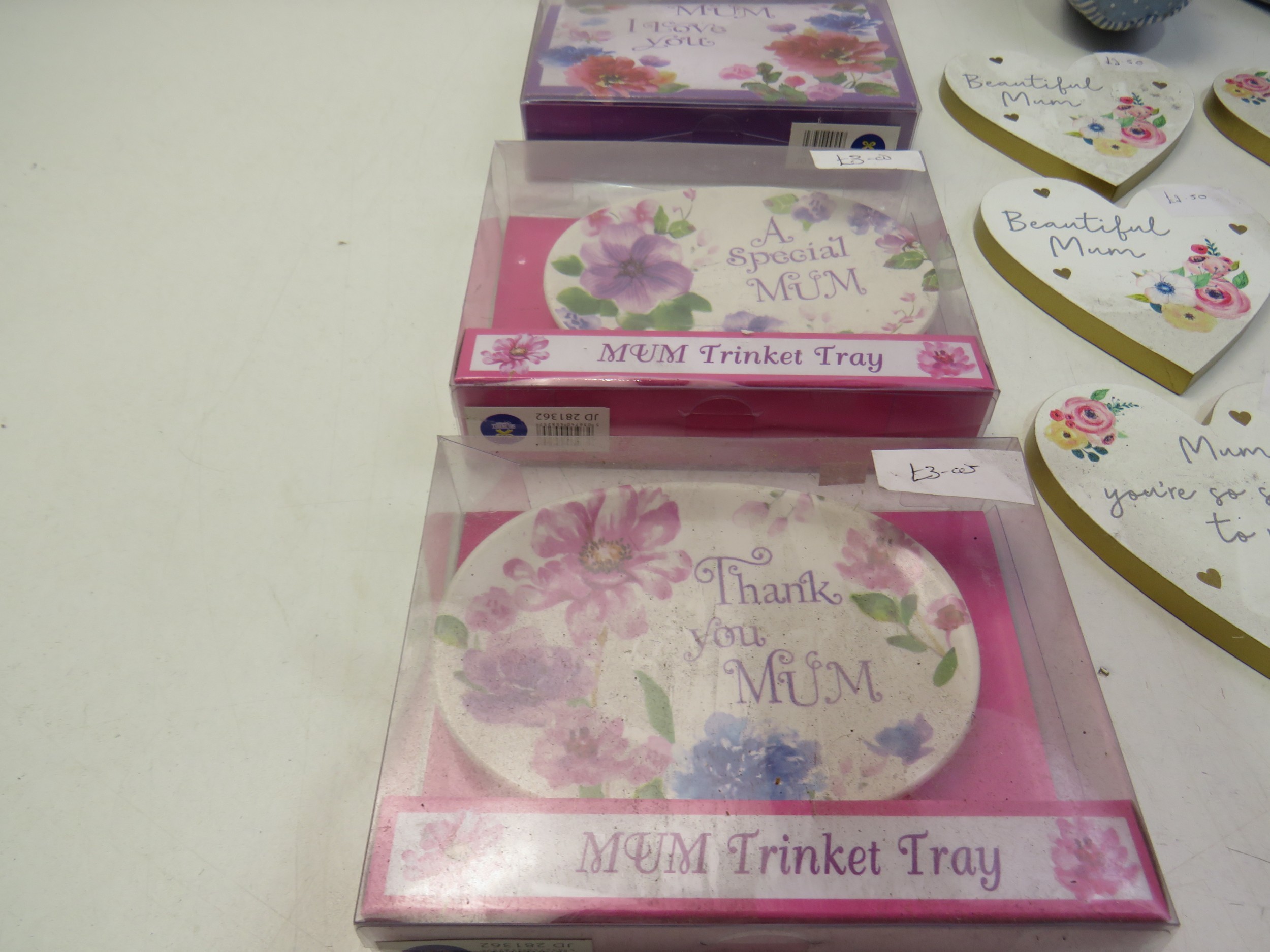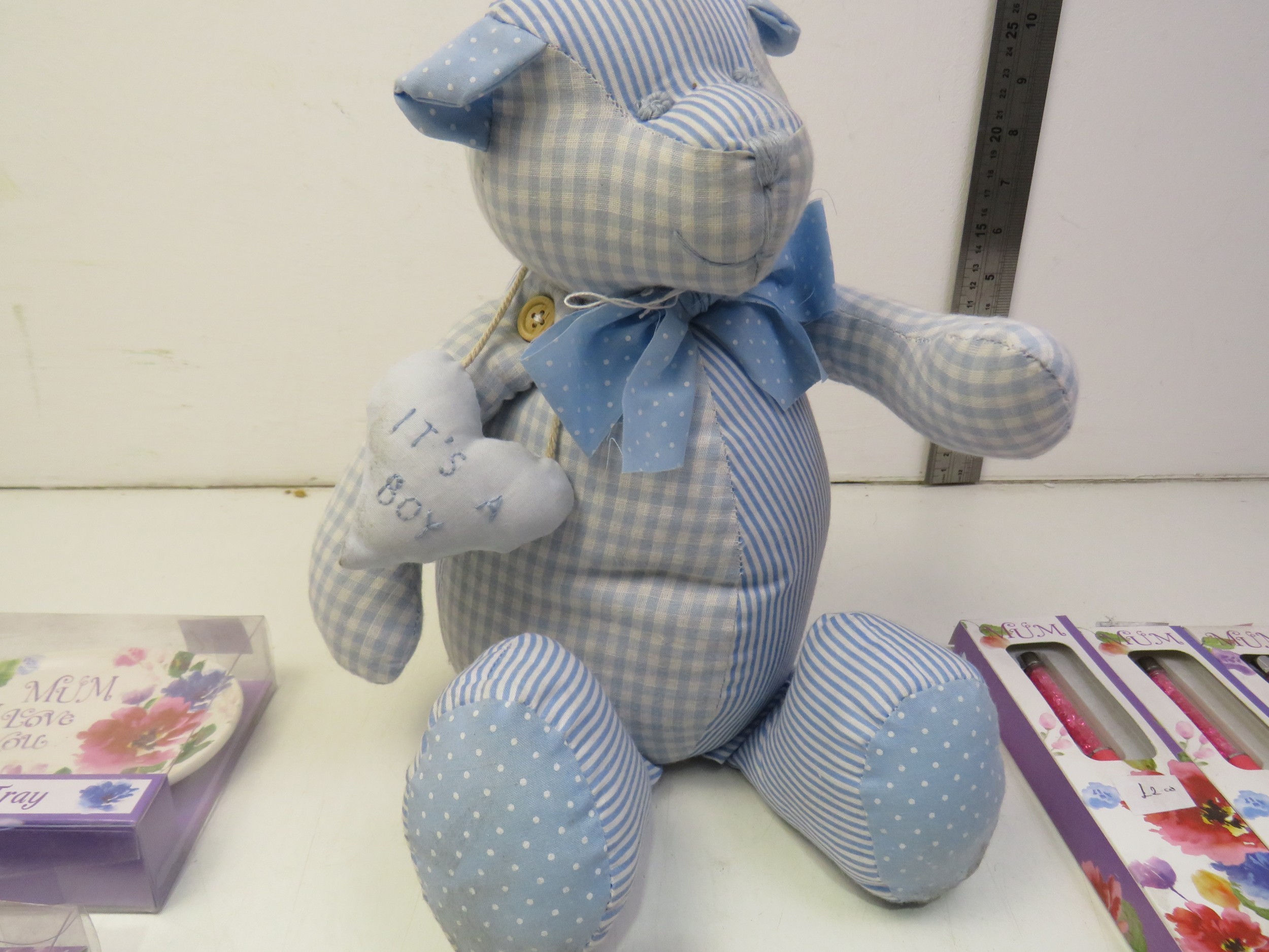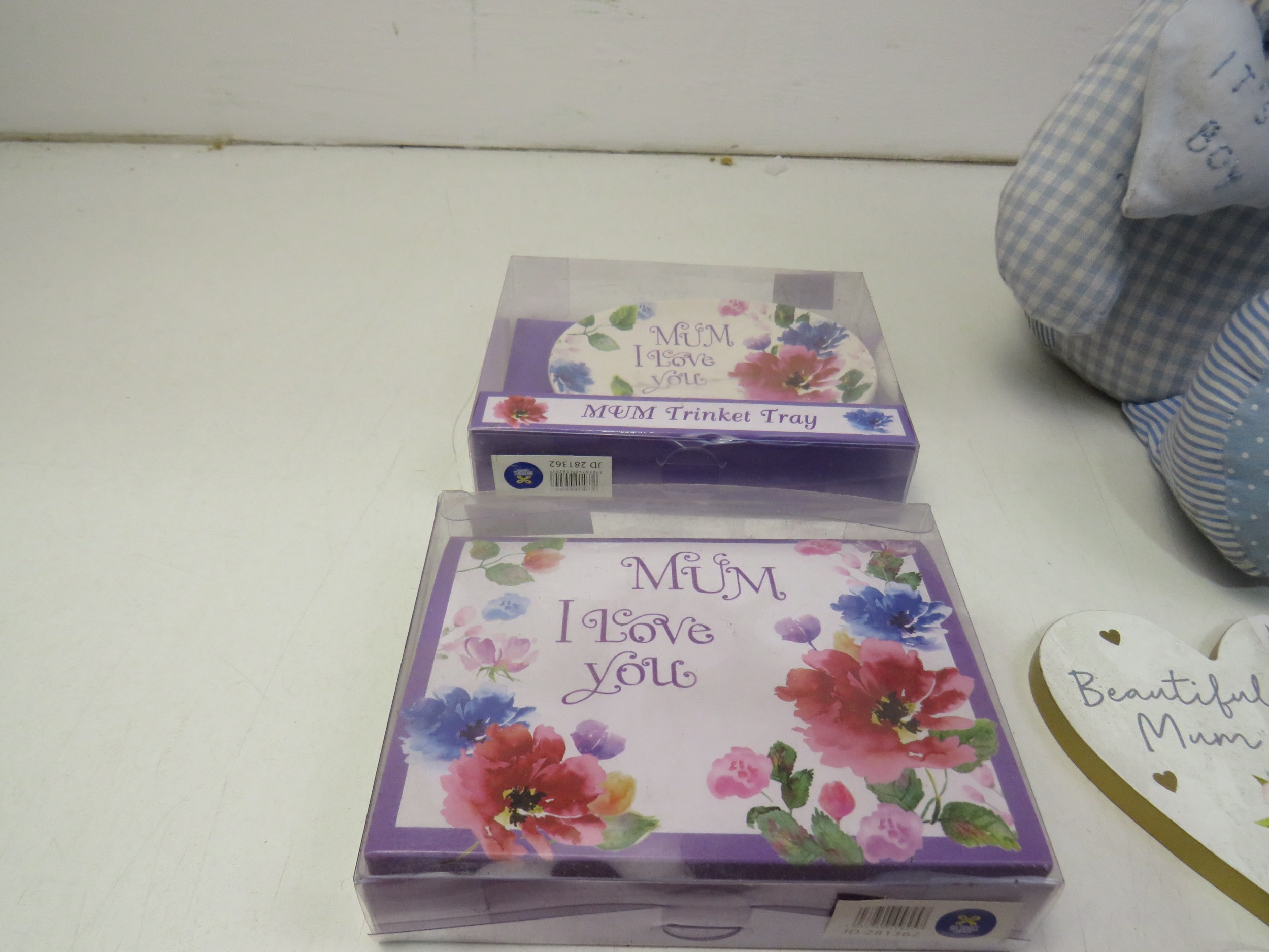 Collection of mum pins and dishes, four wooden trinket boxes and a teddy door stop
