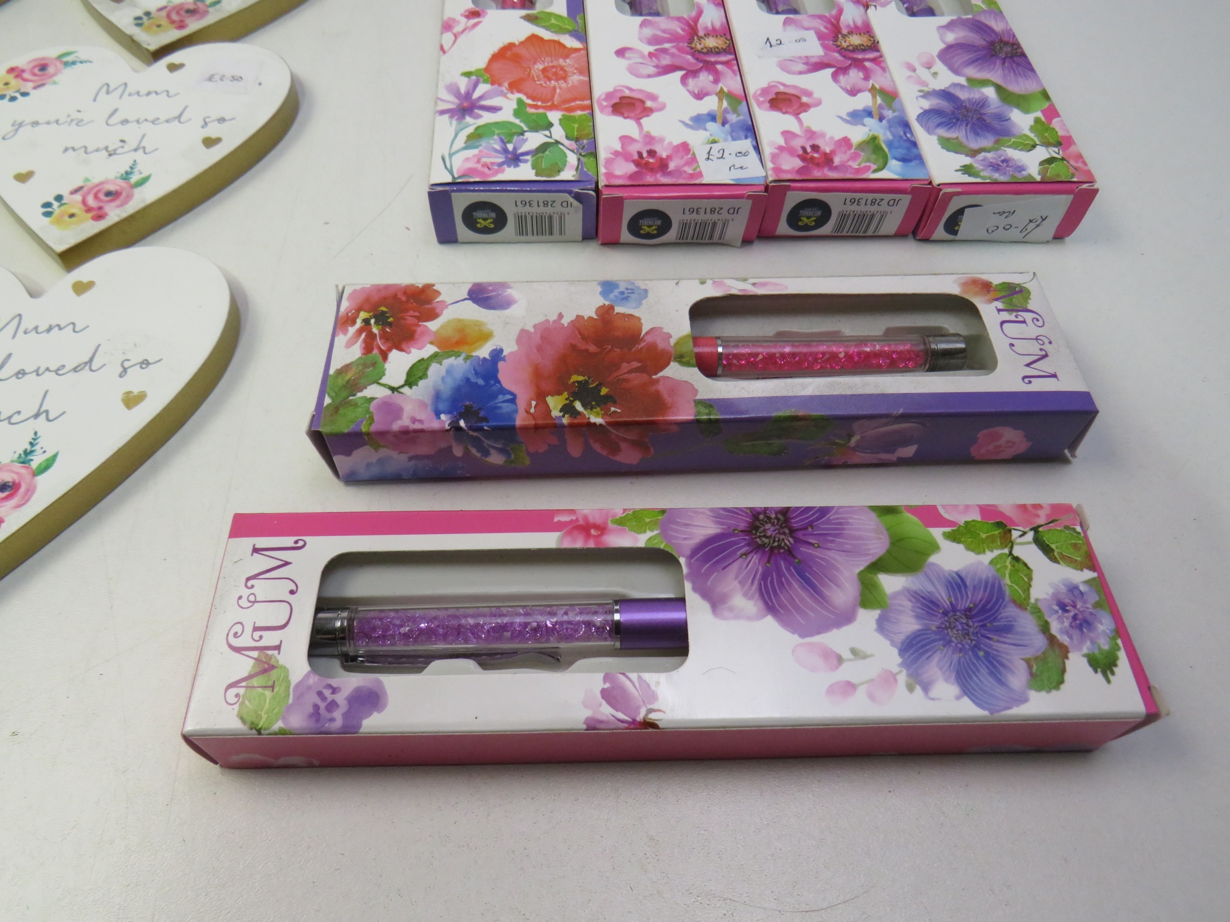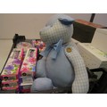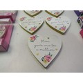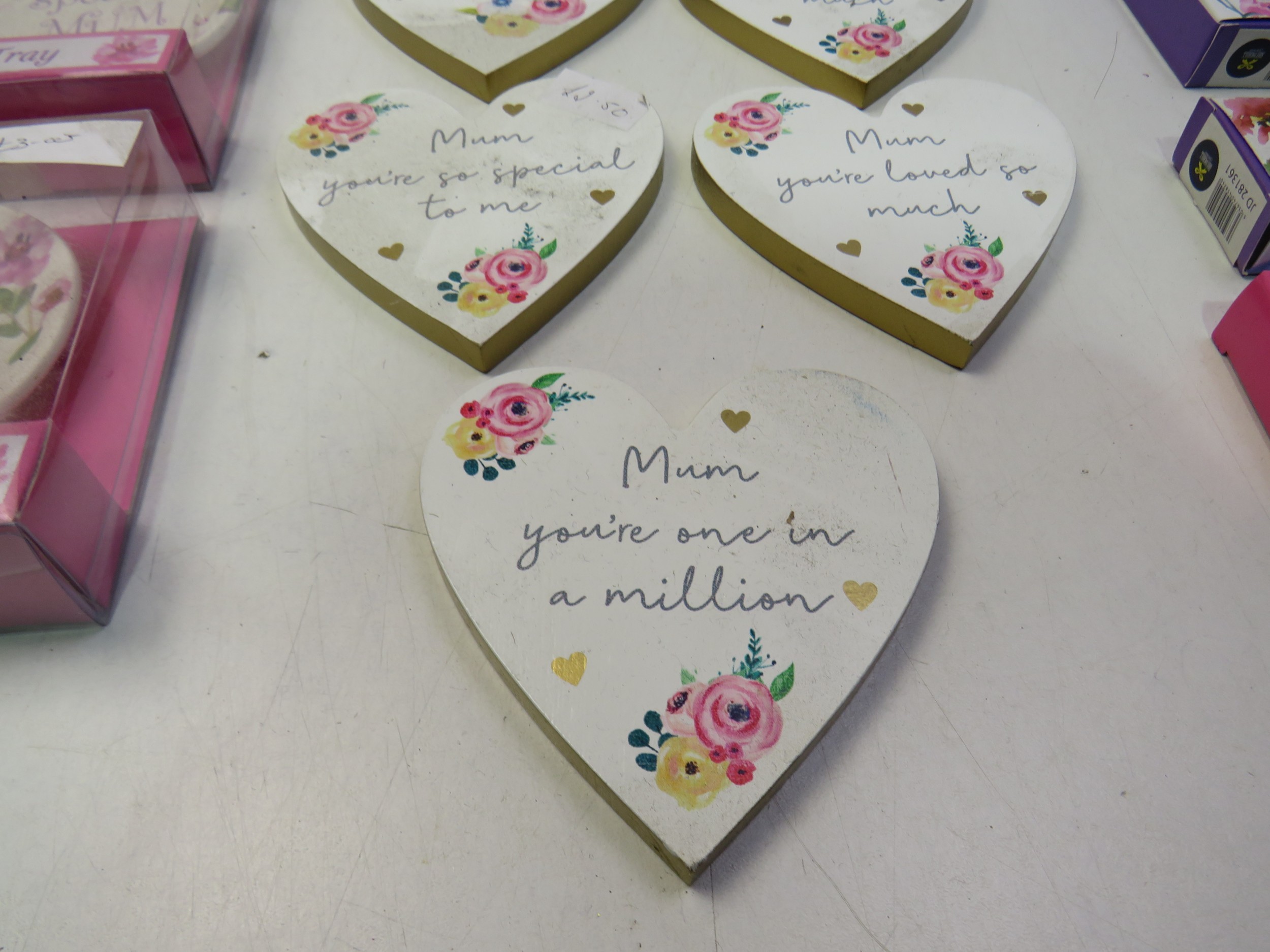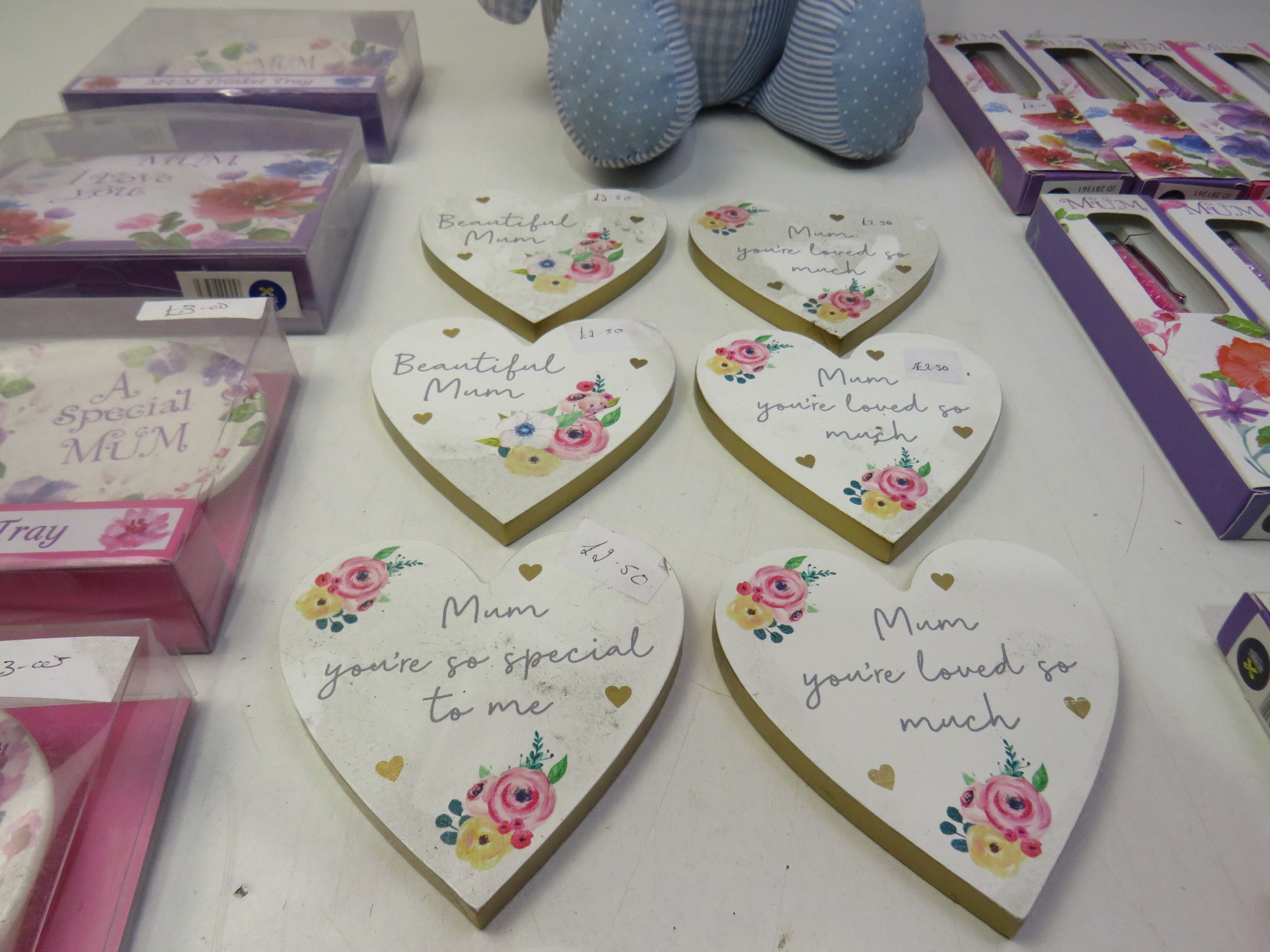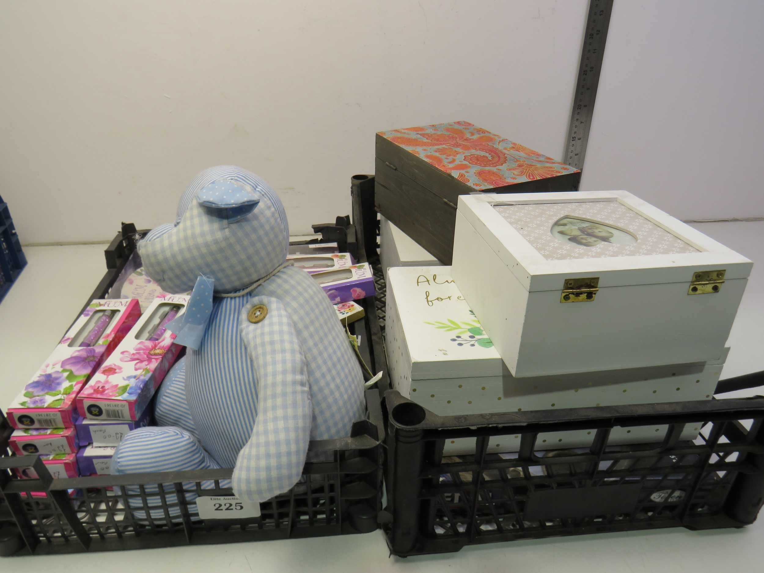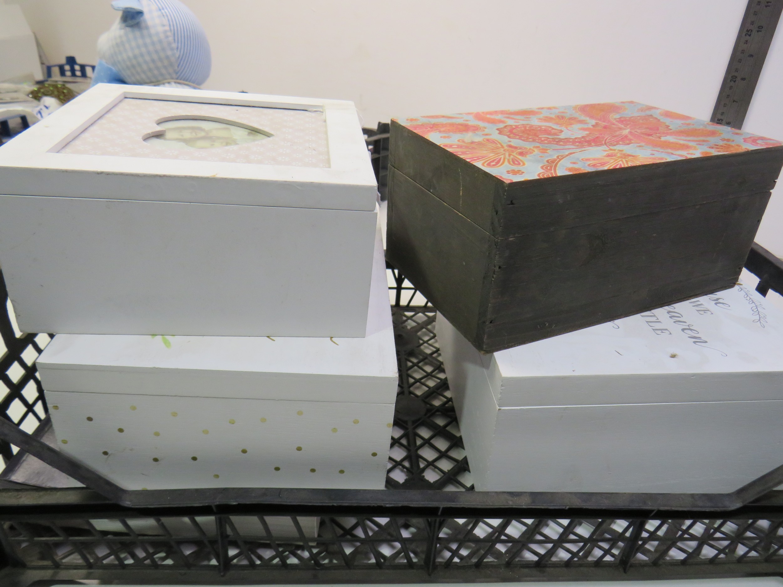 Collection of mum pins and dishes, four wooden trinket boxes and a teddy door stop