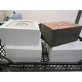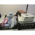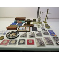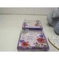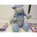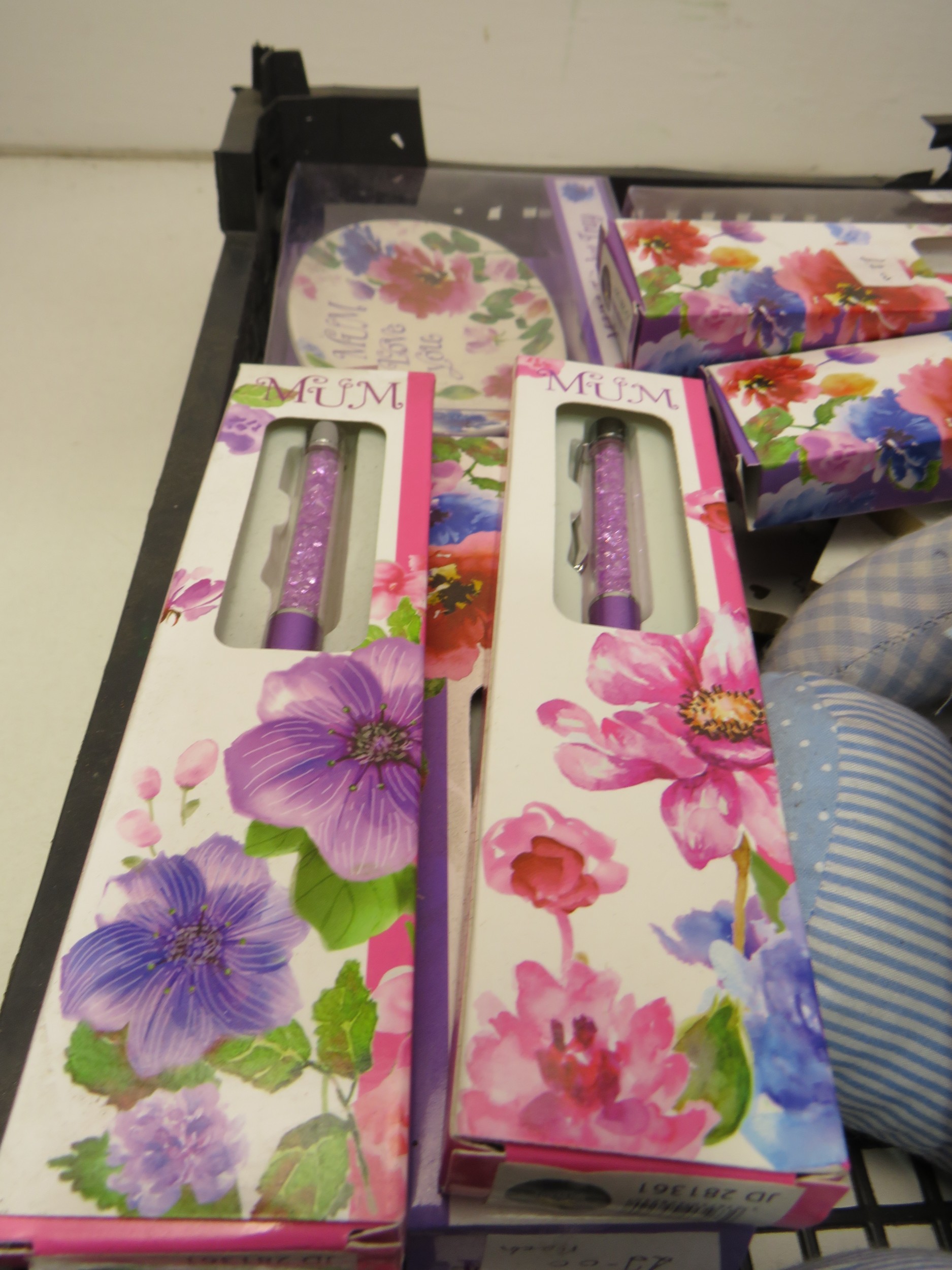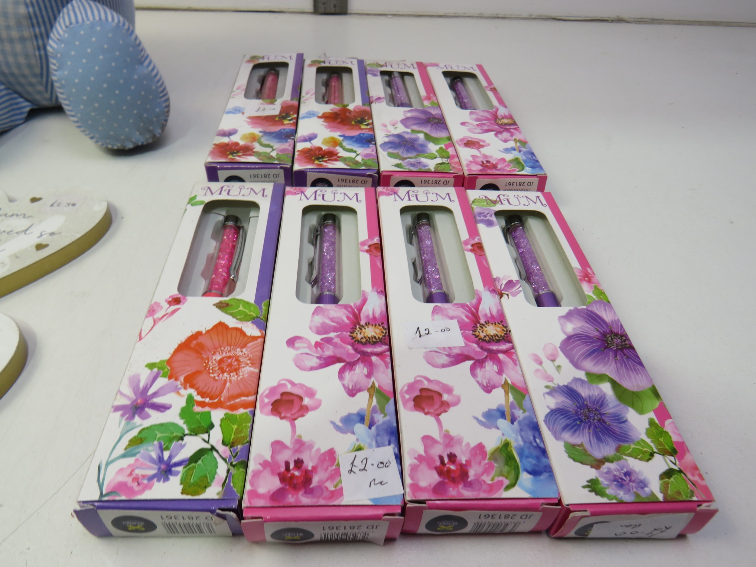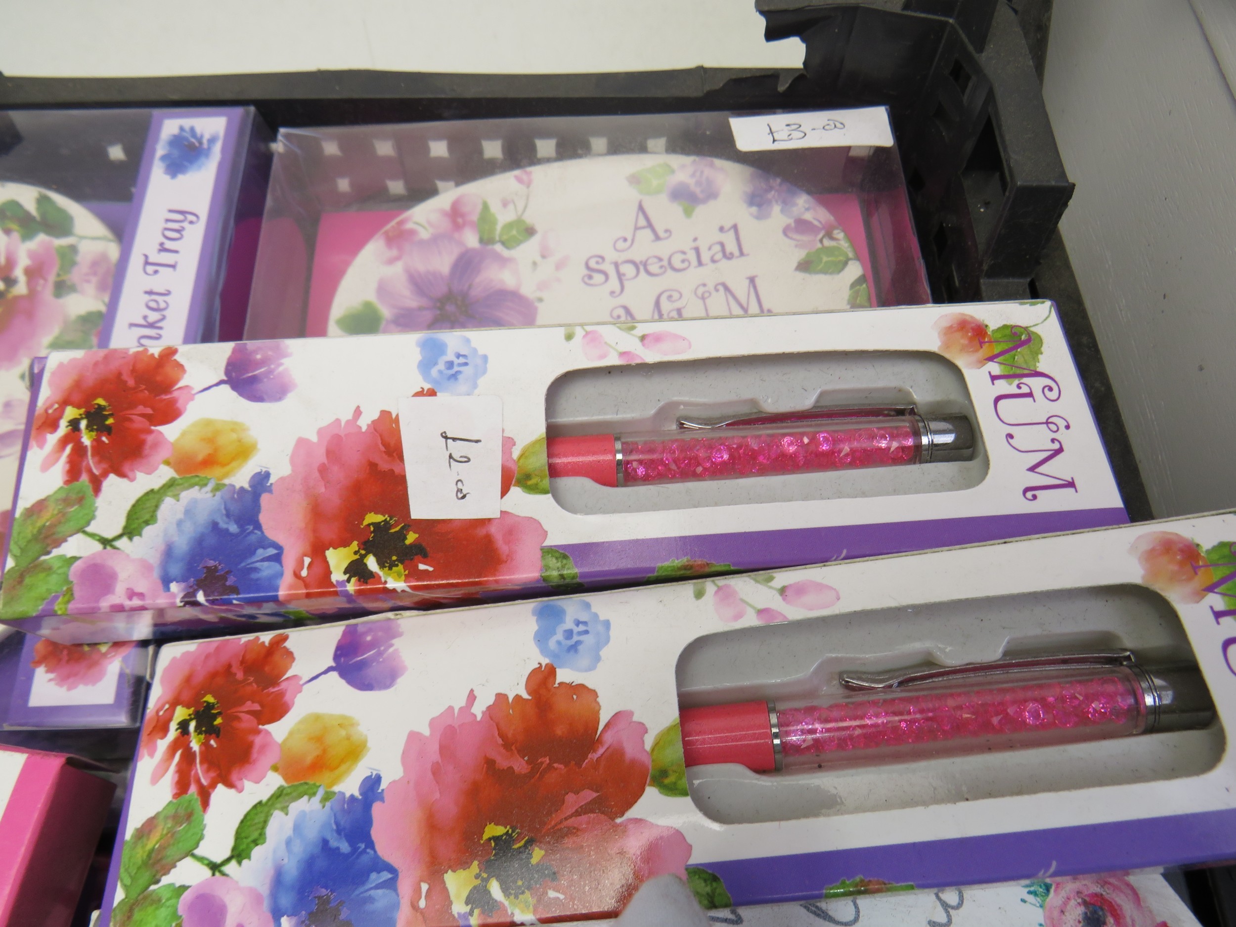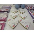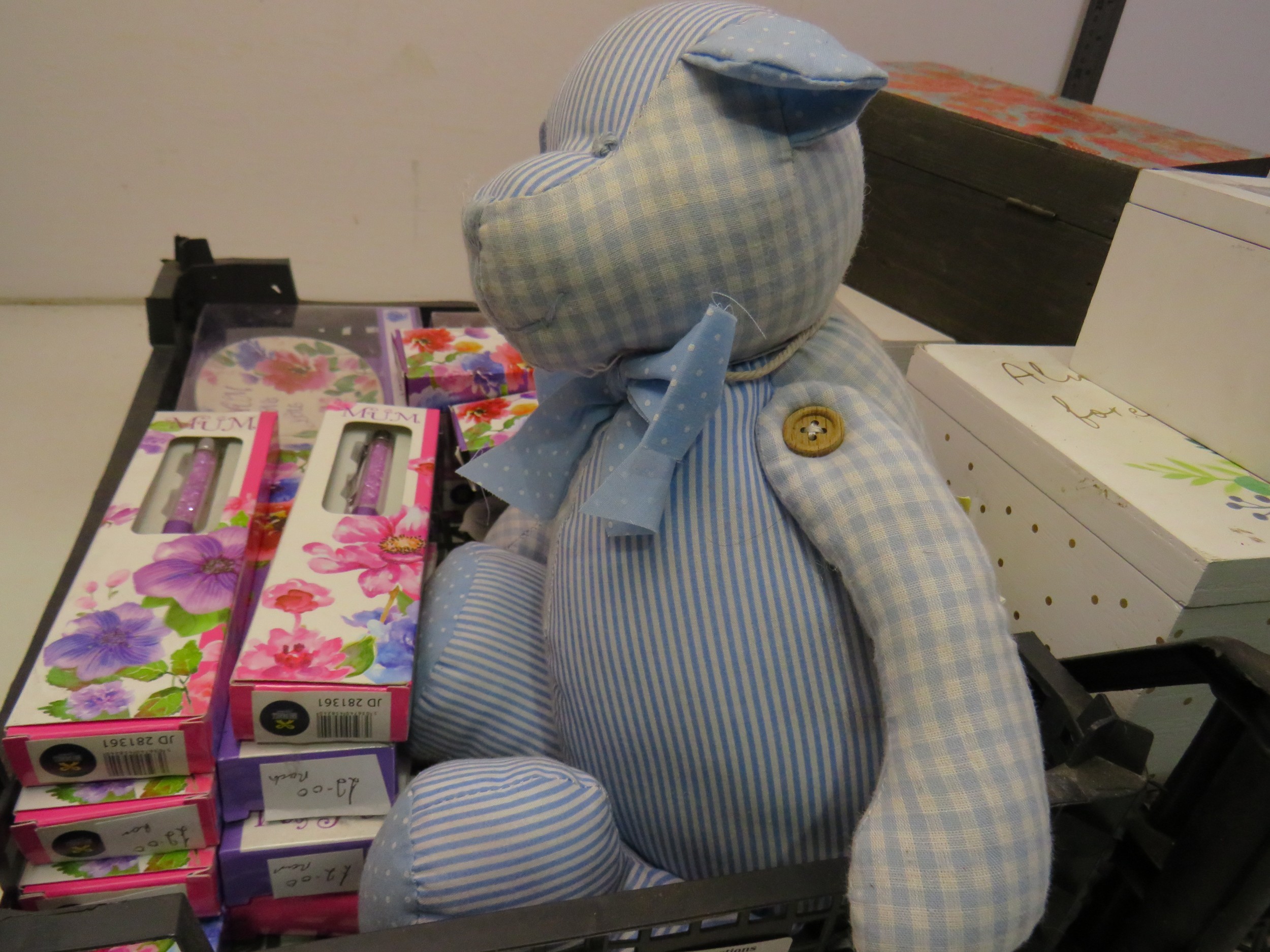 Collection of mum pins and dishes, four wooden trinket boxes and a teddy door stop