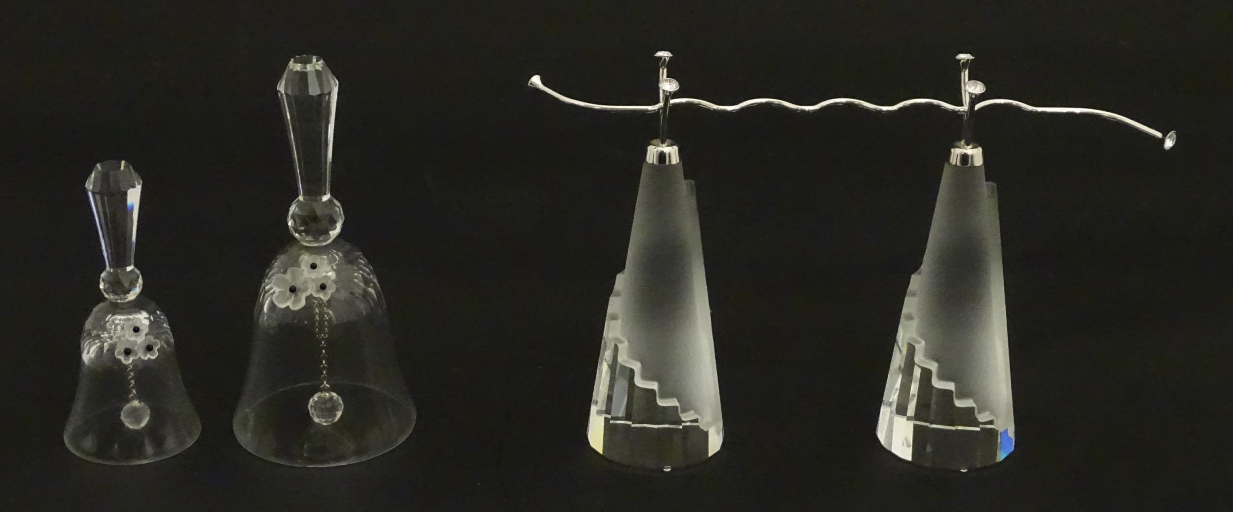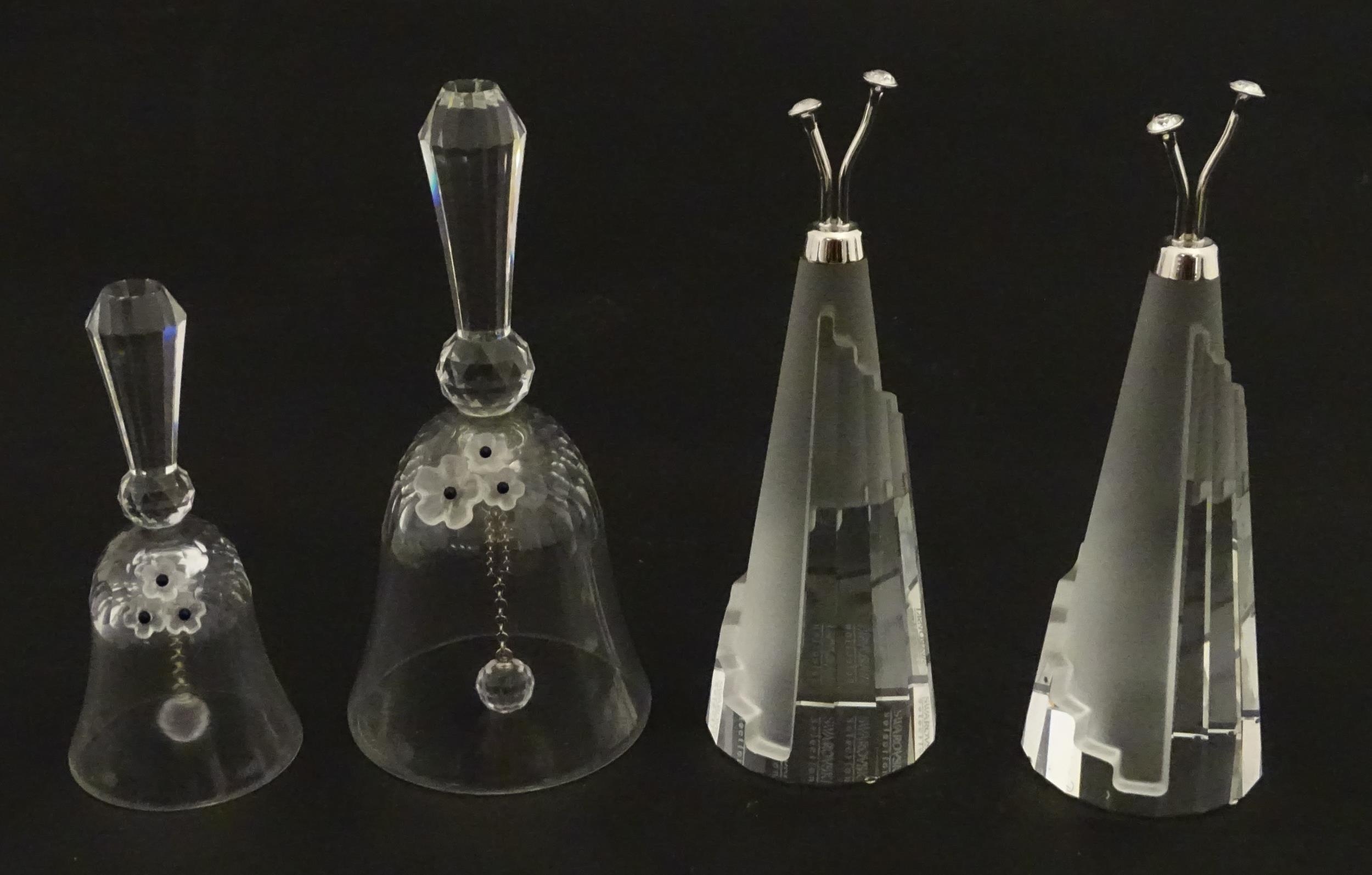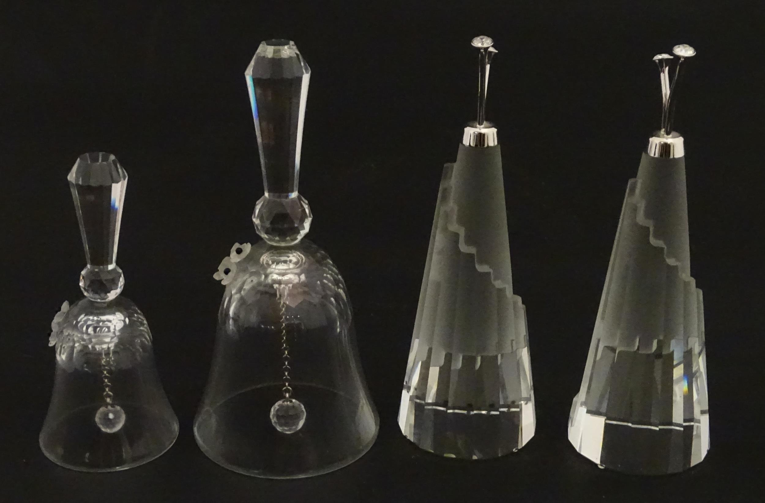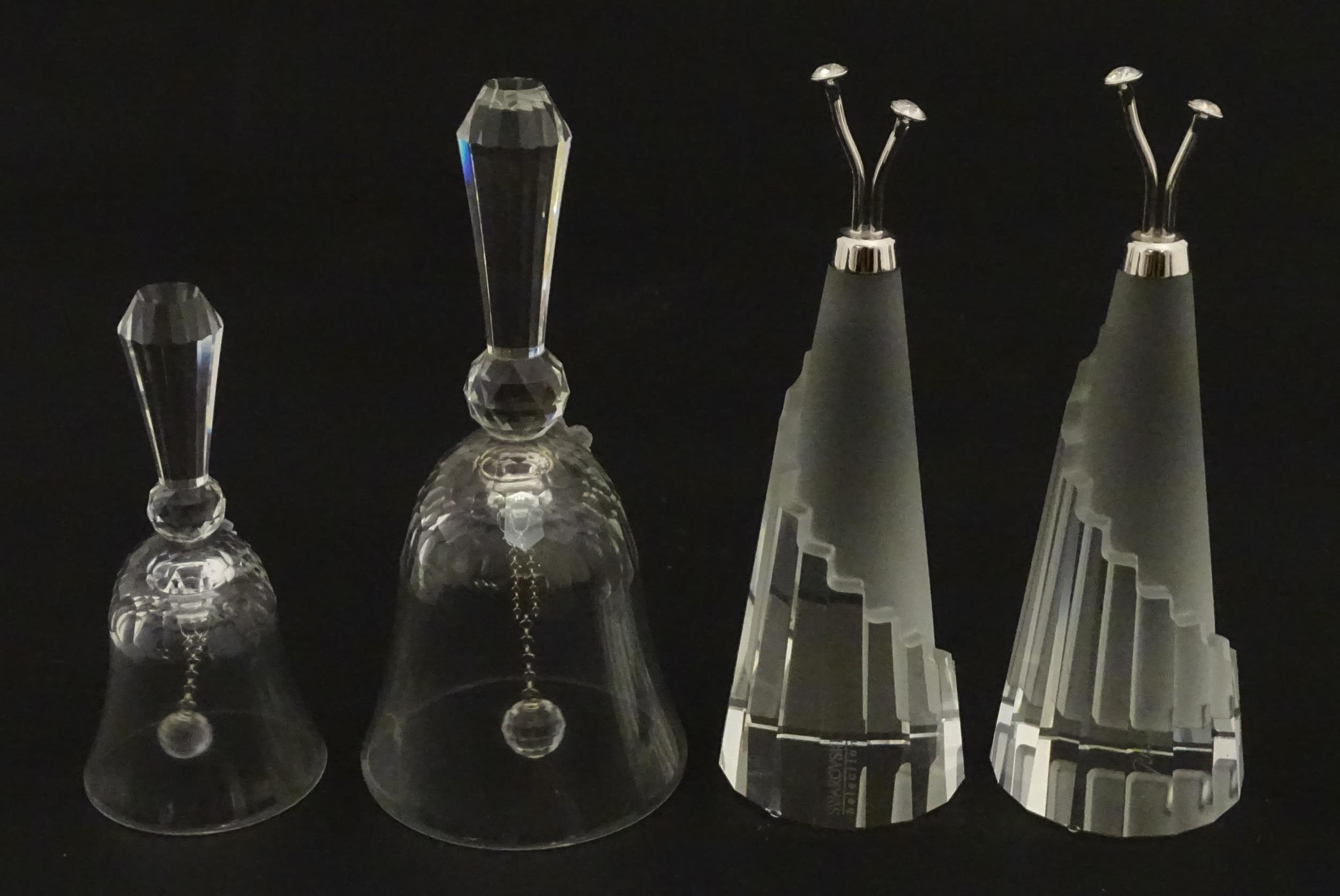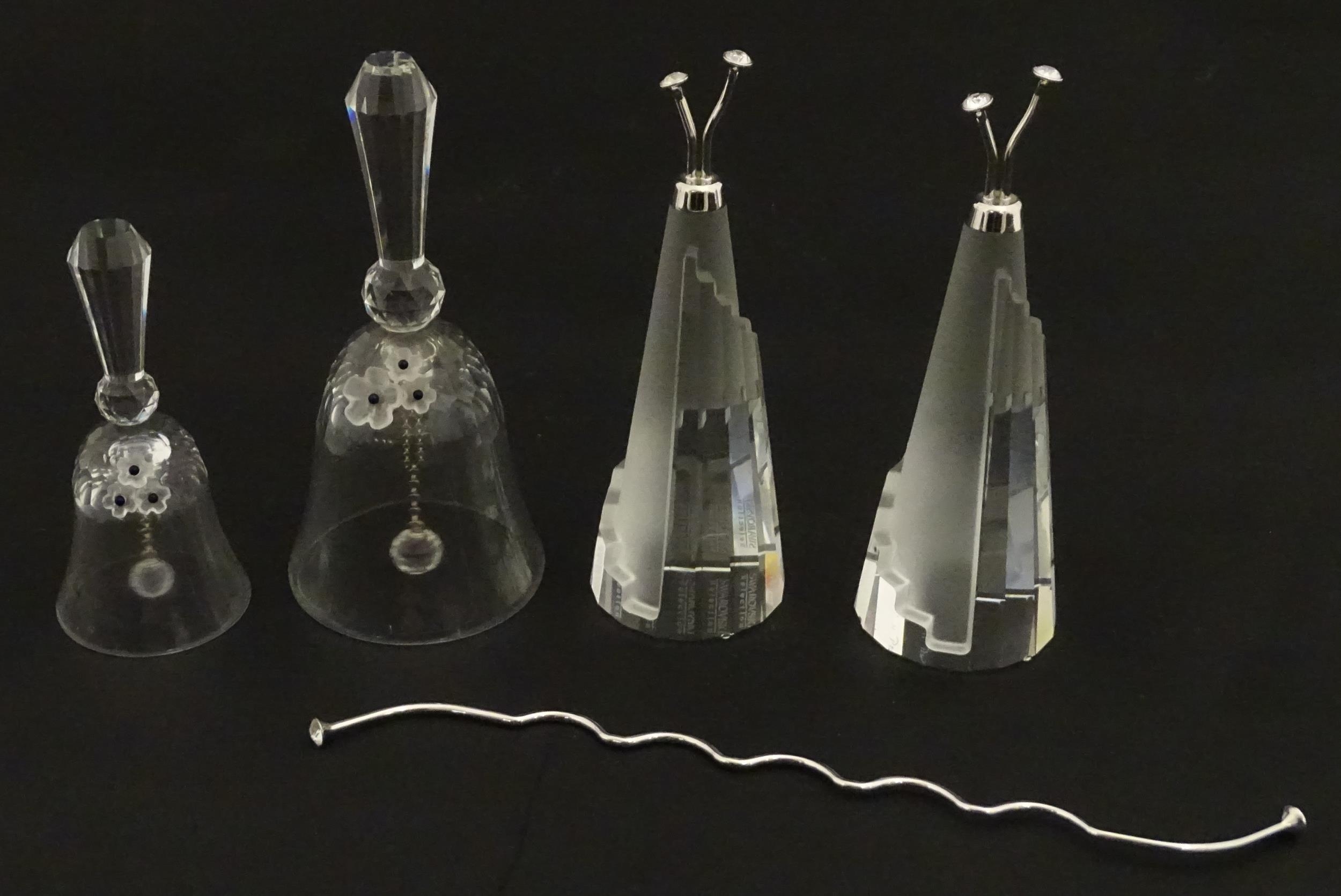 A Swarovski crystal Stalagmite ring holder. Together with two Swarovski crystal bells with flower detail. Largest bell approx. 1 1/2" high