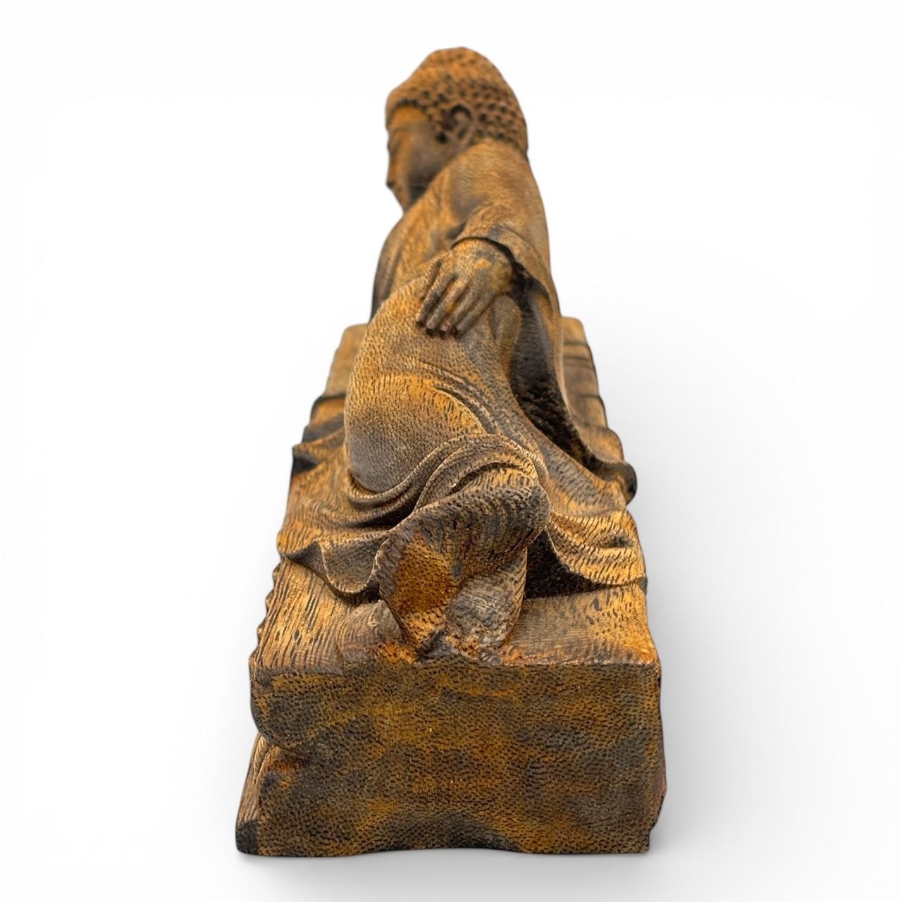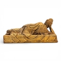 A magnificent Natural agarwood hand carved of a reclining Buddha resting on a lotus platform.
