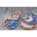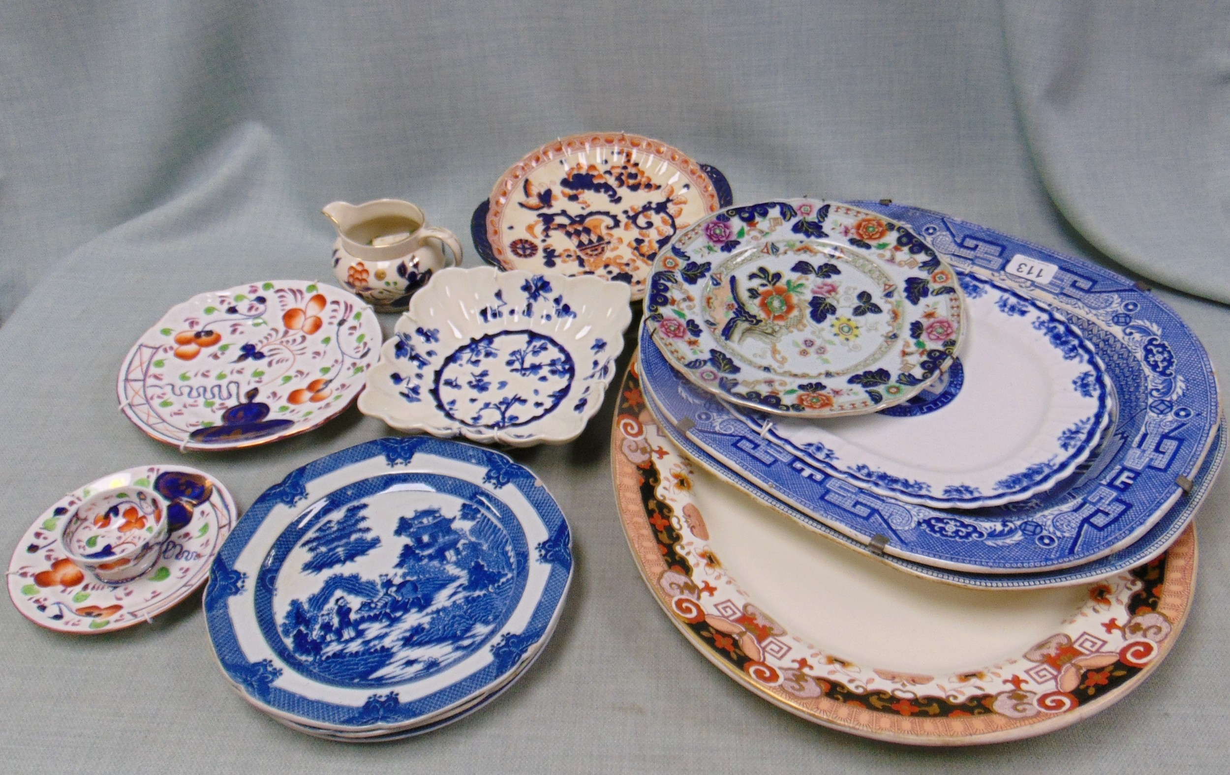 Two willow pattern meat plates, gaudy Welsh dish, blue and white bowl, etc.