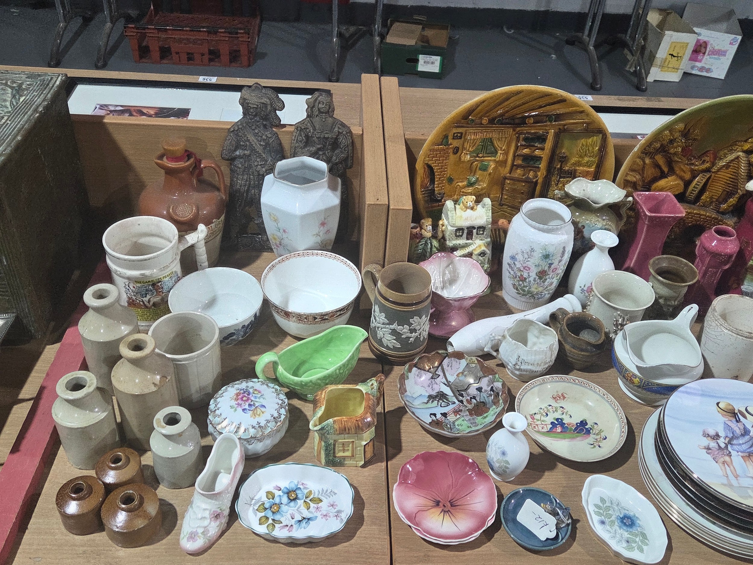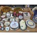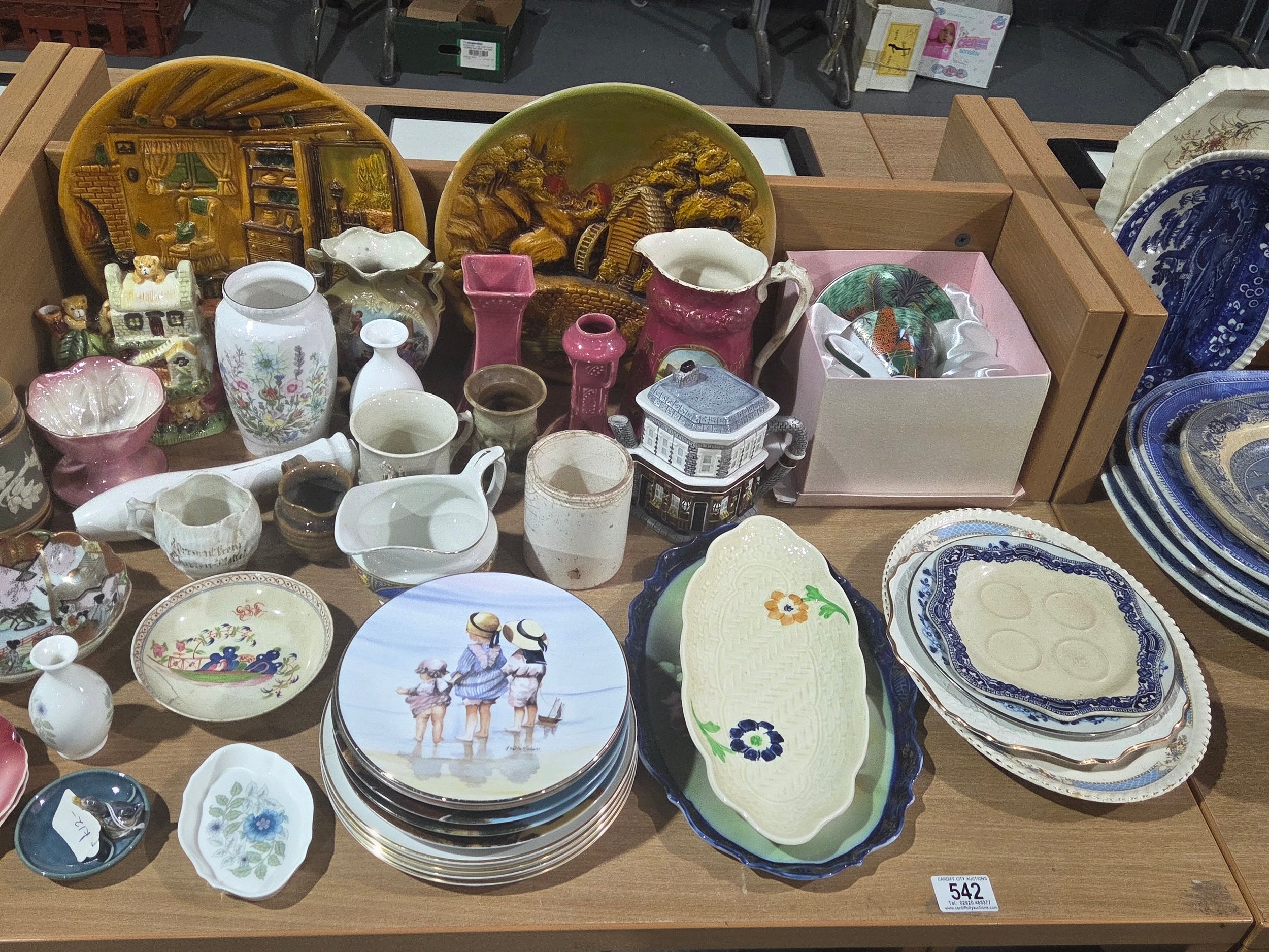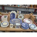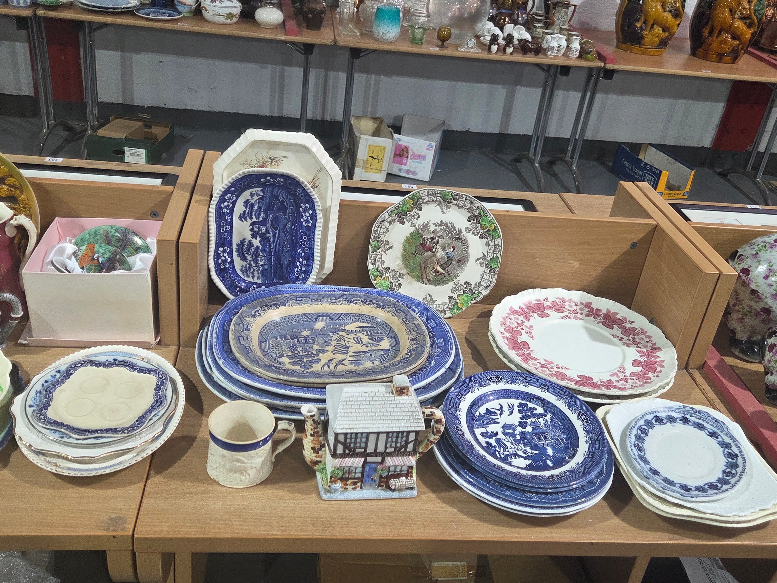 Decorative china to include blue and white meat platters, Wedgwod, Wade, earthenware pots etc