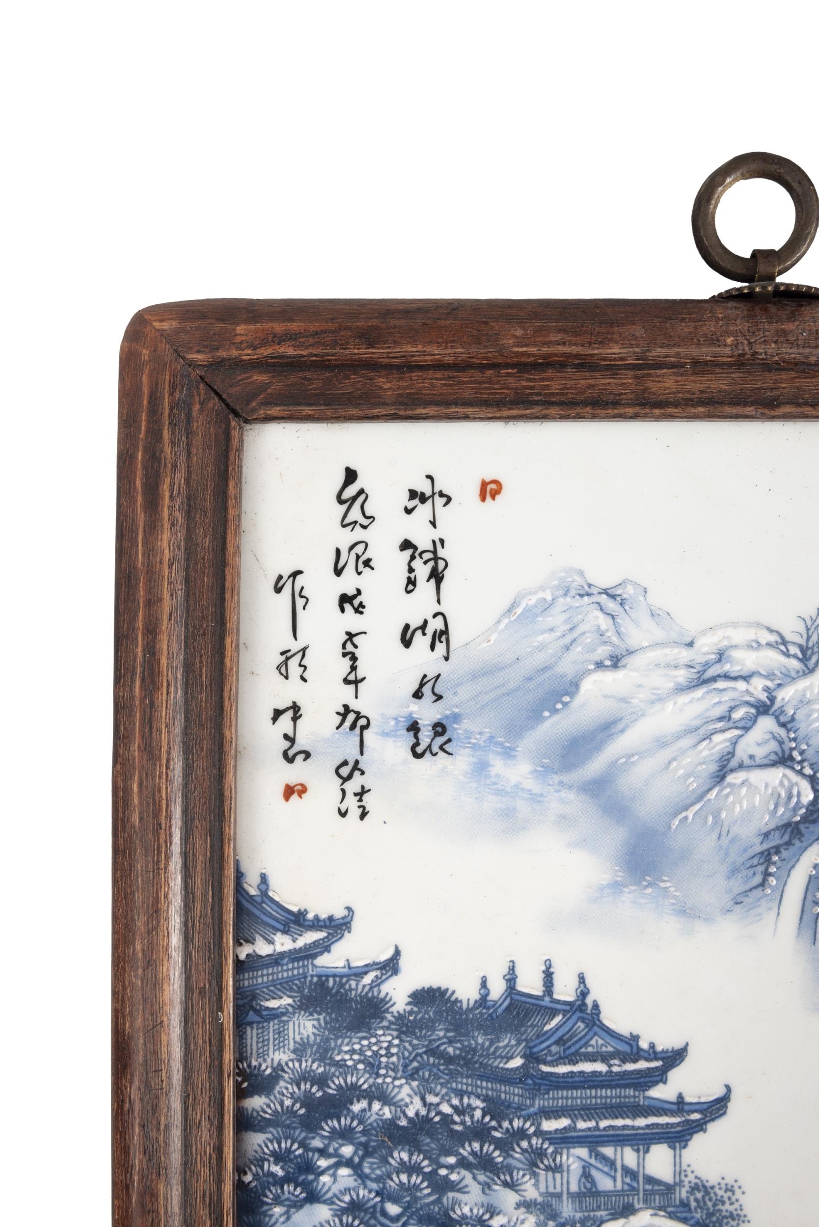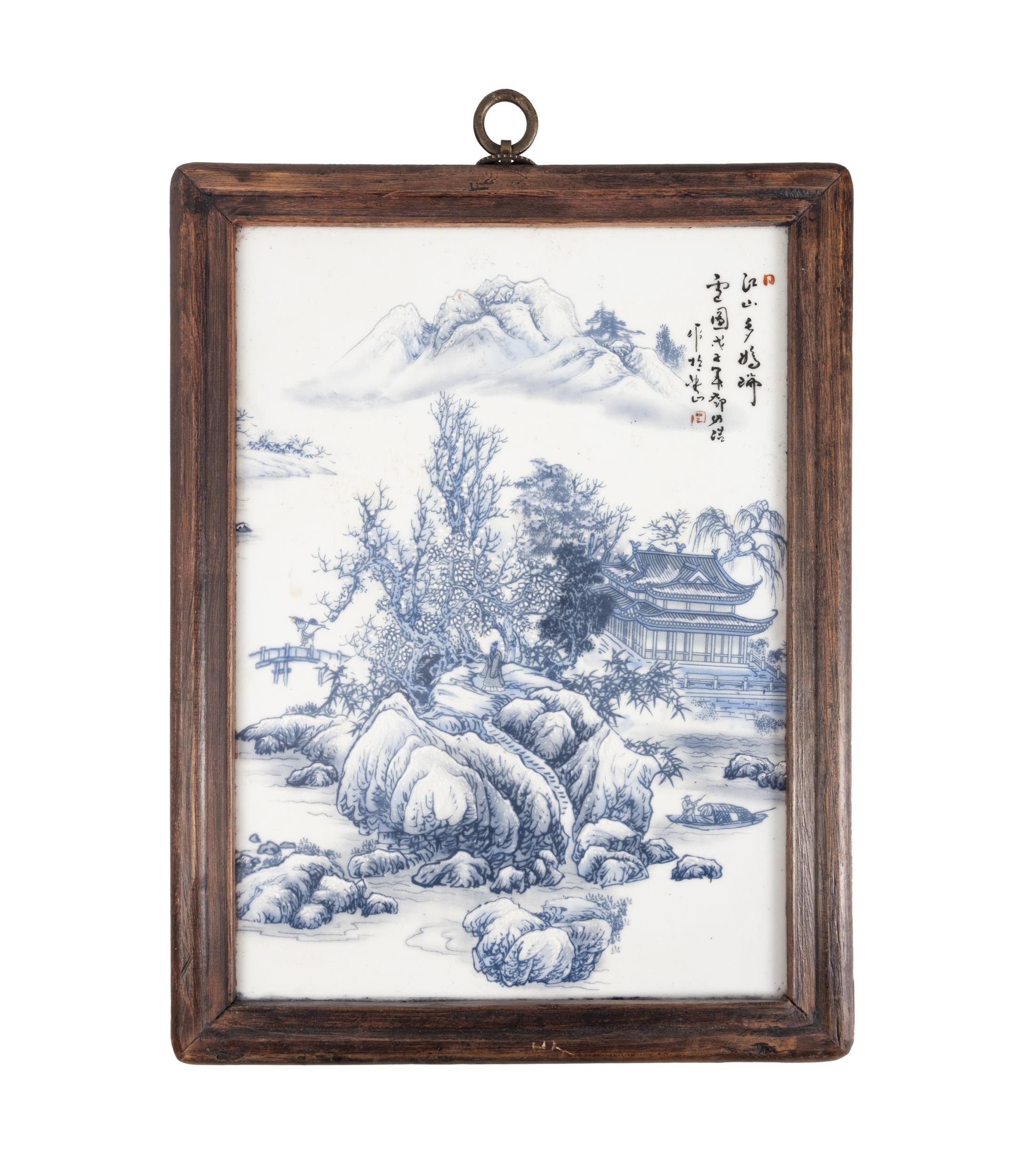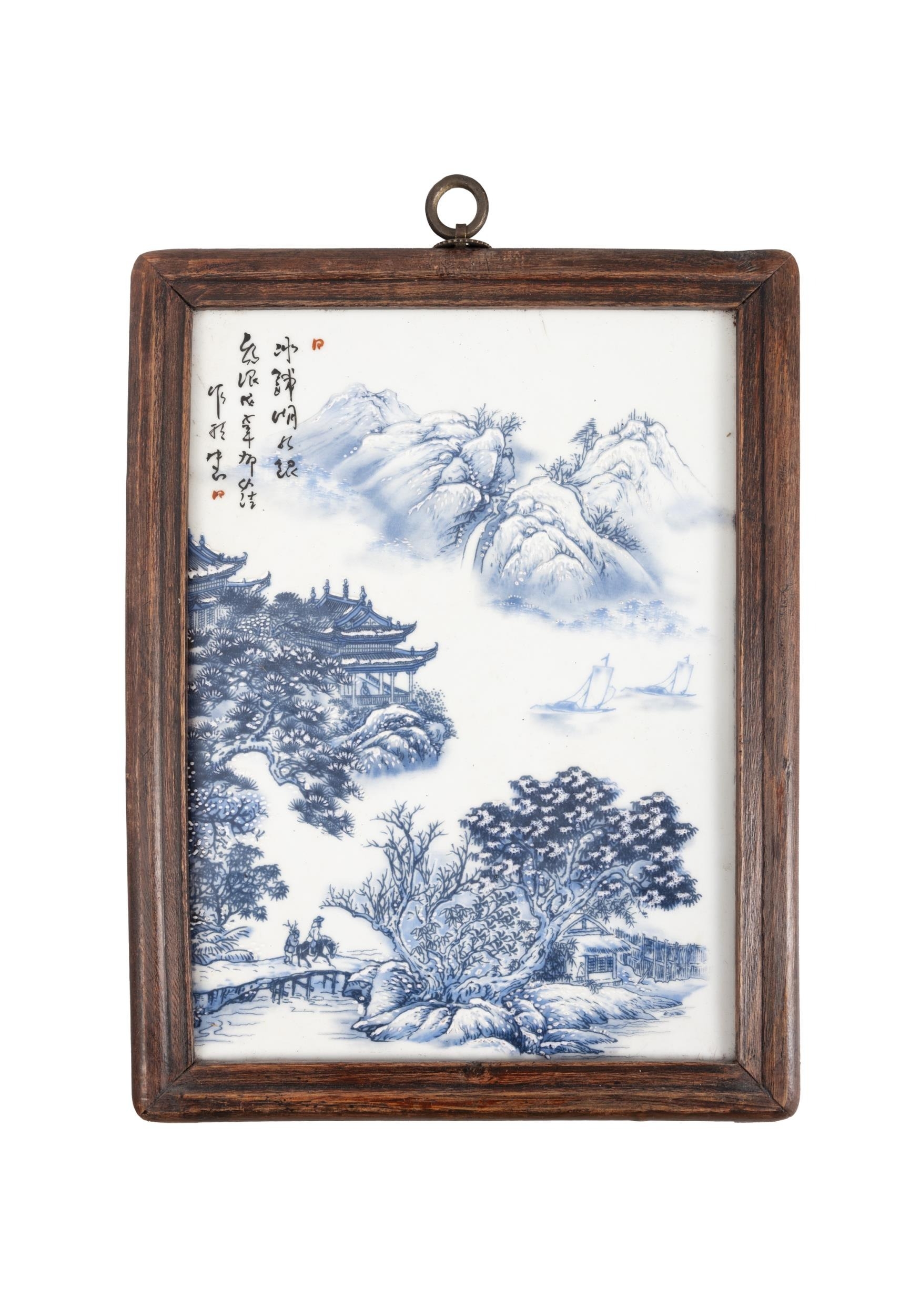 A SET OF FOUR FRAMED BLUE AND WHITE LANDSCAPE PANELS ??????? ???????????? China, second half of 20th century Size: 29 x 20cm (each) (4)