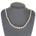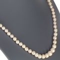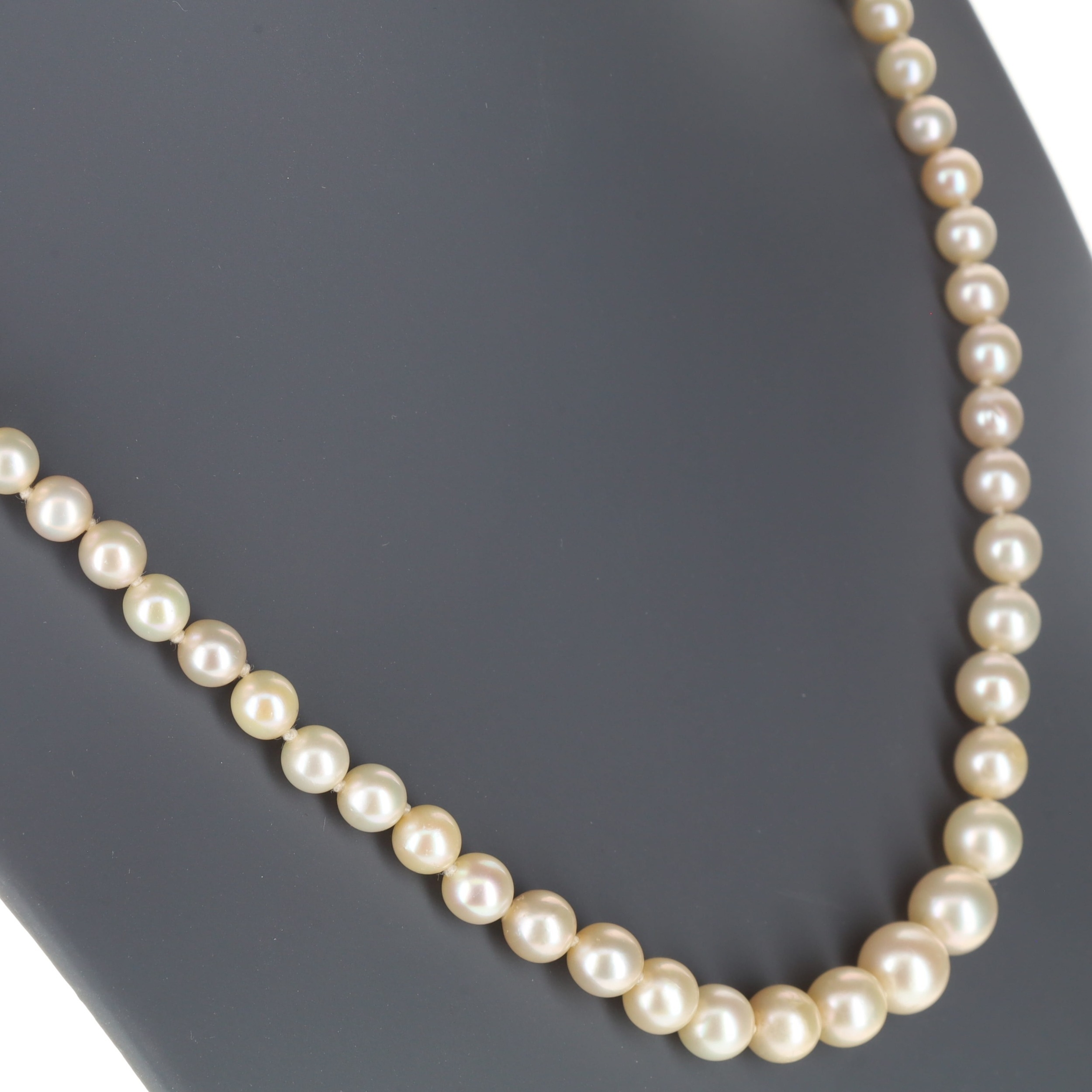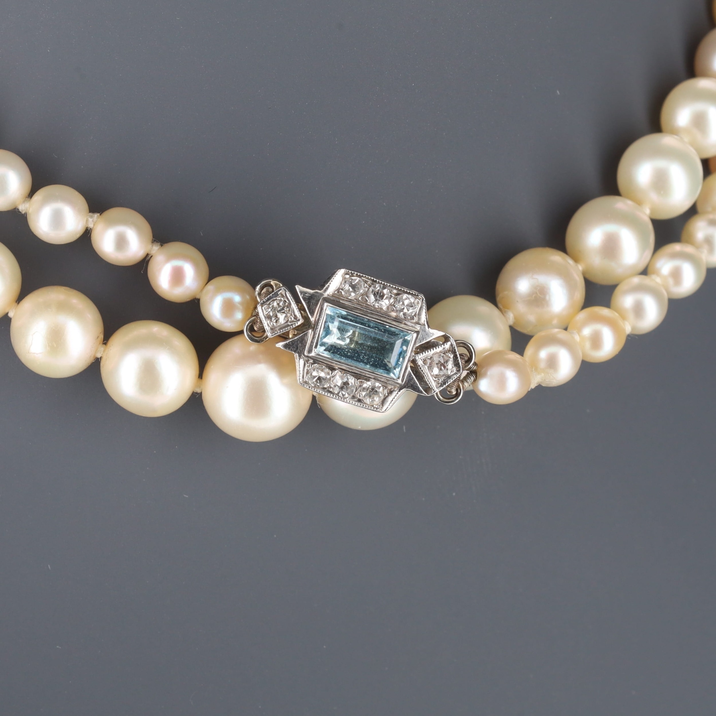 Diamond and Aquamarine Clasped Cultured Saltwater Pearl Necklace. This clasp has been tested as 9ct gold. The necklace measures approximately 53cm in length with the largest pearl 7mm in diameter. The piece weighs in total 22.9g.