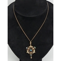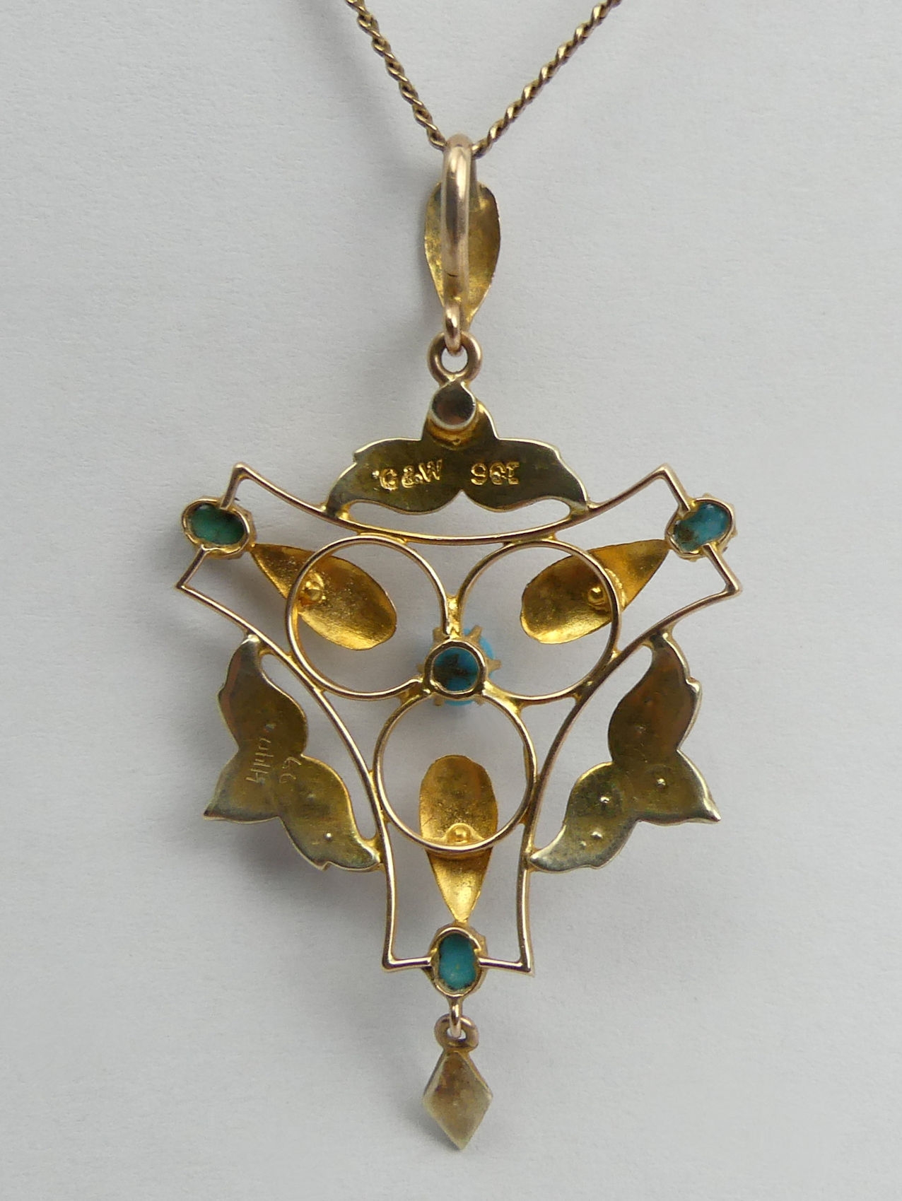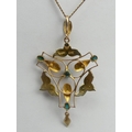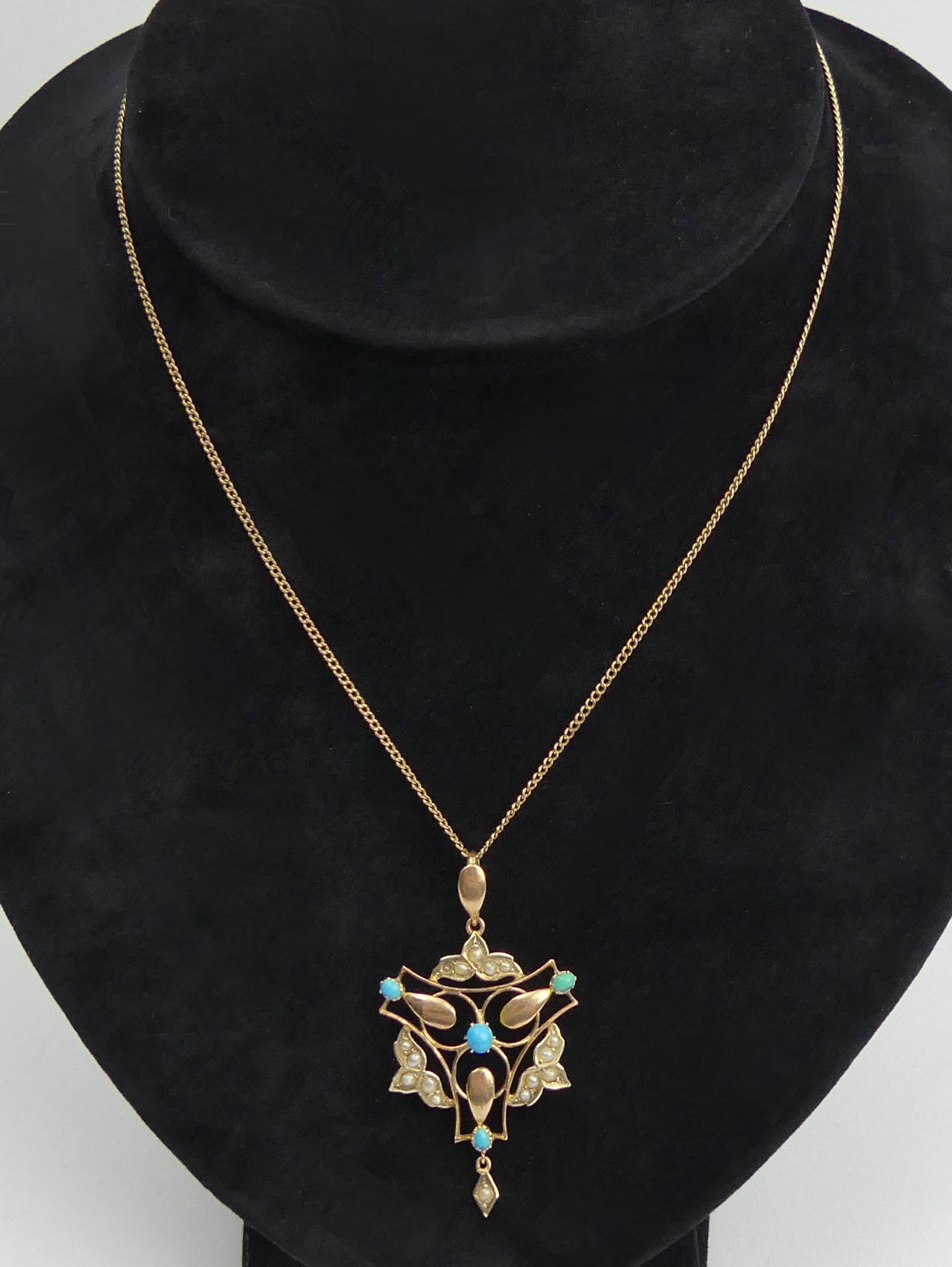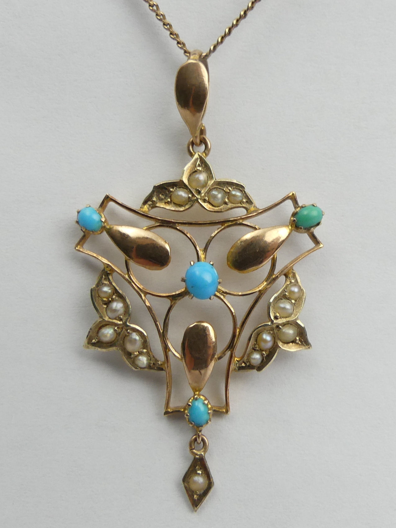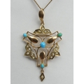 9ct gold, turquoise and seed pearl pendant and chain,
