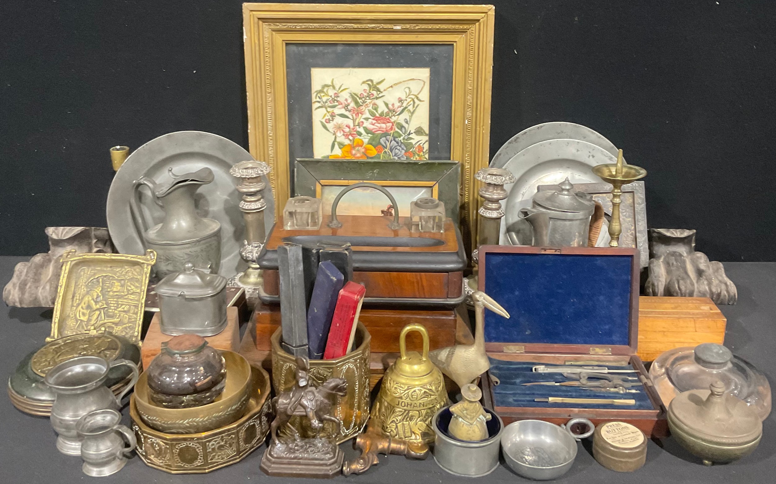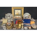 Boxes and Objects - 18th century pewter plates; straight or cut-throat razors; 19th century brass candlesticks; an Israeli circular brass box and cover; an Edwardian oak artist's box; other boxes, Victorian and later; etc, qty