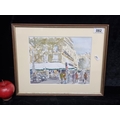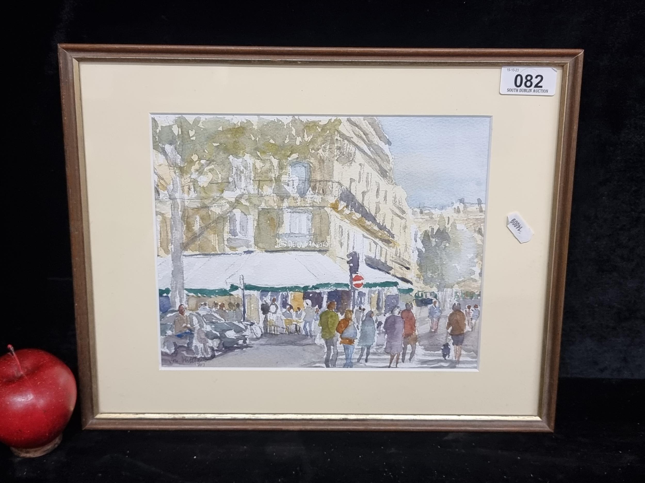 An original watercolour on paper painting of a Parisian street scene. Features loose but confident washes of colour. Signed indistinctly bottom left and dating to 2013. Housed in a wood and gilt frame.