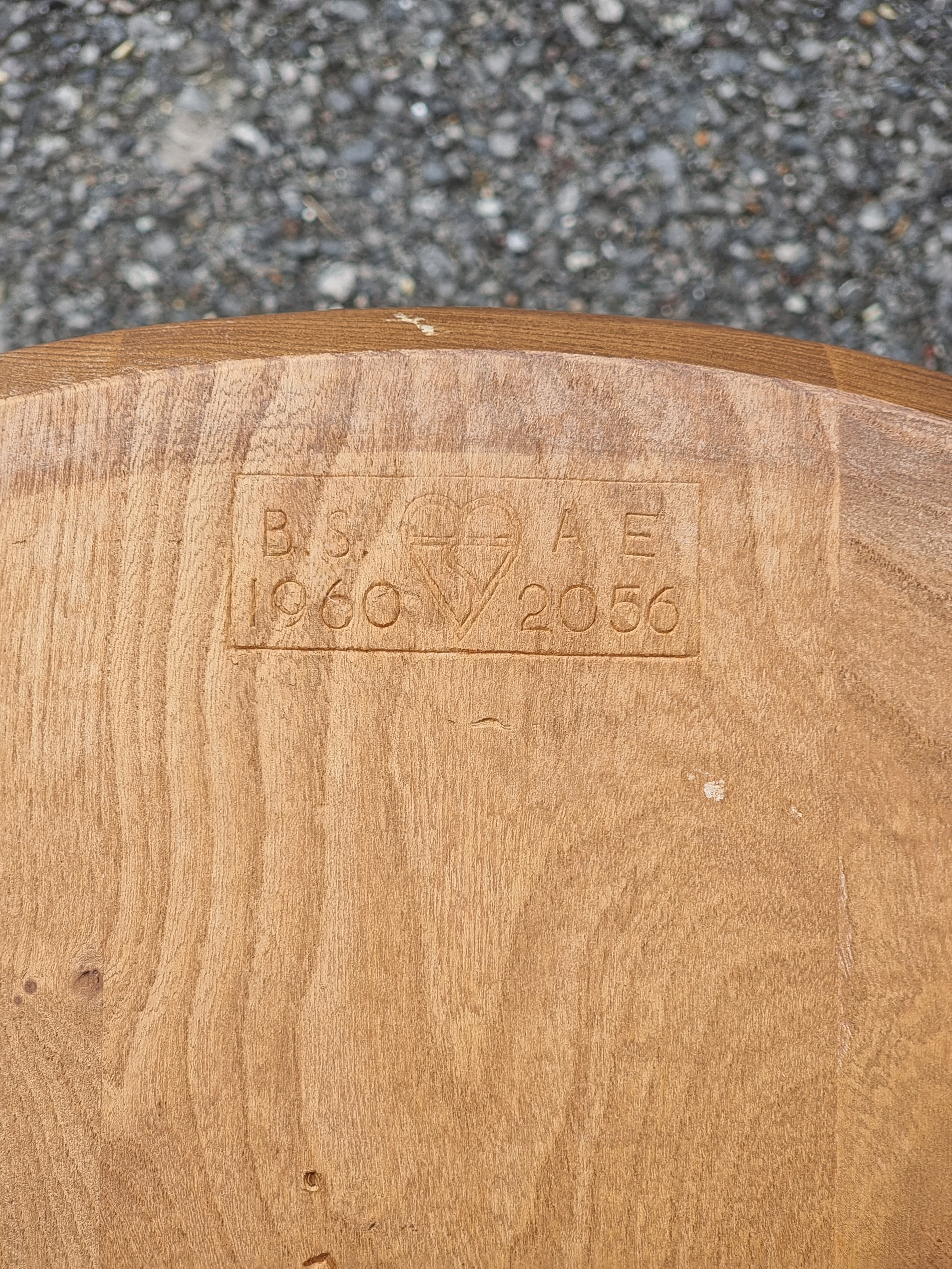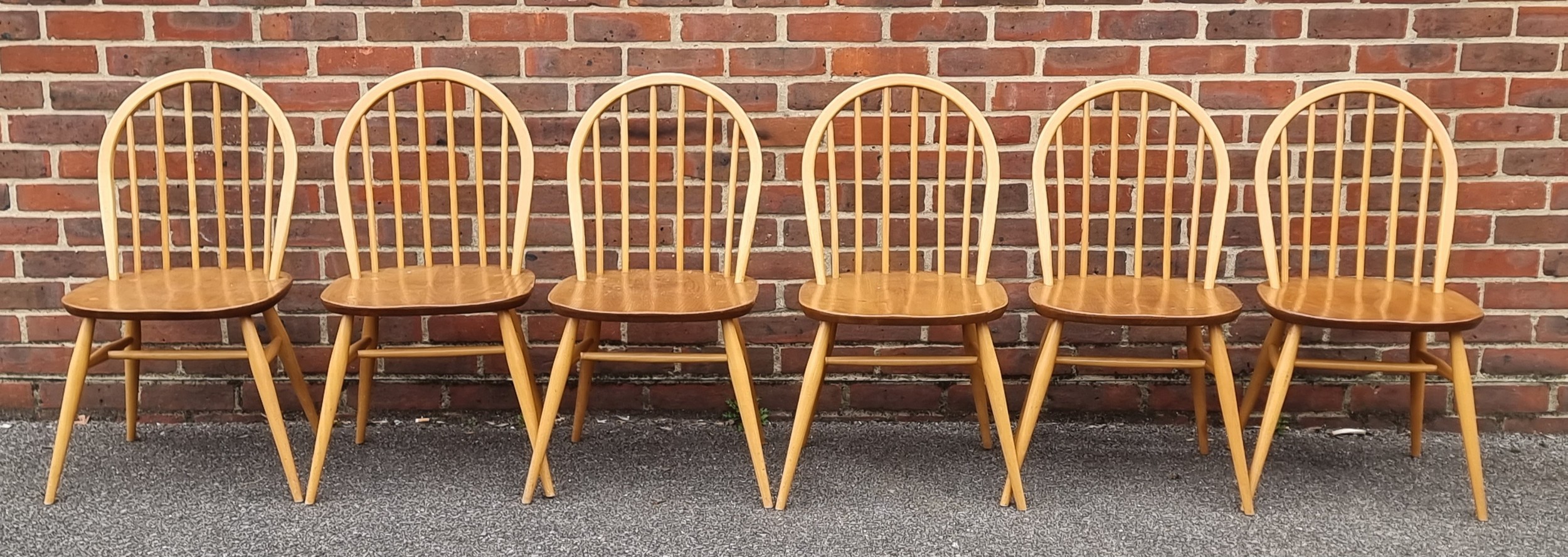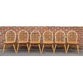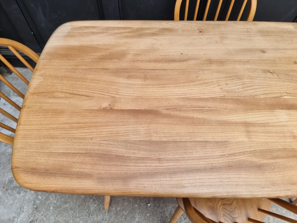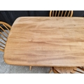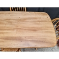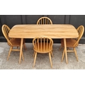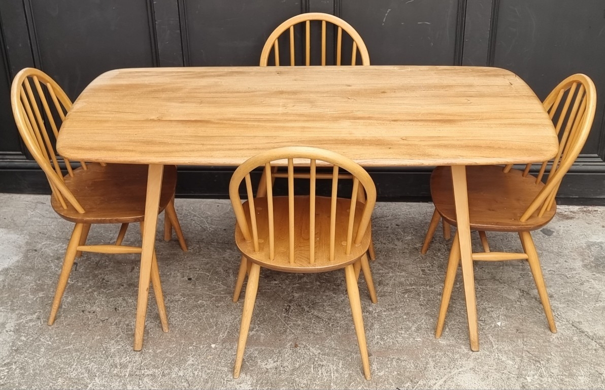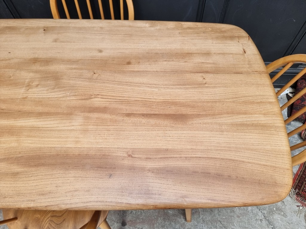 A mid-century Ercol blonde dining suite, comprising: a Windsor table, 152cm long; and a set of six '370' chairs.
