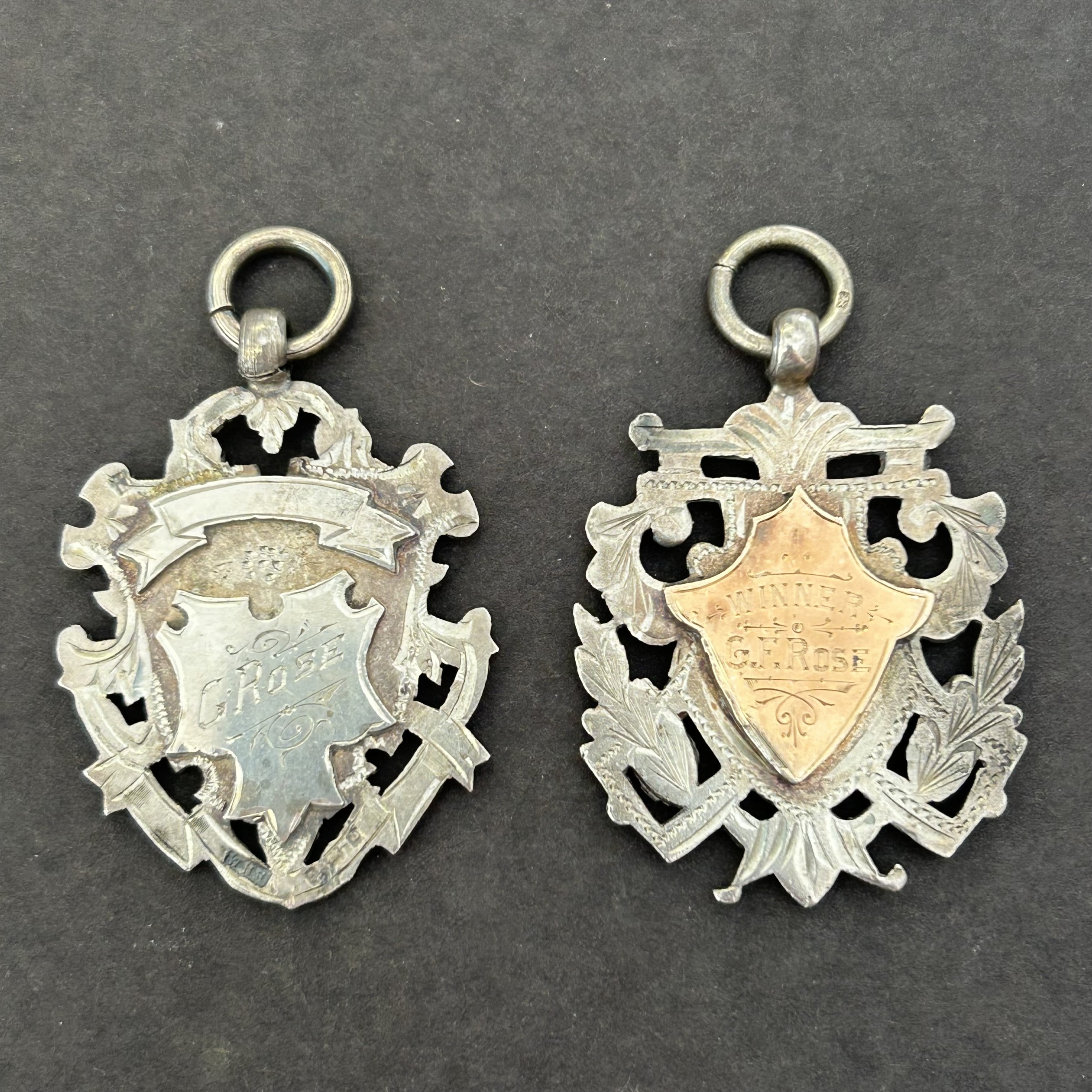 Two hallmarked silver swimming prize fob medals, both named to G Rose, circa 1901/02, combined weight approx. 30g