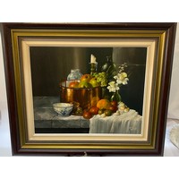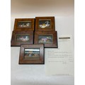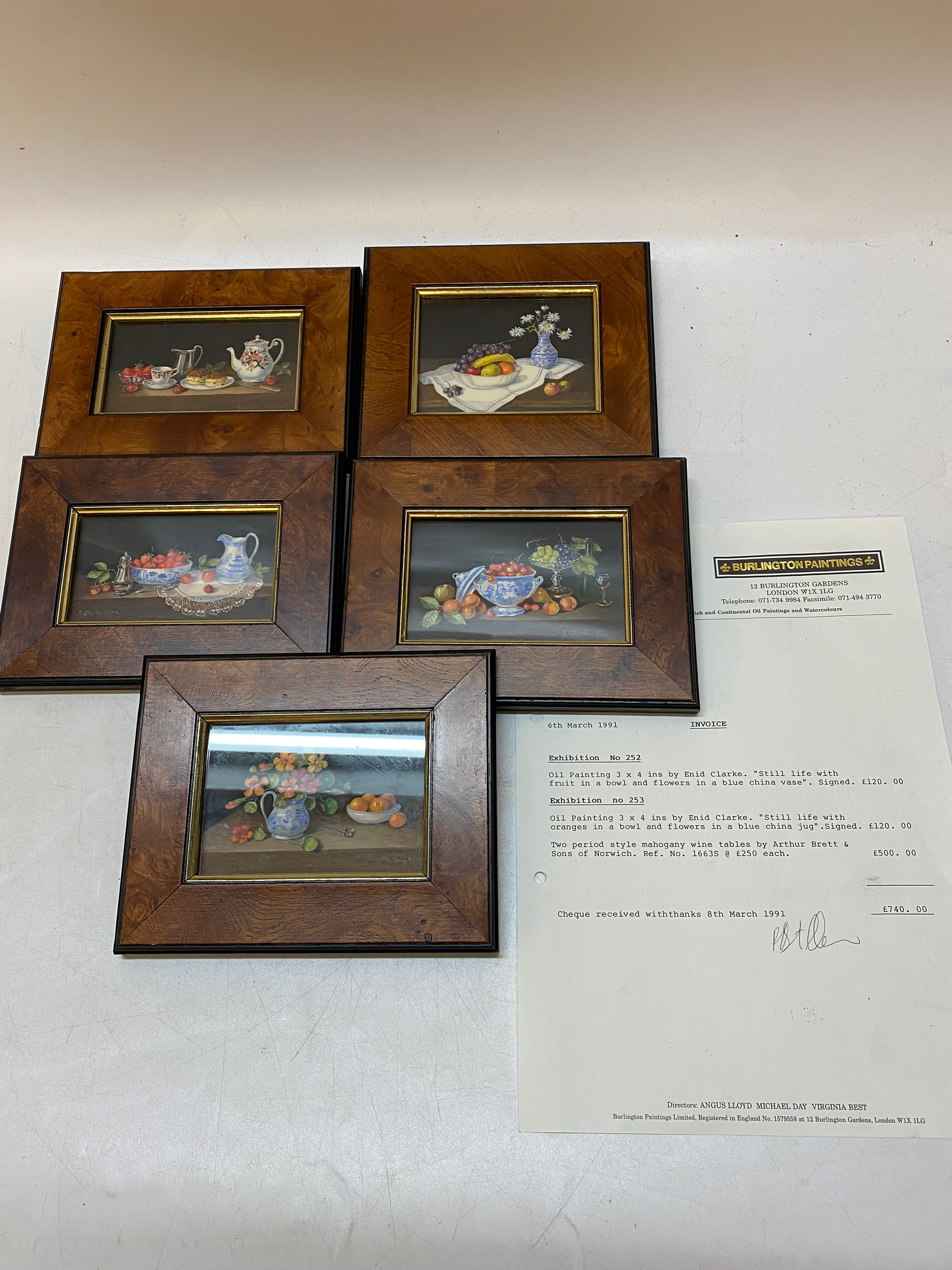 Enid Clarke. Five small oils - Still life of flowers and food, in birds eye walnut veneered frames and glazed - 3in. x 4in. and 2 1/4in. x 4in.