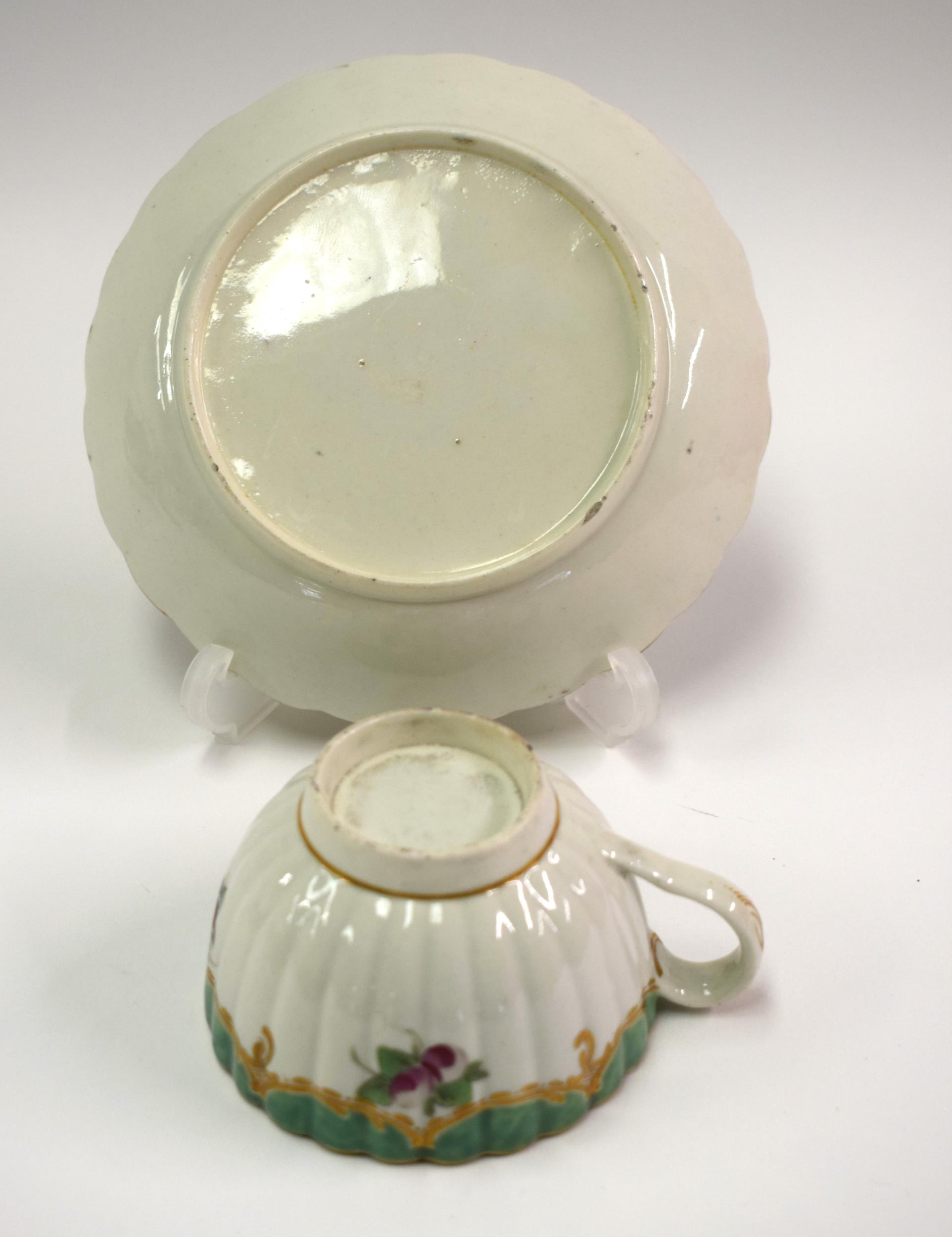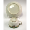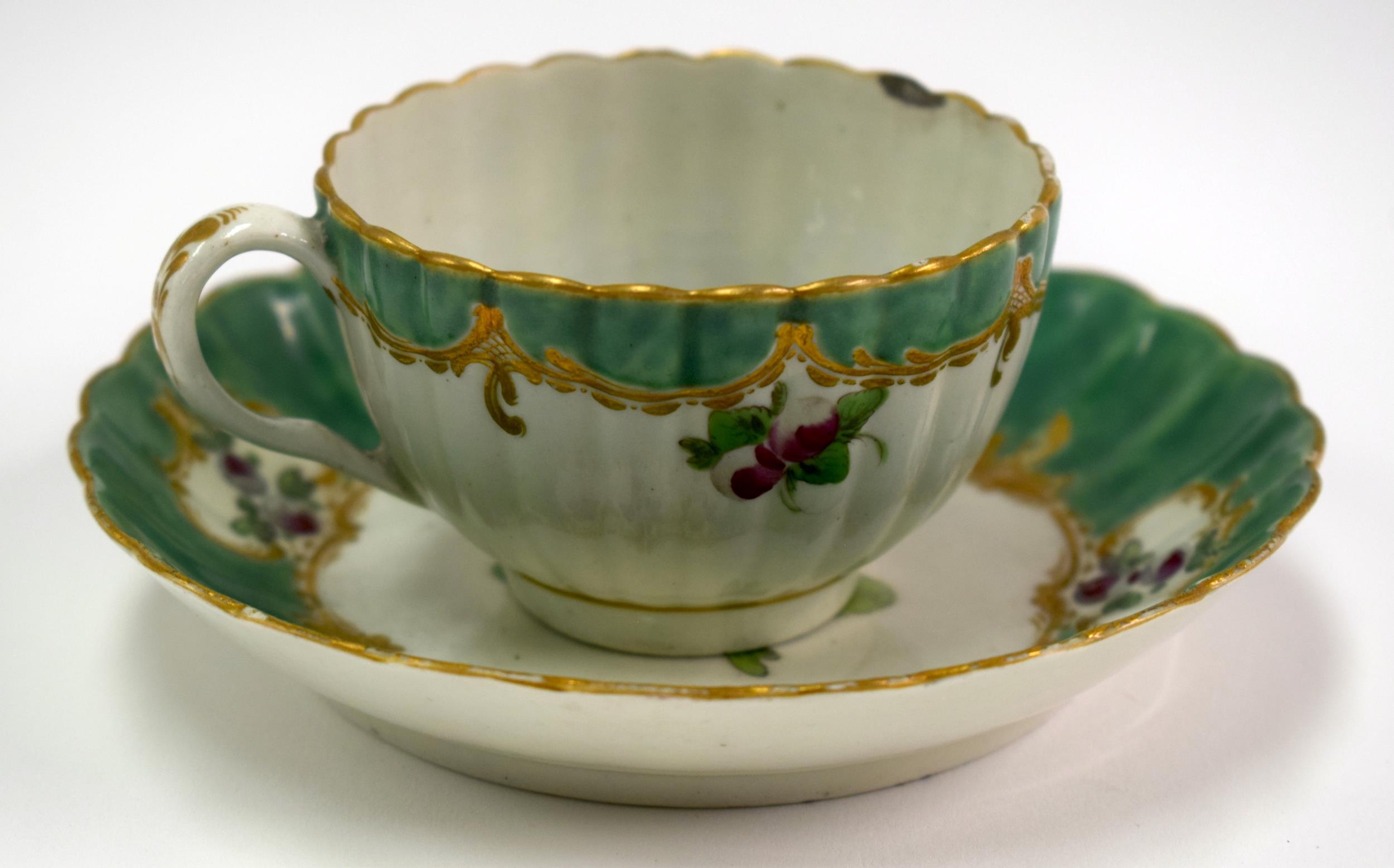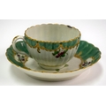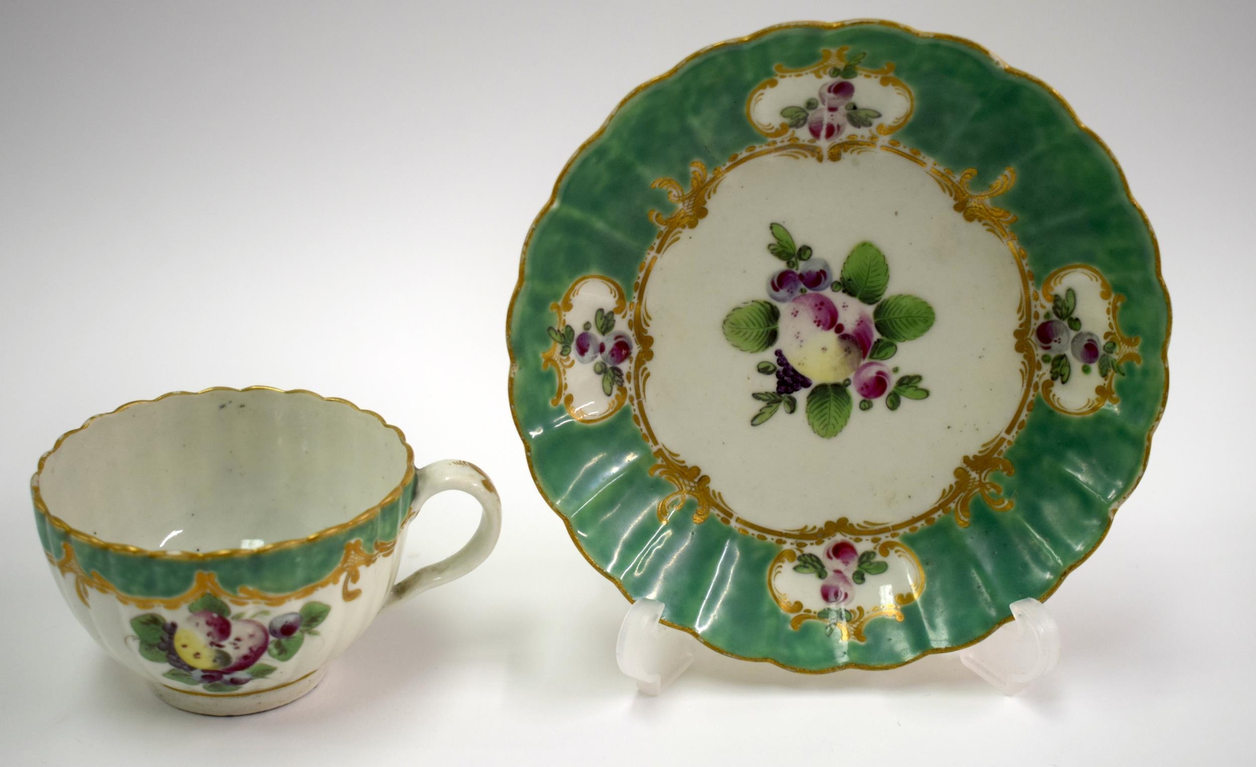 18th century Worcester rare Spotted Fruit Painter cup and saucer painted with fruit under green borders. Saucer 13 cm diameter. Cup 5cm high