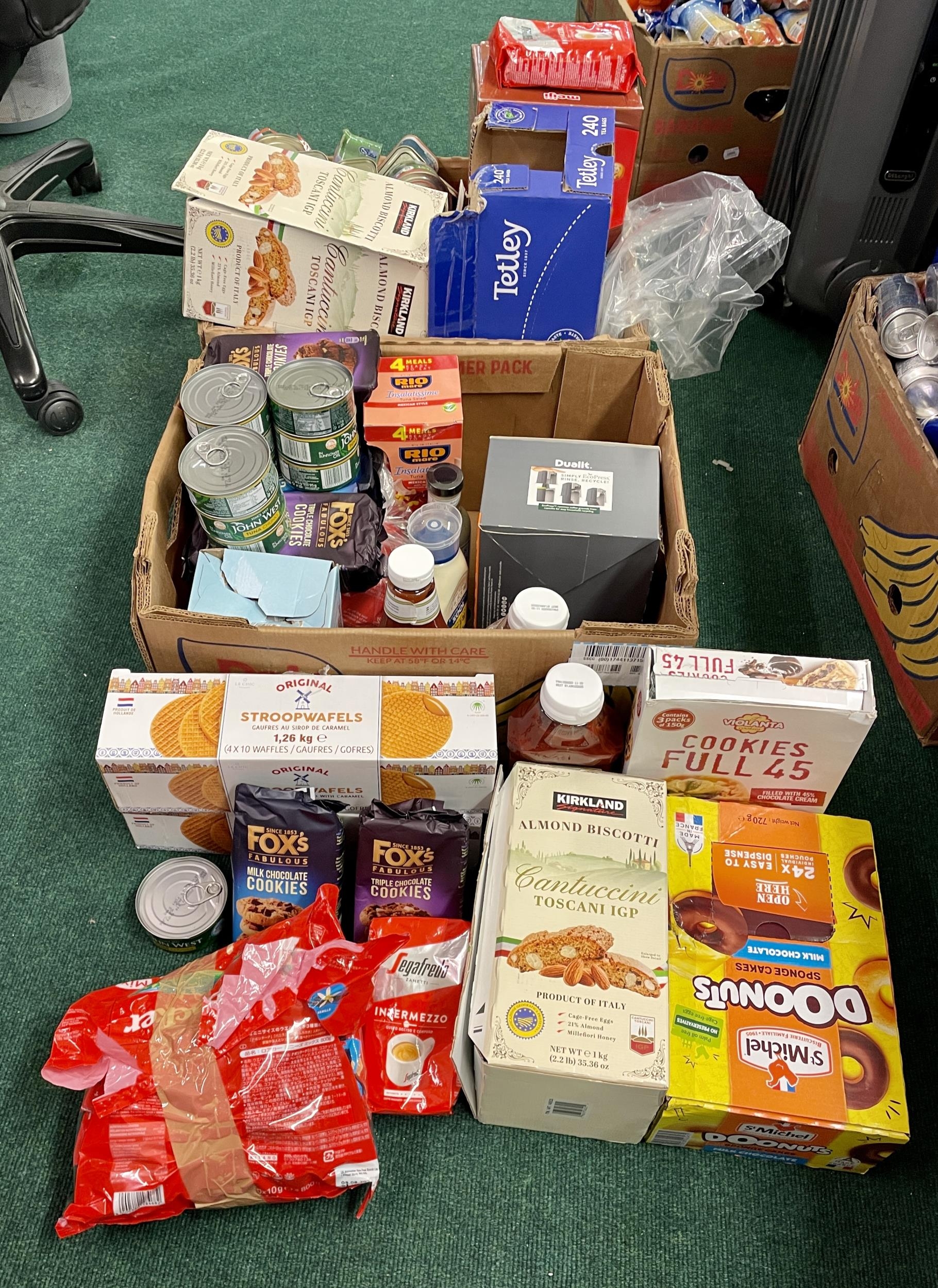 2X LARGE BOXES OF VARIOUS FOODSTUFFS INC. TINNED TOMATOES, TEA BAGS, POT NOODLES, CORNED BEEF, LARGE HEINZ KETCHUP, MAYONNAISE, COOKIES ETC.