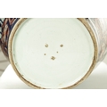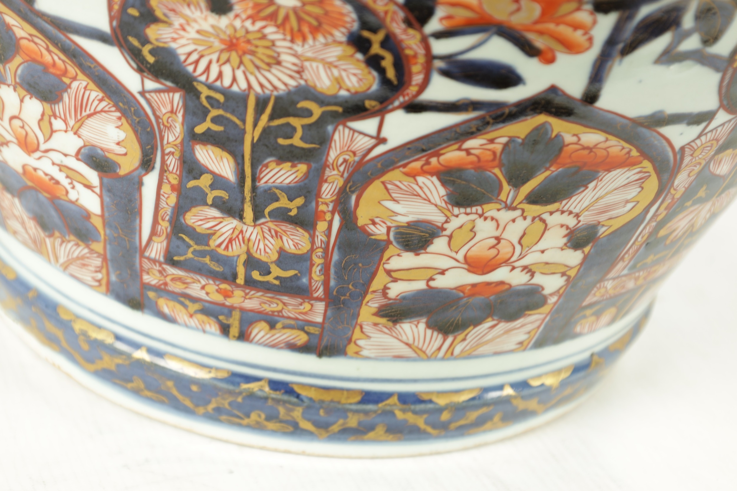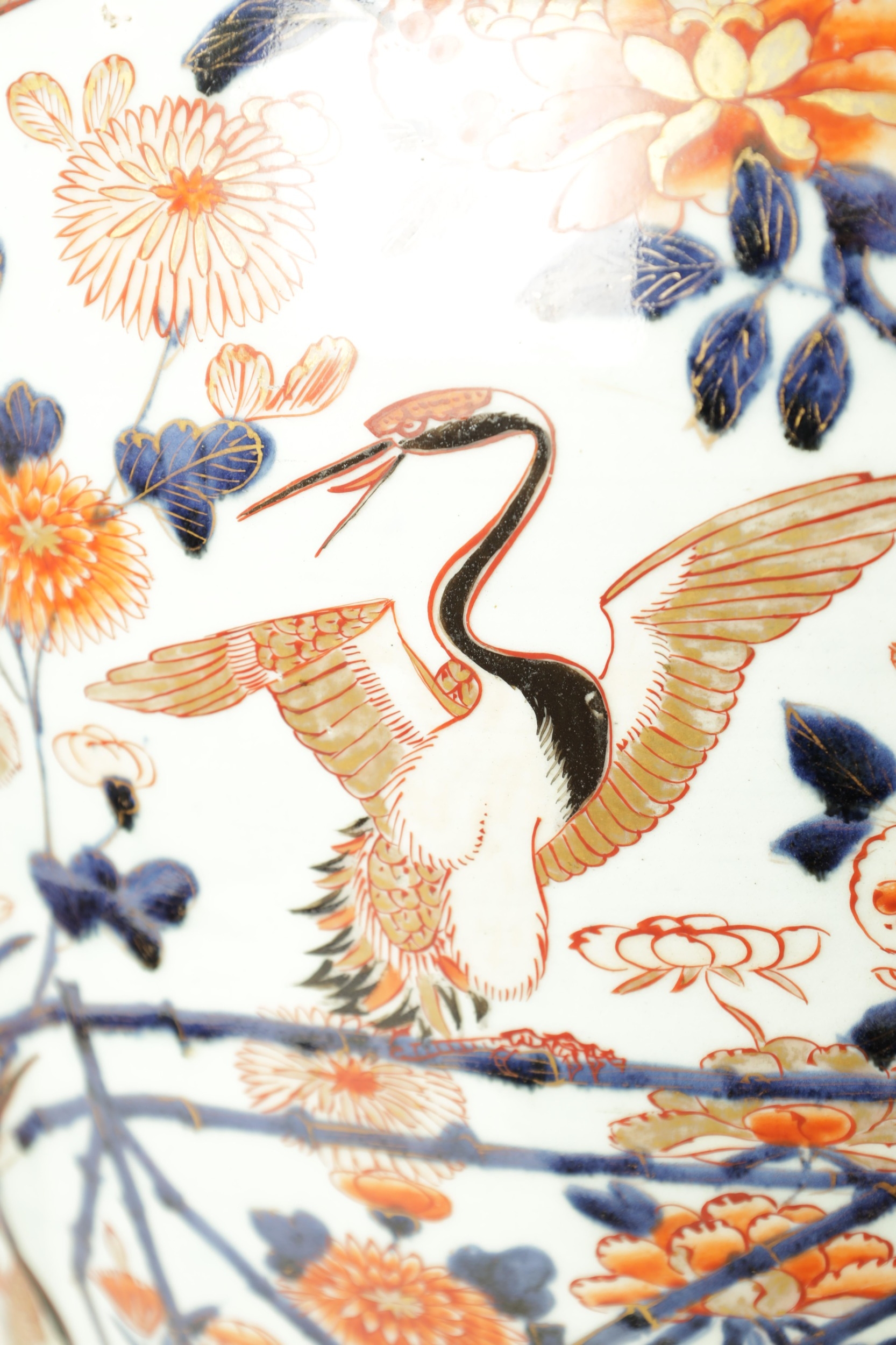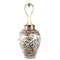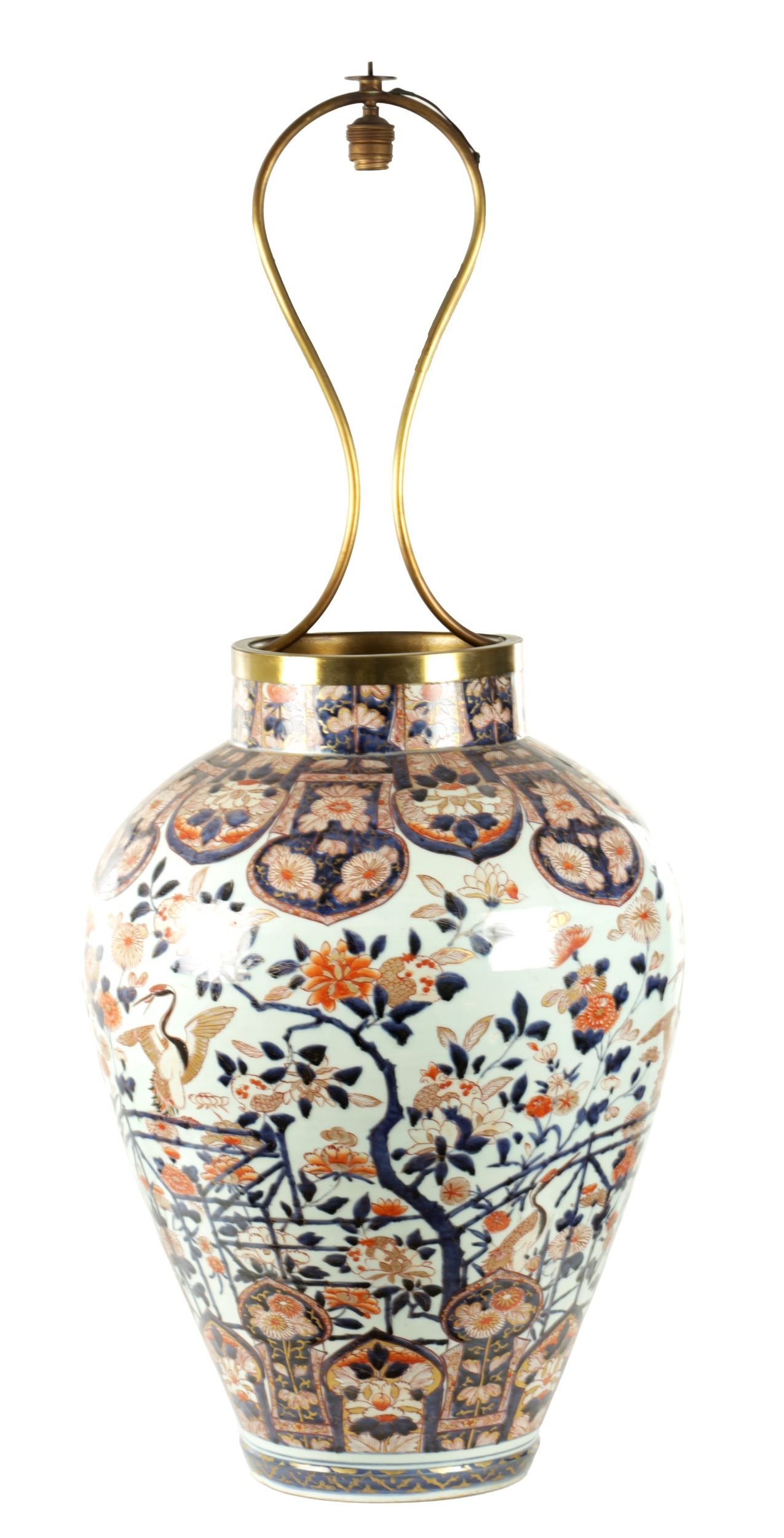 AN IMPRESSIVE 17TH/18TH CENTURY JAPANESE IMARI HALL VASE WITH LATER LIGHT FITMENT the shouldered ovoid body decorated in gilt highlighted polychrome colours with blooming chrysanthemum branchwork in fenced bamboo and mushroom-topped flowerhead panels to the foot embellished with cranes perched and in flight; the upper shoulder and neck with matching reversed panels to the foot - with later gilt brass light fitting. (65cm high plus fitment)