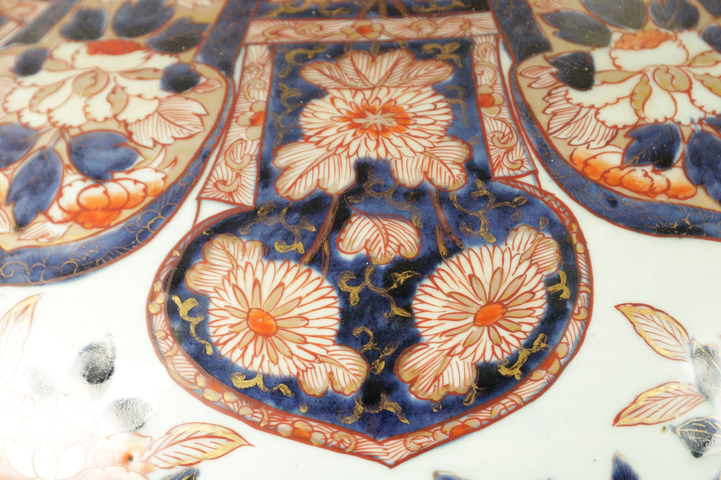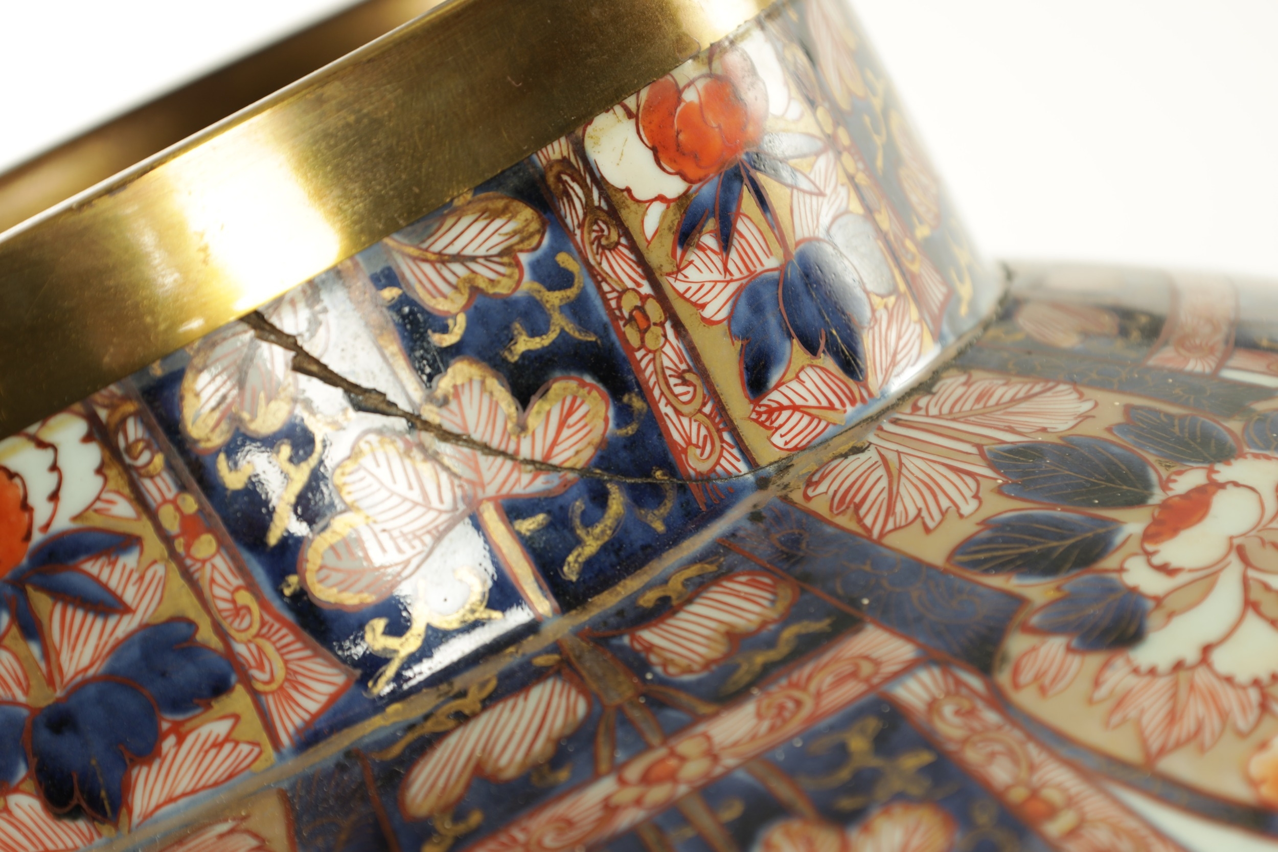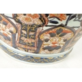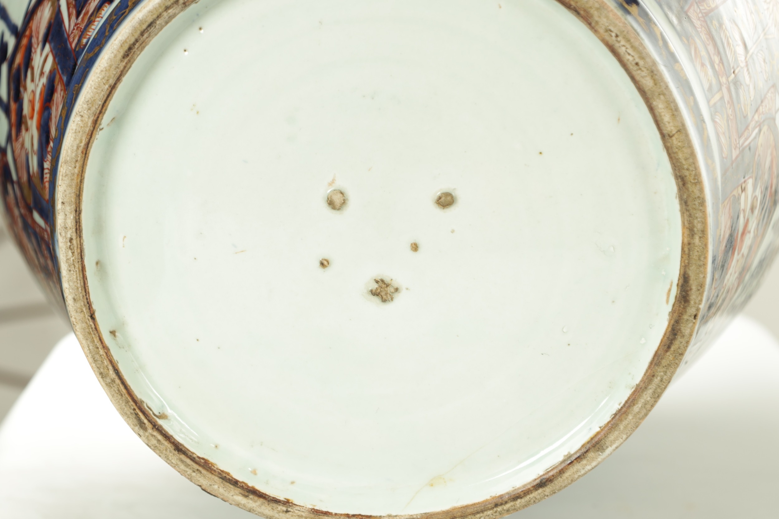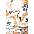AN IMPRESSIVE 17TH/18TH CENTURY JAPANESE IMARI HALL VASE WITH LATER LIGHT FITMENT the shouldered ovoid body decorated in gilt highlighted polychrome colours with blooming chrysanthemum branchwork in fenced bamboo and mushroom-topped flowerhead panels to the foot embellished with cranes perched and in flight; the upper shoulder and neck with matching reversed panels to the foot - with later gilt brass light fitting. (65cm high plus fitment)