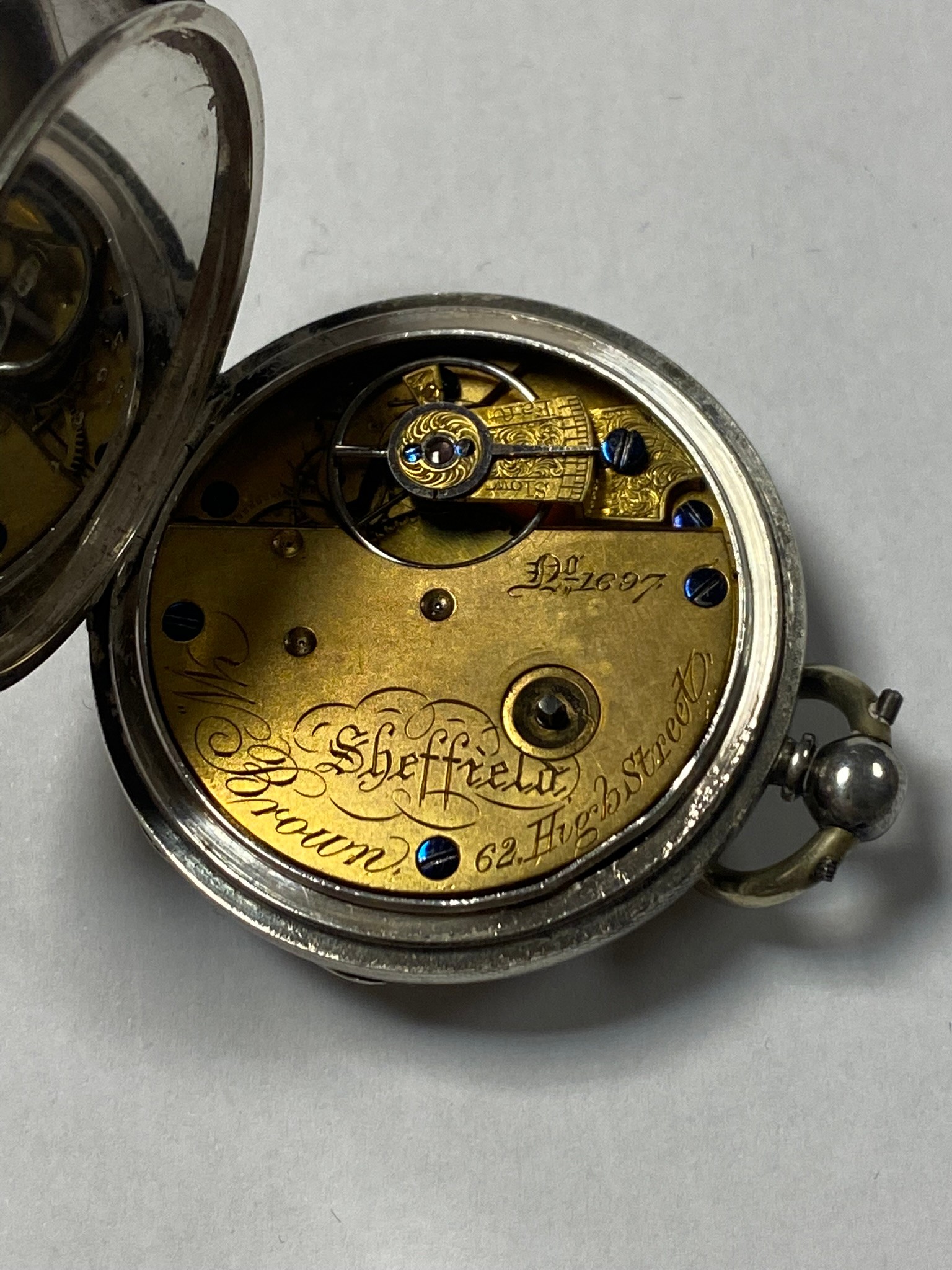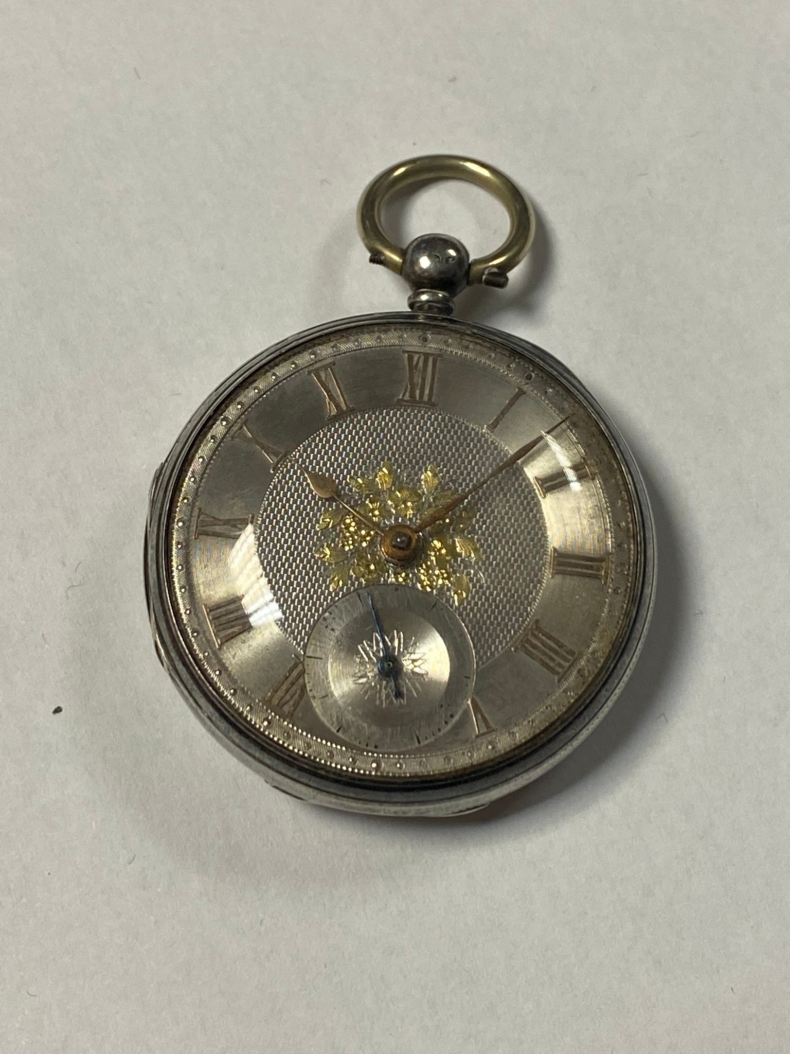 A silver cased open face key wind pocket watch, the silver dial with gilded Roman markers and subsidiary dial (lacking key) -