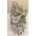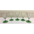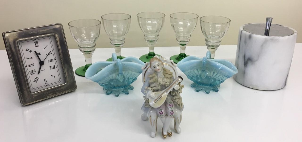 A mixed lot including five mid-century sherry glasses (green stemmed), a silver-plated battery clock, marble pot, a pair of turquoise glass posy baskets and a musician figurine (evidence of repair).