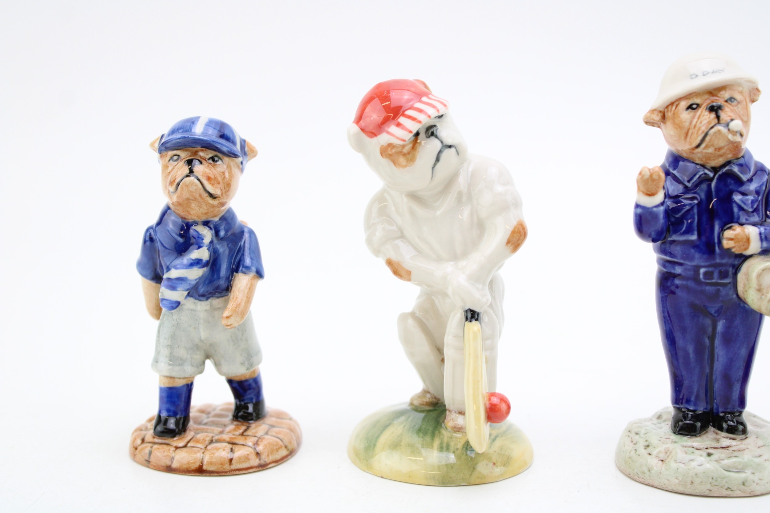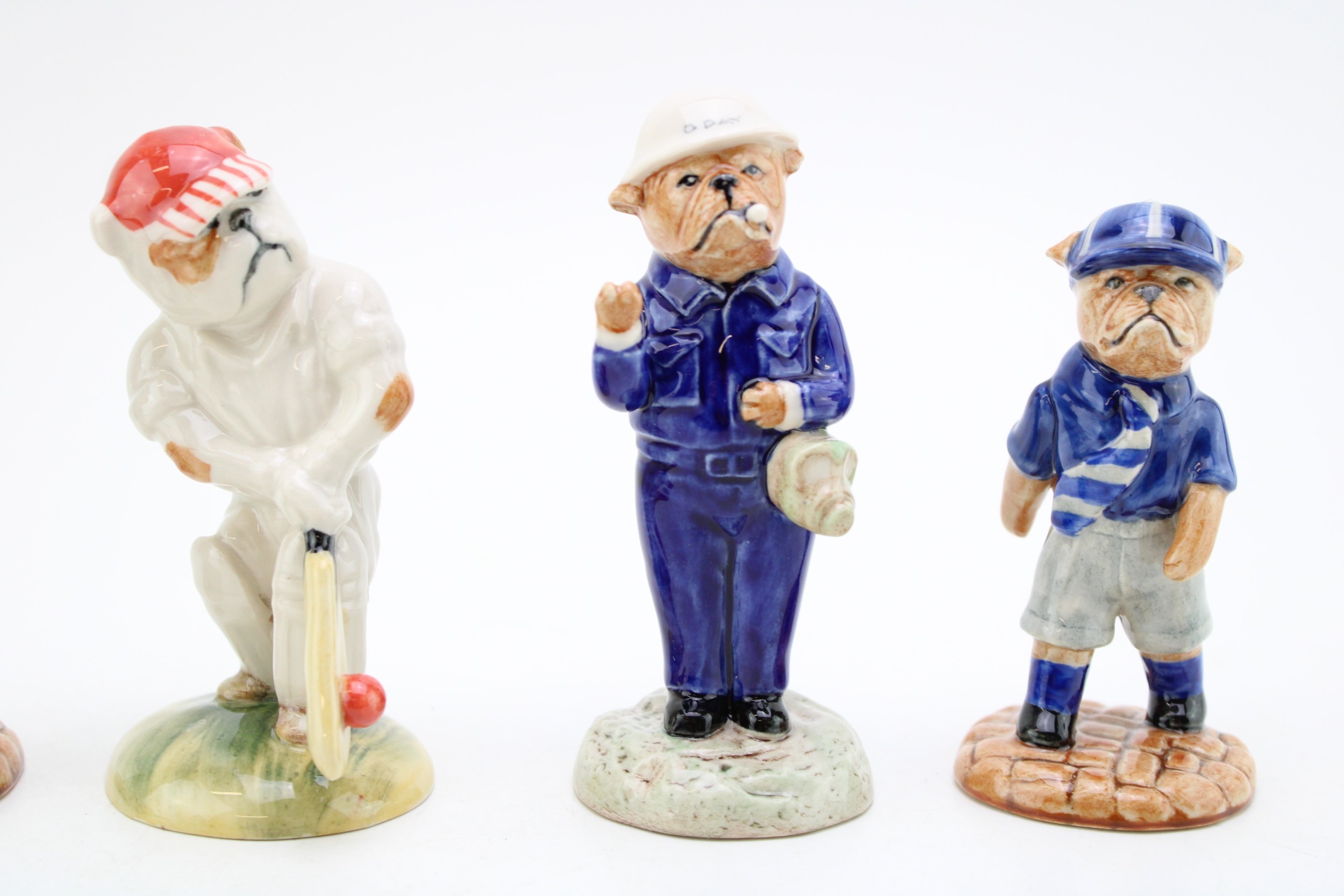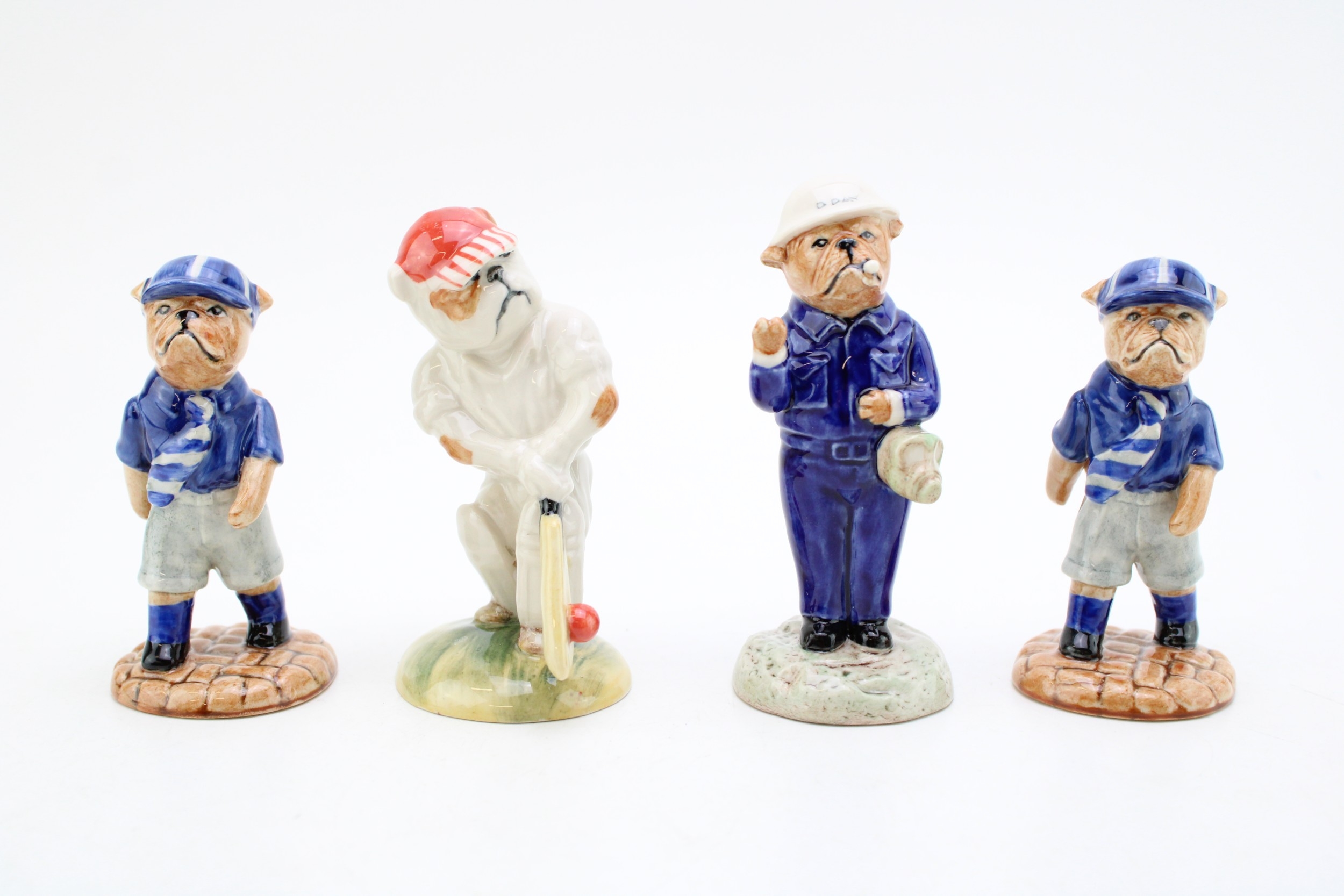 Peggy Davies bulldogs to include The Cricketer, D-Day Churchill and two Schoolboys (4), 11cm tall.