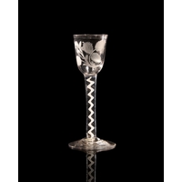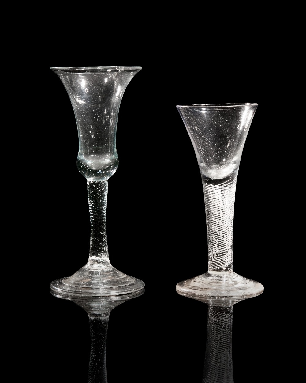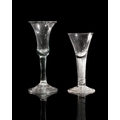 A Continental wine glass and an English cordial glass, c.1740-50, the wine glass with bell bowl on an incised twist stem and folded foot, 17cm high; the cordial glass with drawn funnel bowl on an air twist stem, 14.2cm high (2)ÿ