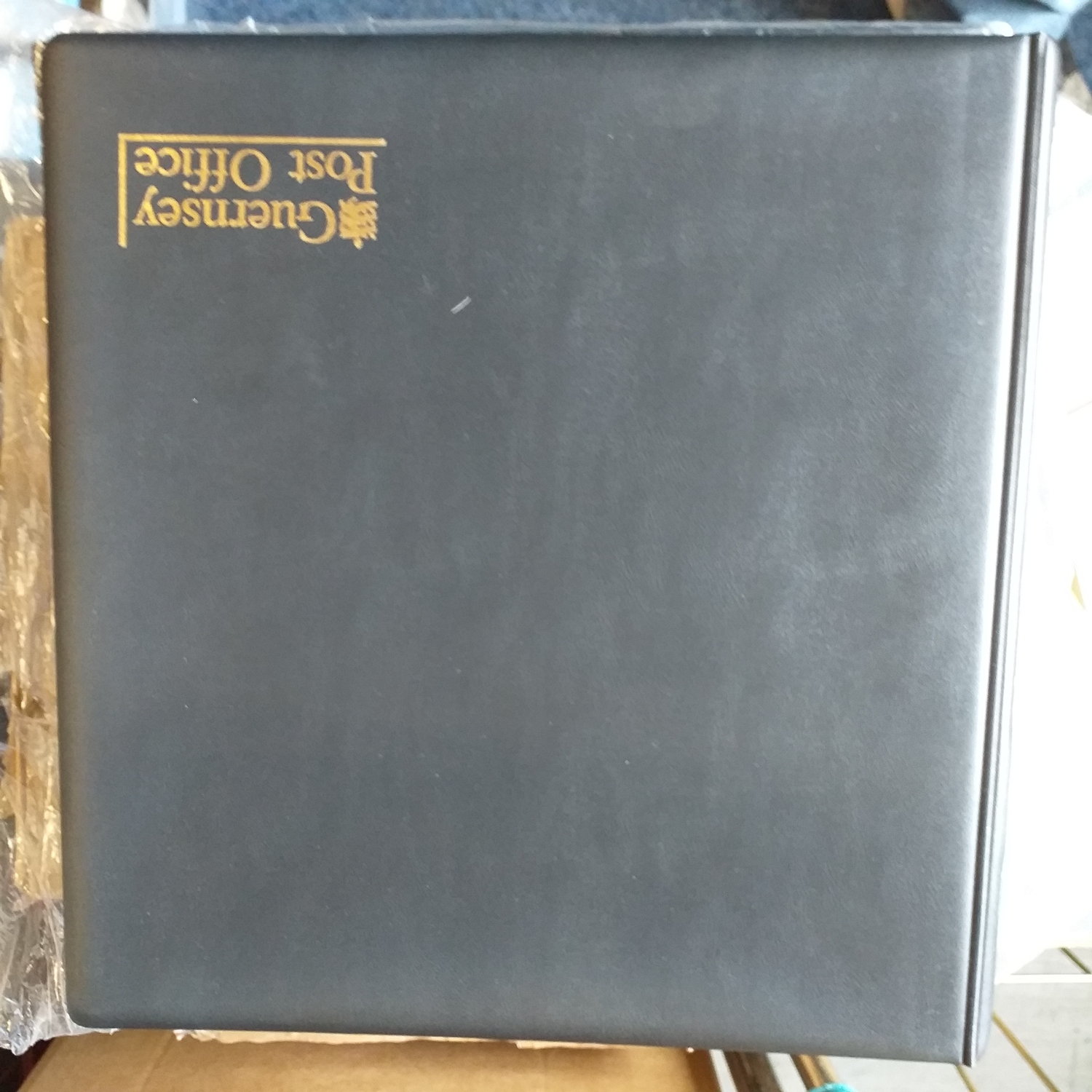 Cover Album. A high quality black Lindner ring binder with quality slip case with Guernsey Post Office logo on the front cover, contains 34 x 2 pocket and 5 x A4 sleaves with cream card backing, suitable for display material, covers and sheet. Retail cost is 200+
