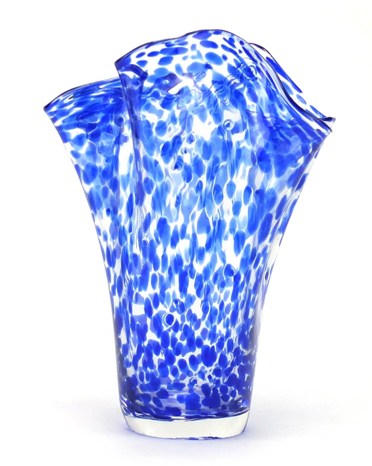 Large glass handkerchief vase with blue splatted decoration, 34cm high