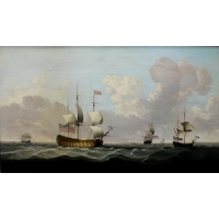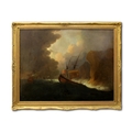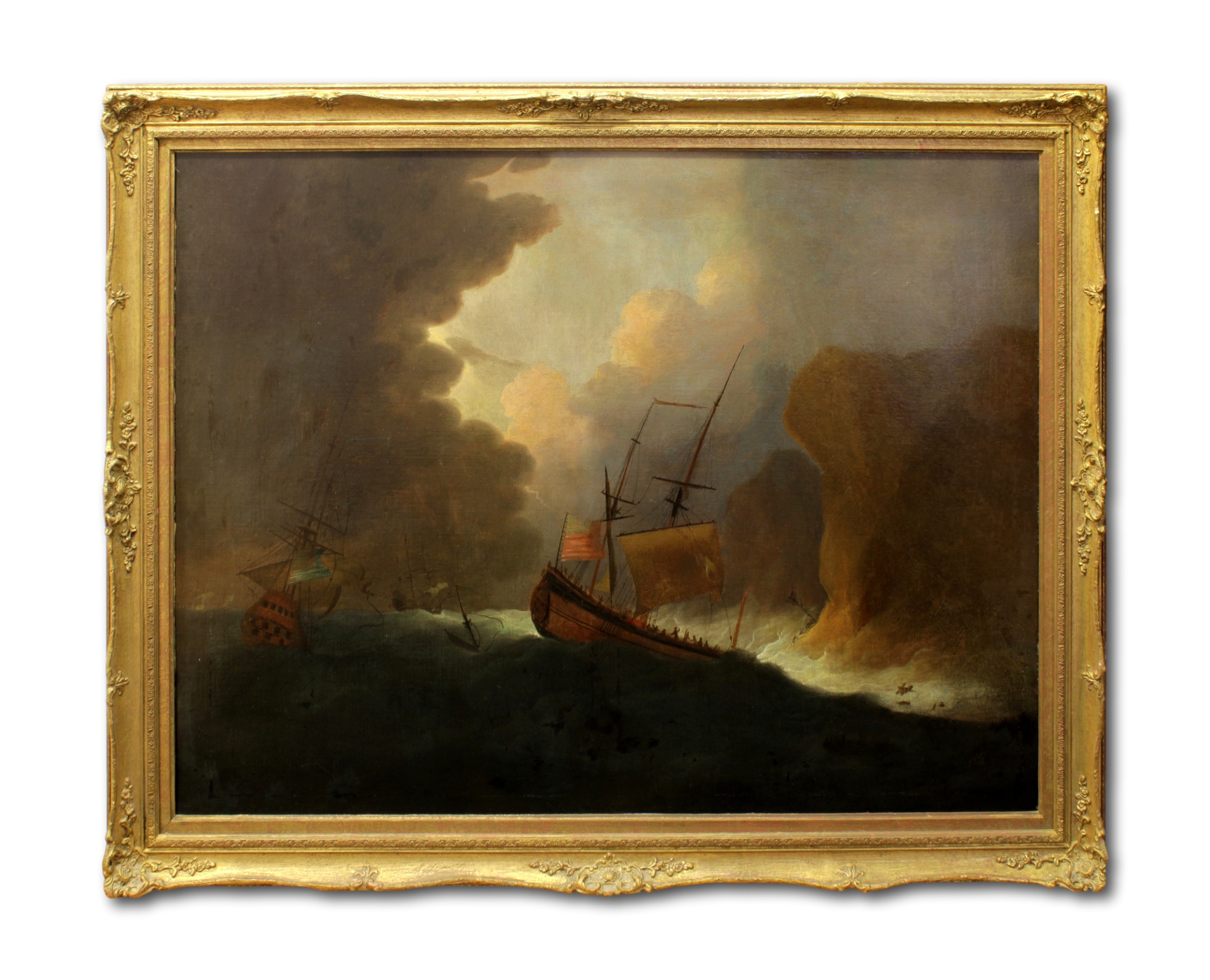 Peter Monamy (English, 1681-1749), English warships driven onto rocks in a storm, oil on canvas, signed "P Monamy" lower right, modern reproduction swept frame, 83.5 x 112cm.